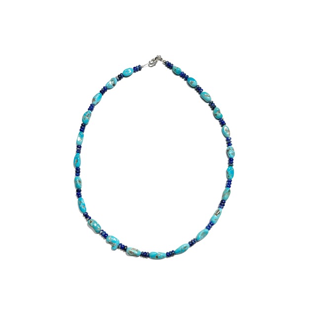現地のネイティブアメリカンが家族代々で手作りしているインディアンジュエリー。 こちらは天然のターコイズが使われている一本。 ターコイズ(トルコ石)は、青緑色の美しい宝石で、古くから「神が宿る石」「勇気と希望の石」「人と人をつなぐ石」など、様々な意味や象徴を持つとされています。 size : 44cm(留め具も含む) ◾️お客様ご都合での返品は一切受け付けていません。ご了承下さい。