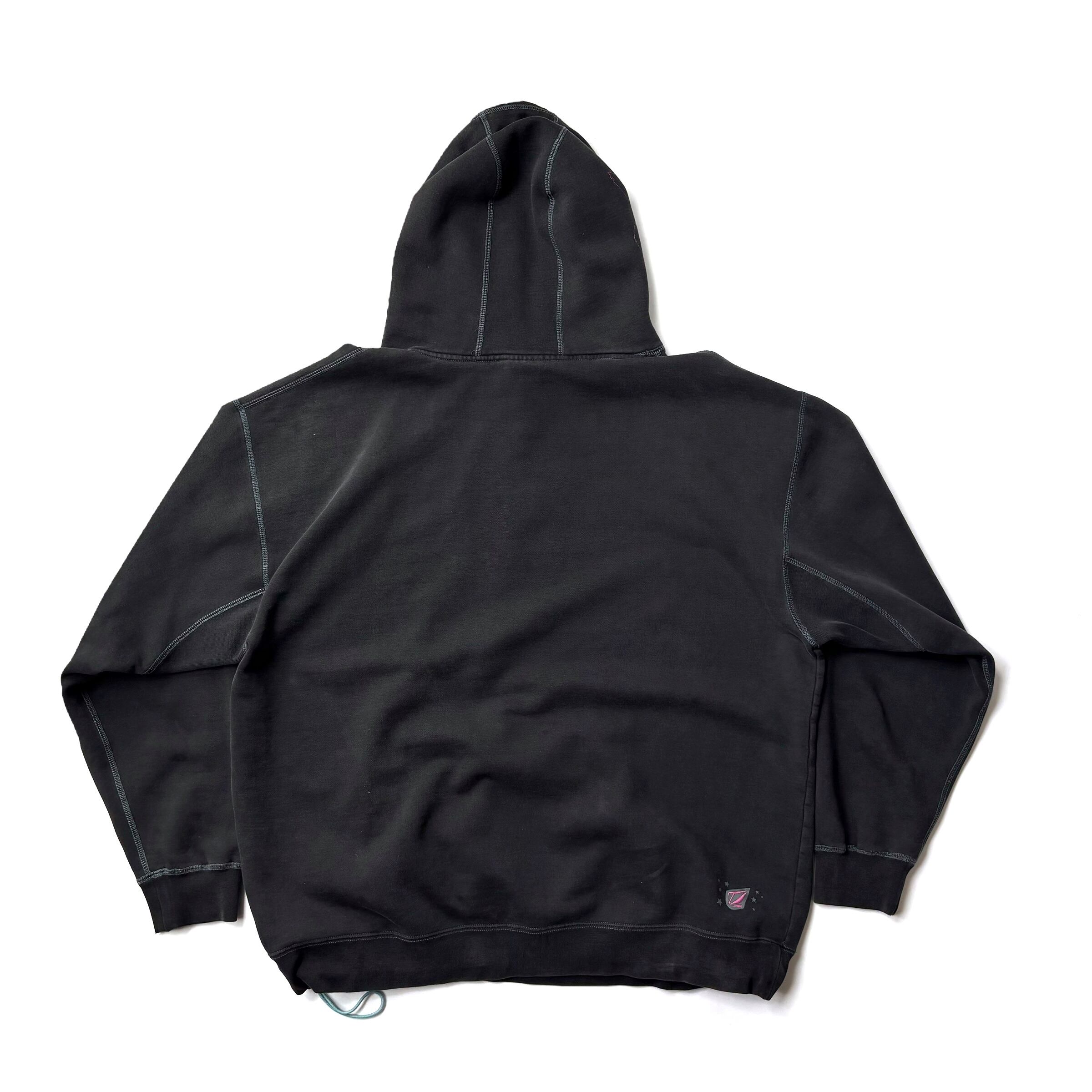 フロントの刺繍ロゴ、隠しポケット付きのフロントポケット、袖口、右腰に添えられた小さなロゴ、フードにも大きなロゴのプリントと挙げたらキリがないほどグッとくるポイントで溢れた最高のフーディ。いつものバギーデニムにこれで完璧です。