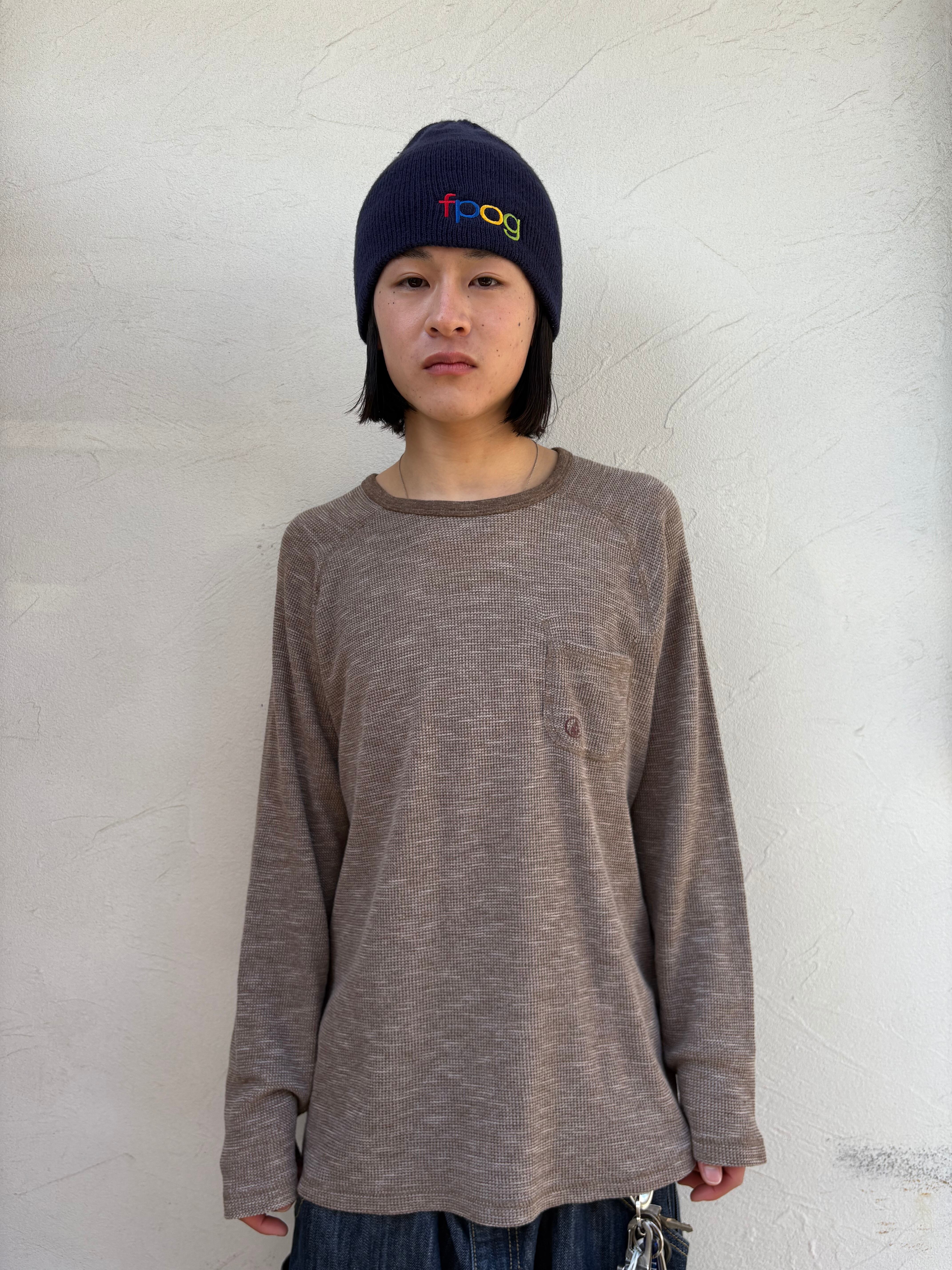 サーマル大好き人間の我々ですが、最近は薄い生地間のものが特に好きで着ている時にごわつかないのと一枚で来た時の気持ちよさが半端ないんです。こちらは合わせやすい色味で使いやすさも抜群です。