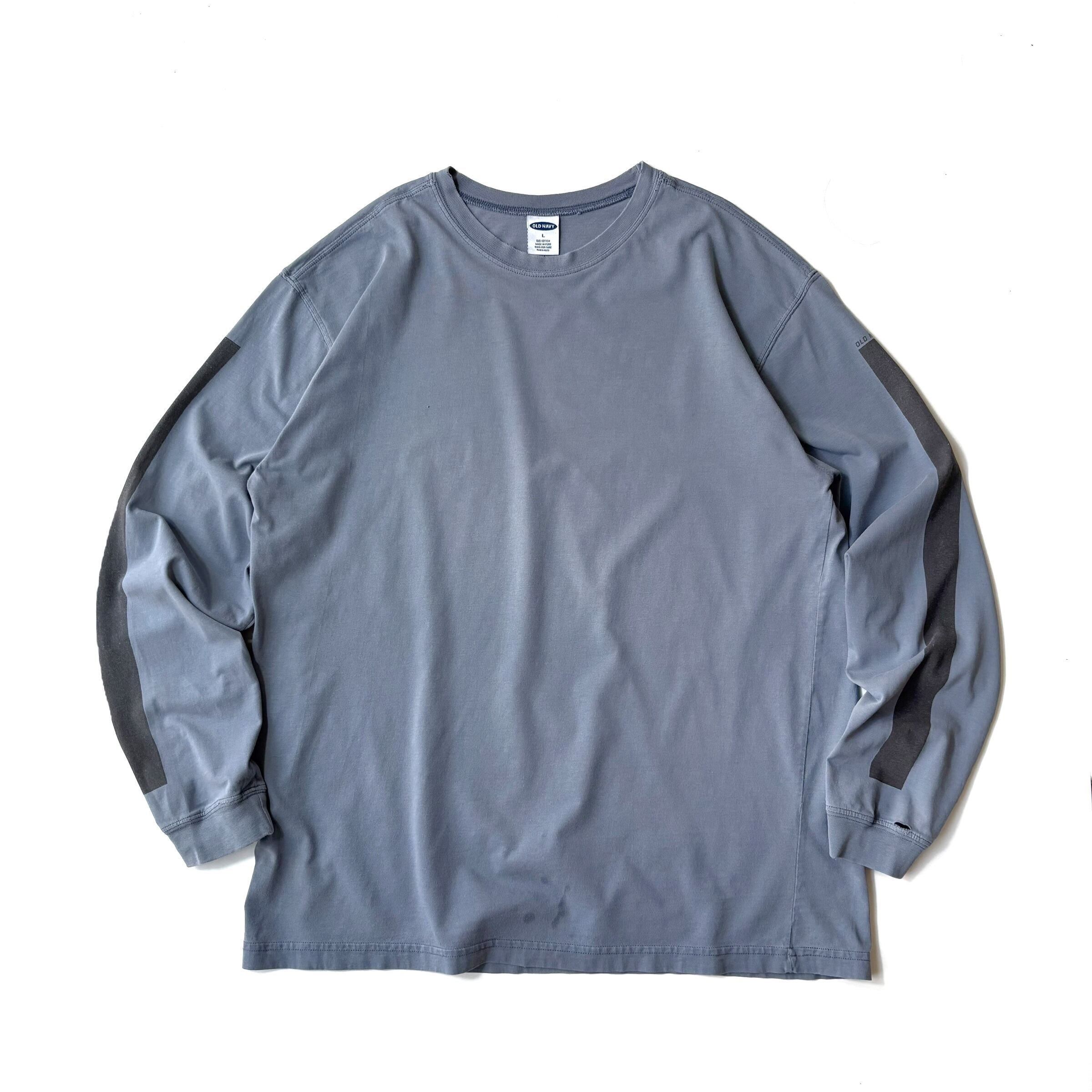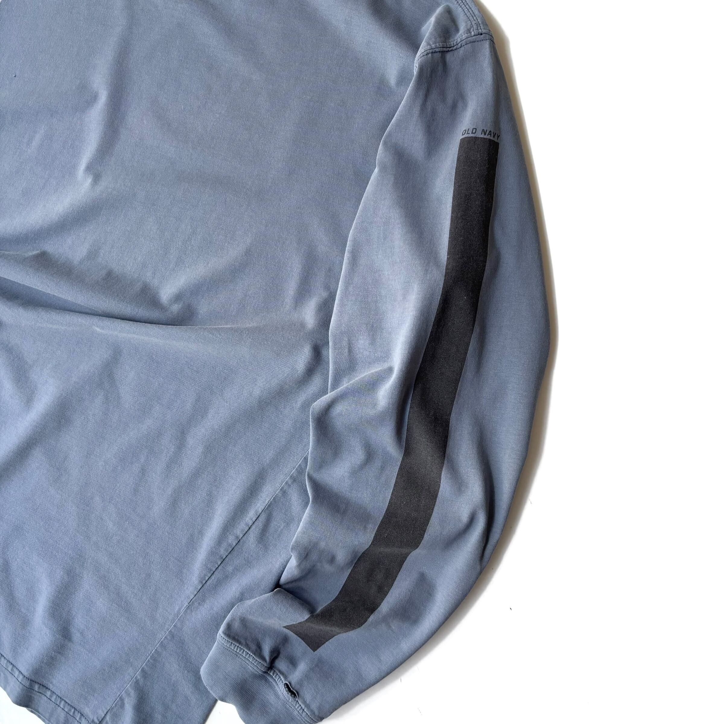 一見無地のロンTですが袖に長方形のプリント、その上部にはしっかりOLDNAVYの文字、ボディの色味も1番良いブルーでサイズ感も完璧、もし自分で持ってたら一枚でも重ね着でも使えちゃうんで週4で着るでしょう。