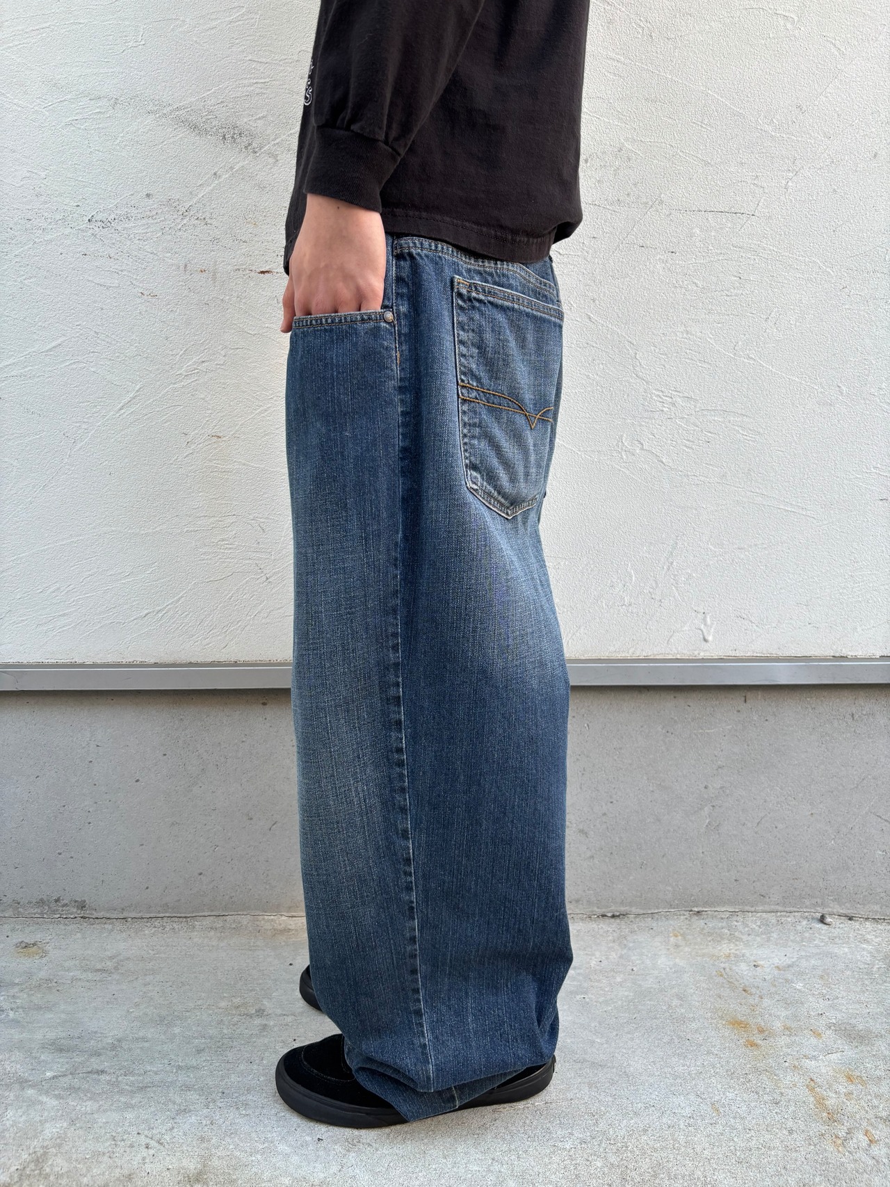 32というしっかりデカくて裾に溜められるサイズ感、脅威の腿幅40cmでインディゴの色落ちの雰囲気も抜群、デニムもいい感じに履き込まれていて完璧なバギーシルエット。そう何本も取り扱える物ではないので要チェックです。