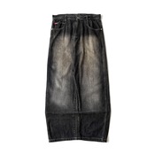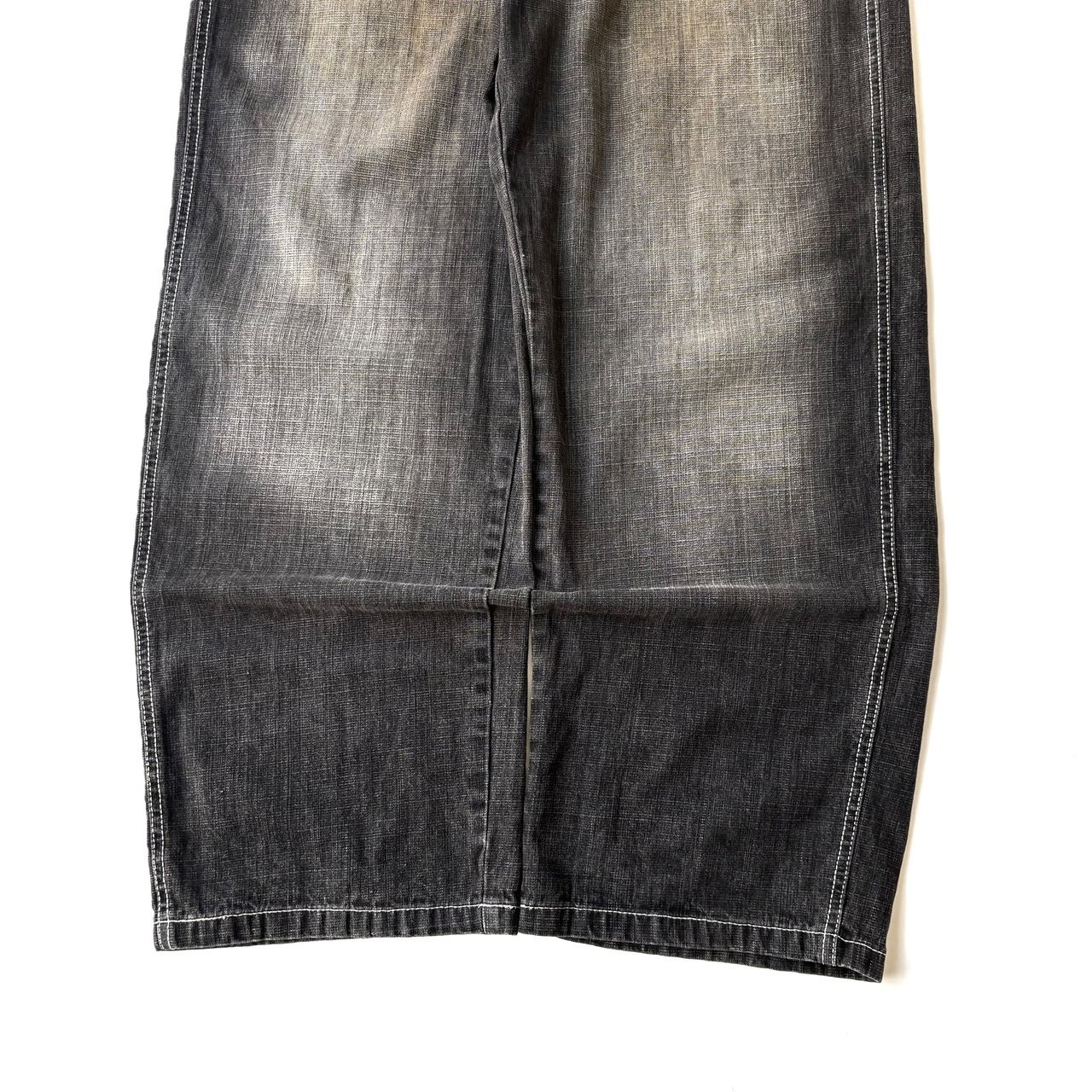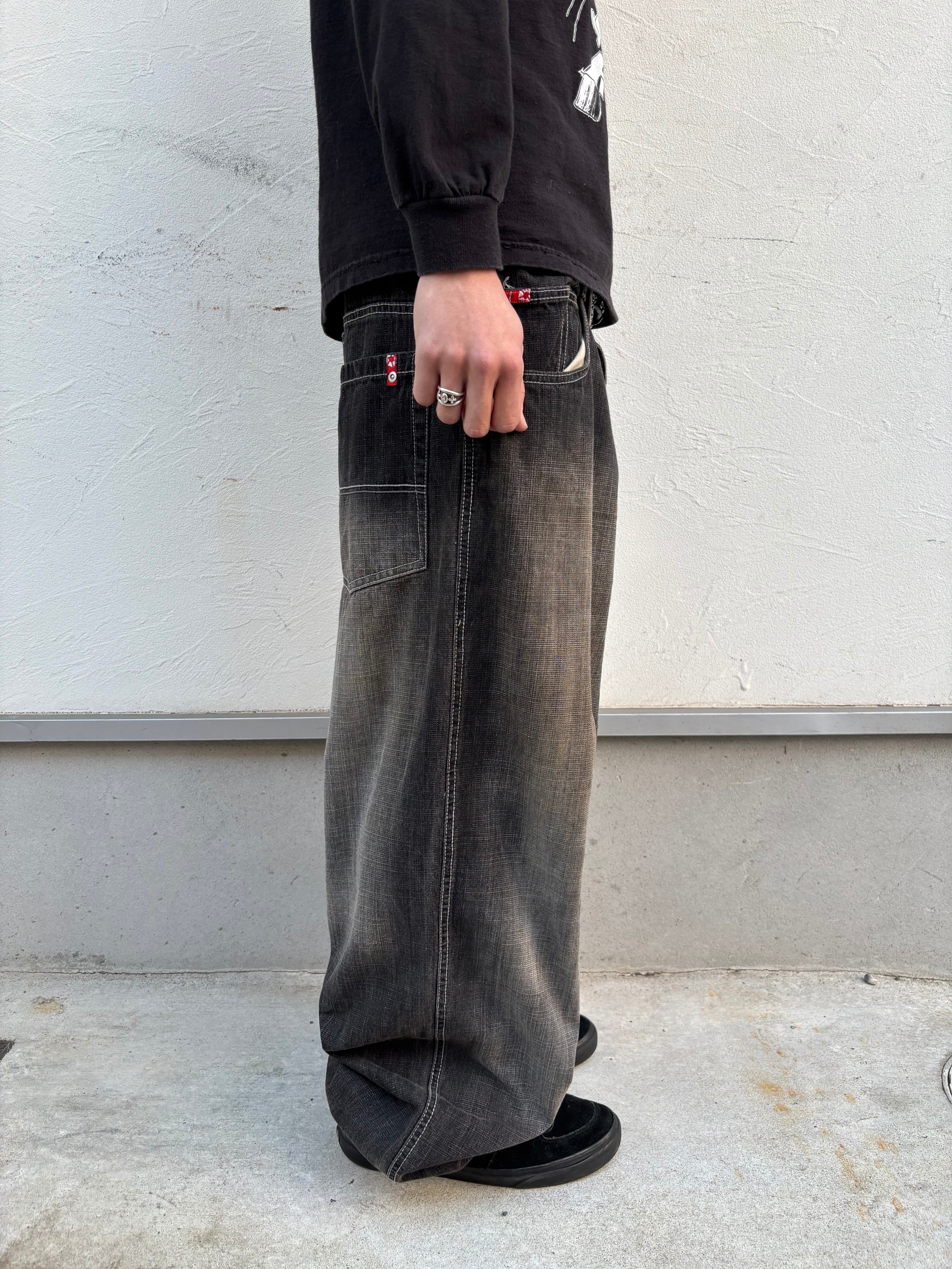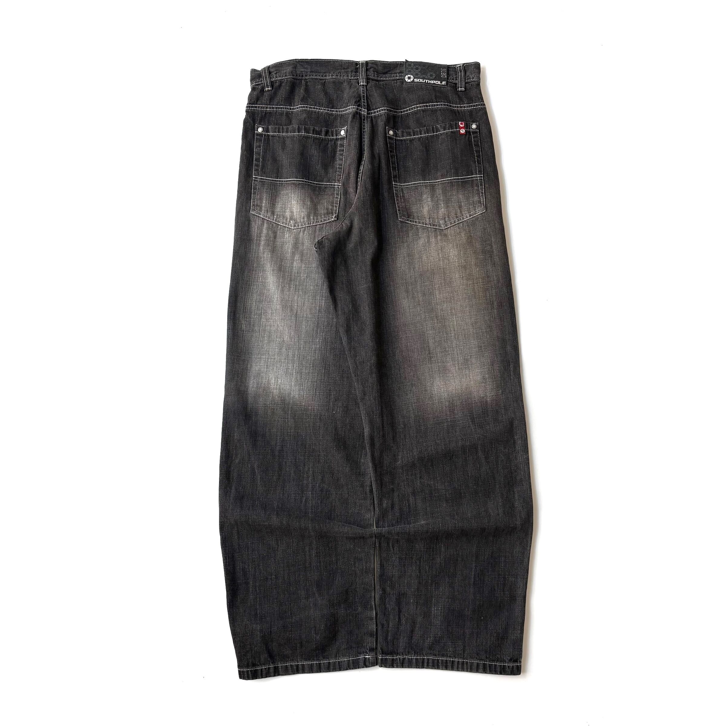 サウスポールのこのシンプルなバギーデニムのタイプはレングス長めで股上も深く、腿幅もしっかりあってそのわりに裾幅が控えめなので足元にガッツリ溜まって綺麗なワイドバギーシルエットになるので最高に好きです。色味もいい落ち具合のブラックで合わせやすさも抜群です。