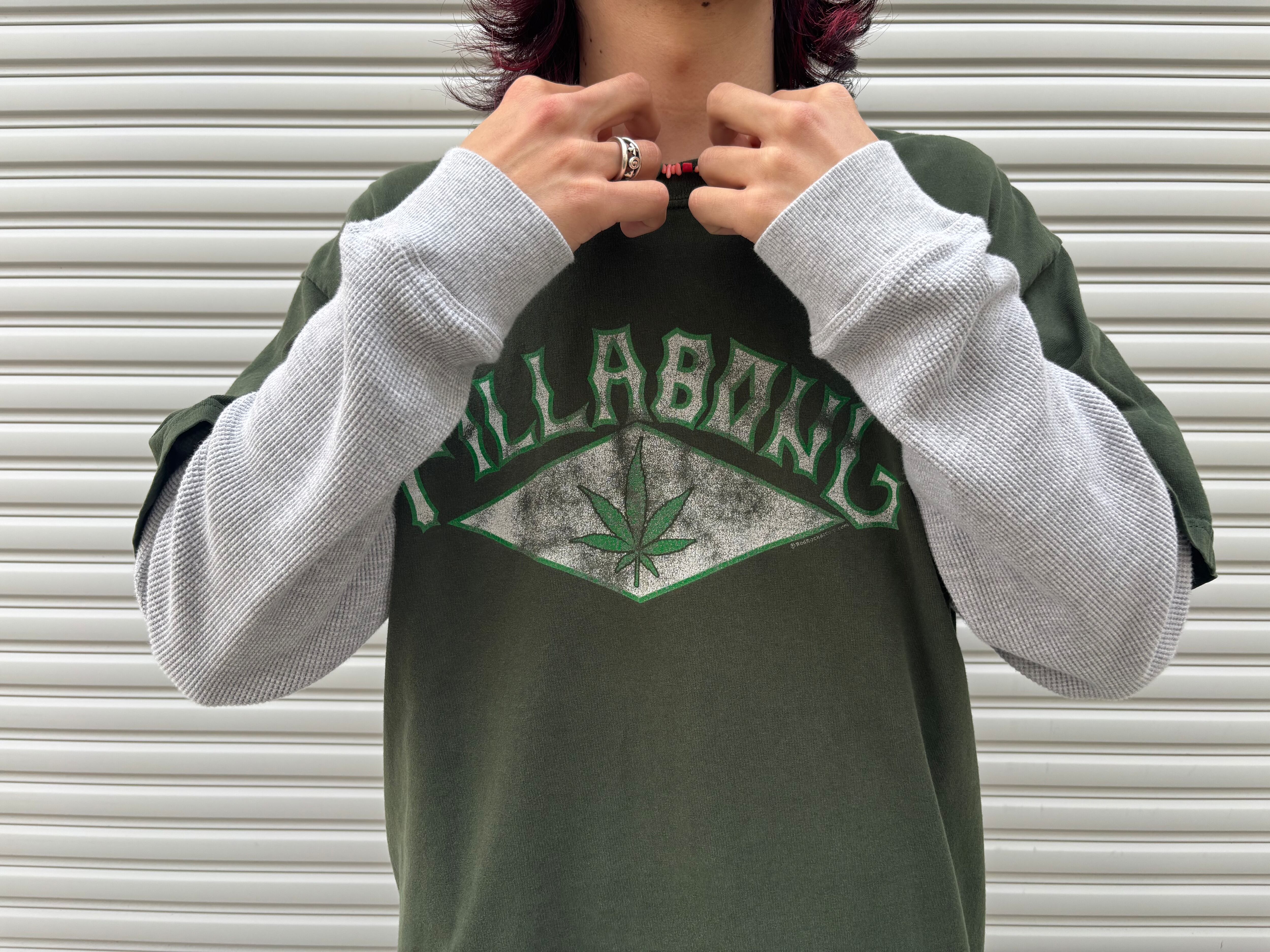 BILLABONGの感じで危ない草が描かれている最高にイケてるパロディTee。プリントの掠れも雰囲気とマッチしていてクールです。サイズ感もゆったり着られるいいサイズでバギーパンツとの相性最高です。