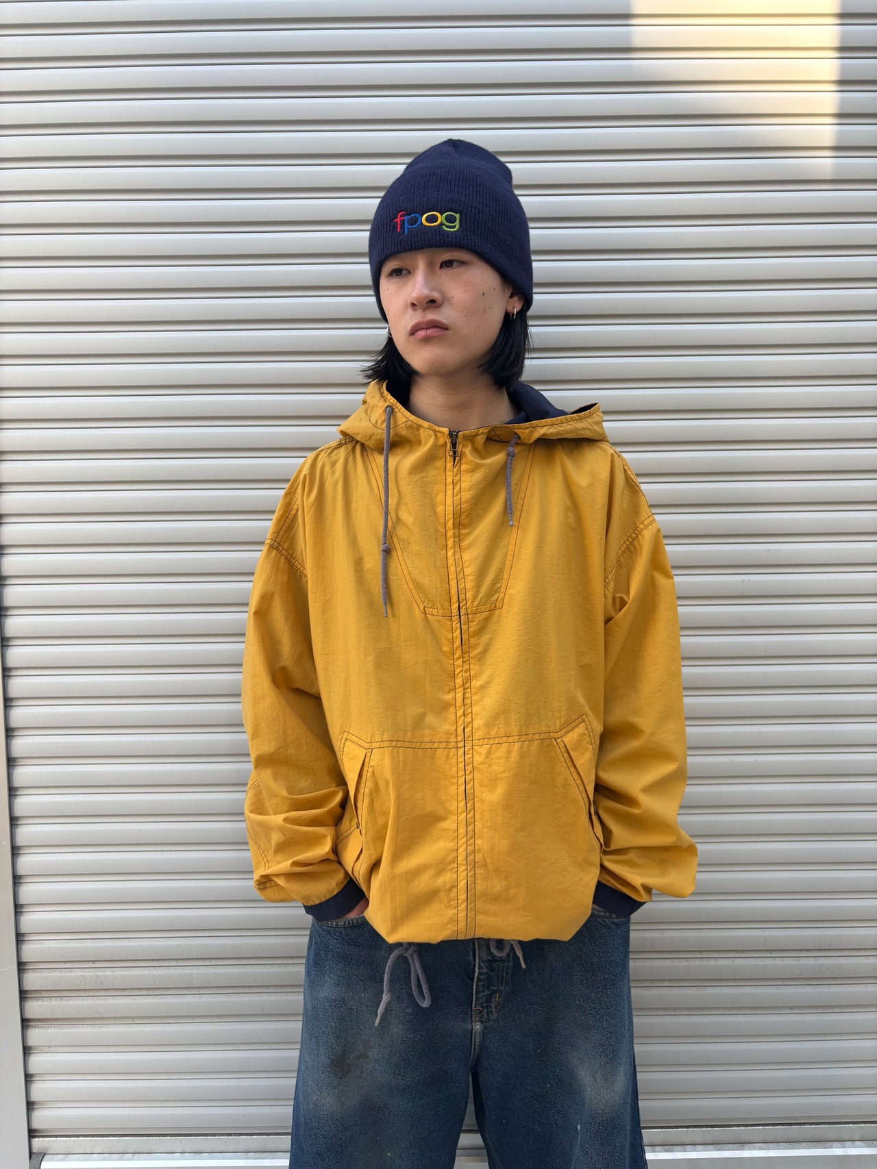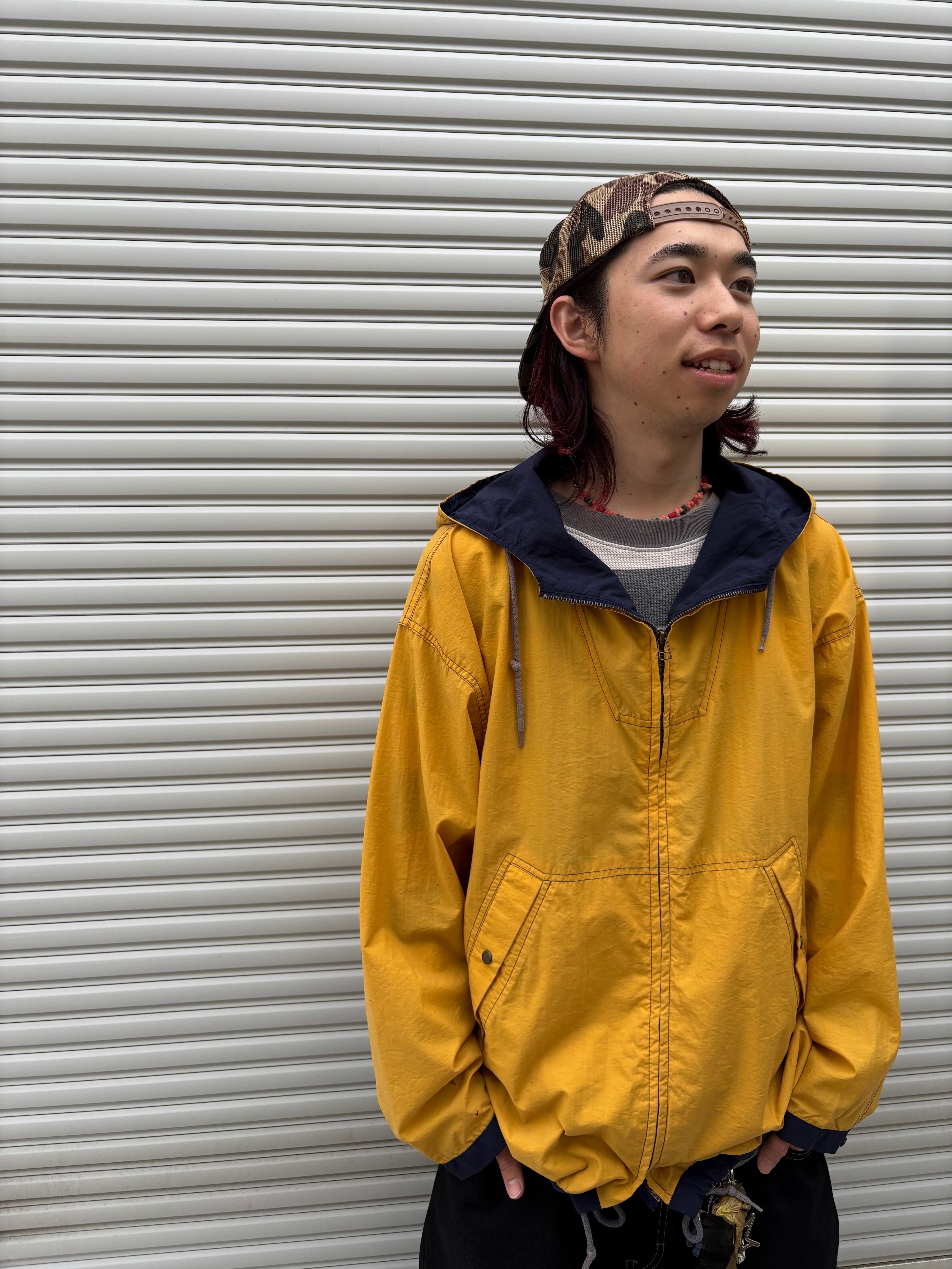 デカタグ期のGAPらしい気持ちのいいイエロー×ネイビーの色使い、サイズ感もゆったりボックスシルエットで素材感もシャリっとしたナイロンなので春先にちょうど良すぎる作り。袖先や裾がネイビーになっているのもオシャレでデニムとの相性がすこぶる良さそうです。