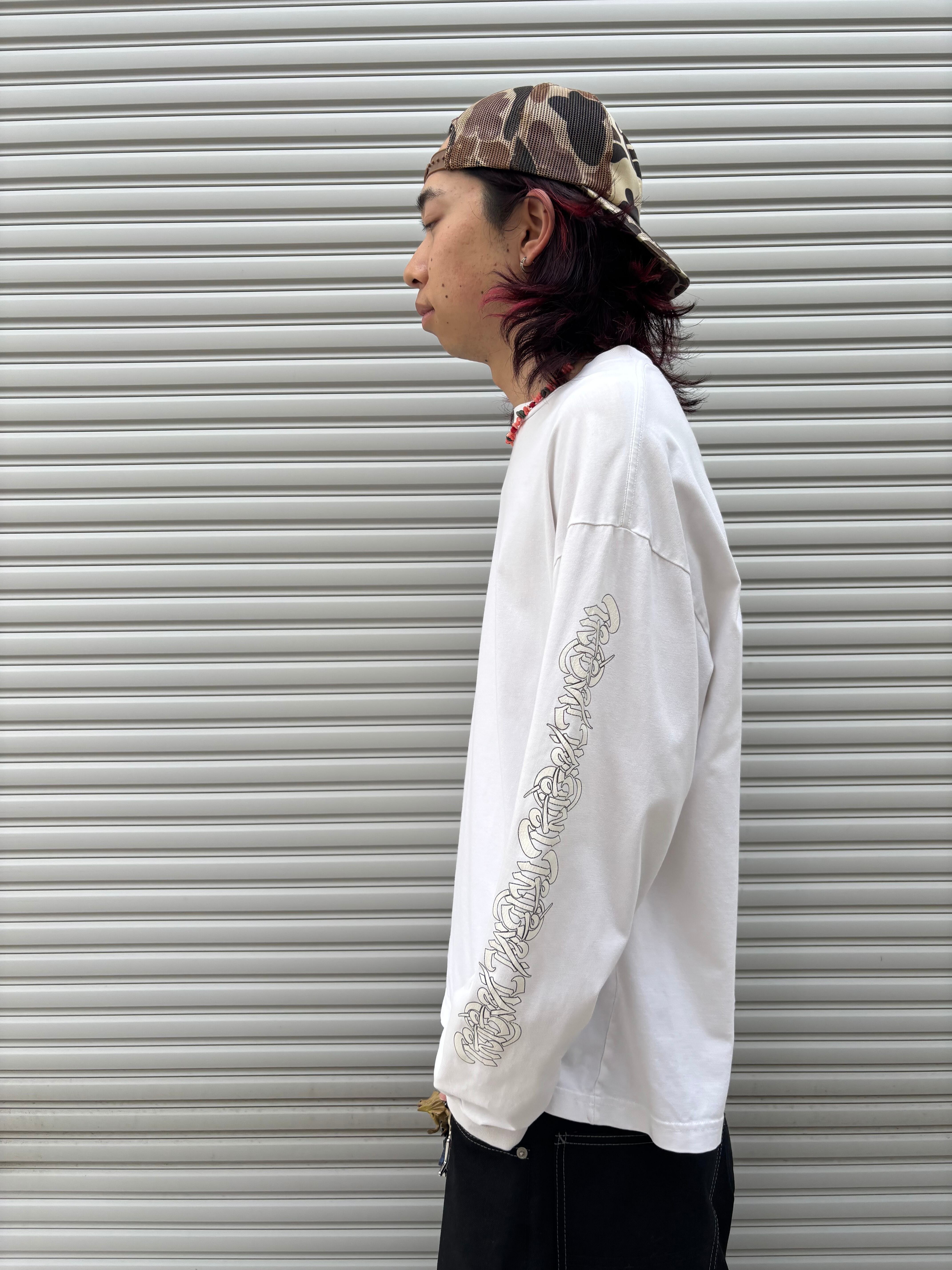 フロントにはあえてのロゴなし、その代わりに袖にホワイトのトライバル調のTRIBALロゴがびっしりとプリントされたクールかつおしゃれすぎる一枚。背面にも小さなロゴがあり、サイズ感は超が付くほどの短丈ボックスシルエット。一枚でもレイヤードでも即クローゼットの一軍です。