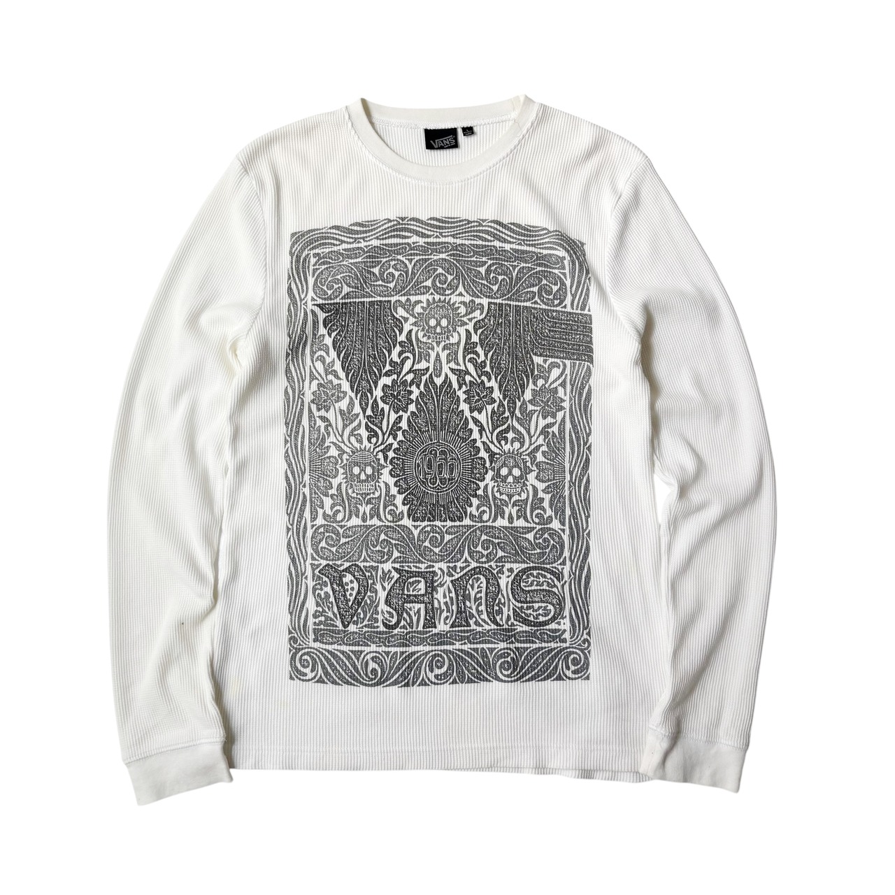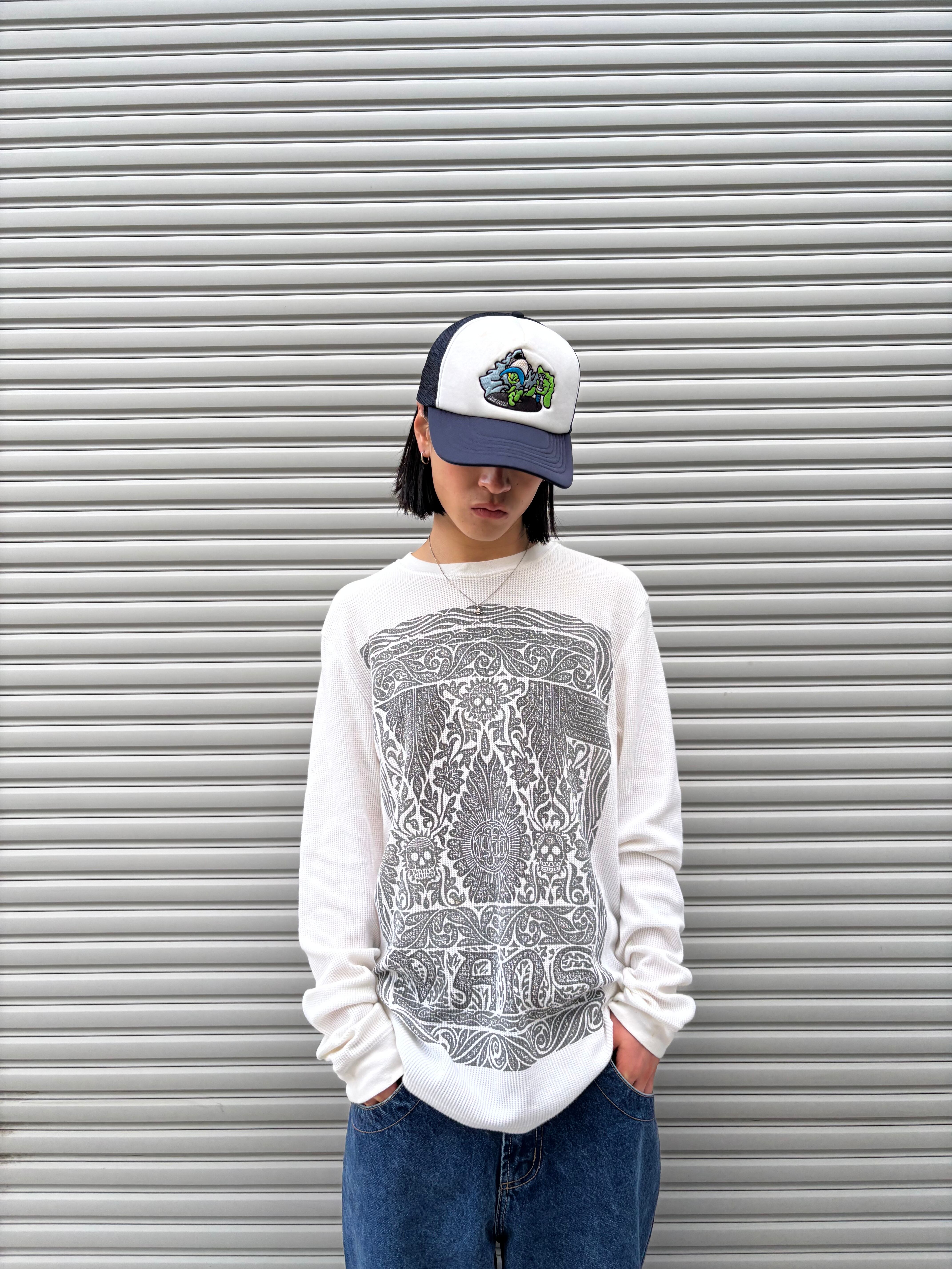 民族っぽい柄が描かれた2000年代のVANSのサーマル。ホワイトベースのボディにブラックの大きなプリントがいいアクセントになっていて非常にクールです。一枚ではもちろん、フーディーからチラ見せ、サイズ感も良いのでTeeの下で白サーマルとしても活躍します。