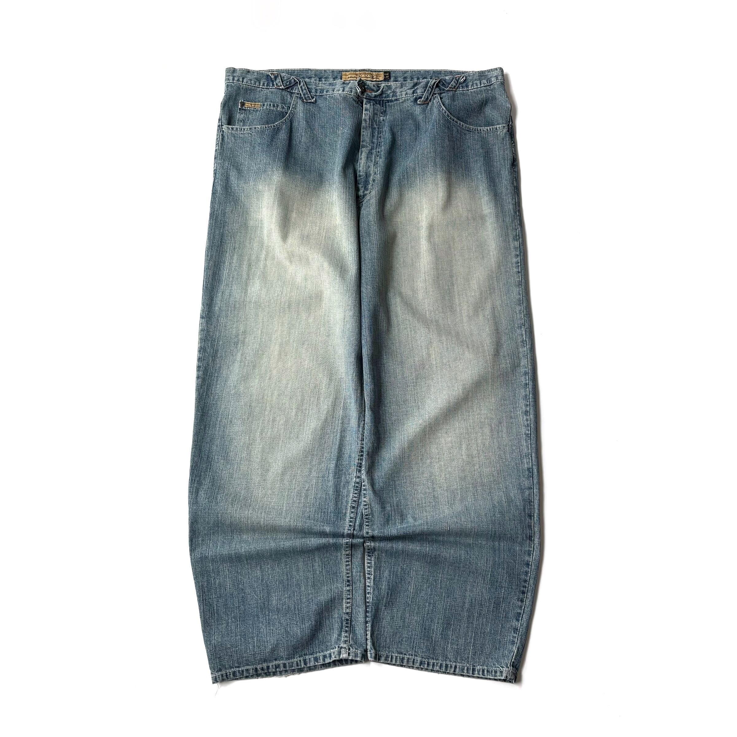 W46×L33の表記通り、スーパーワイドかつ長めのレングスで恐ろしい程のバギーシルエットになる化け物デニム。色落ちもちょうどよく、ループやバックポケットの刺繍などしっかりツラも良くやり過ぎてないのでスワッグ過ぎず履けそうです。