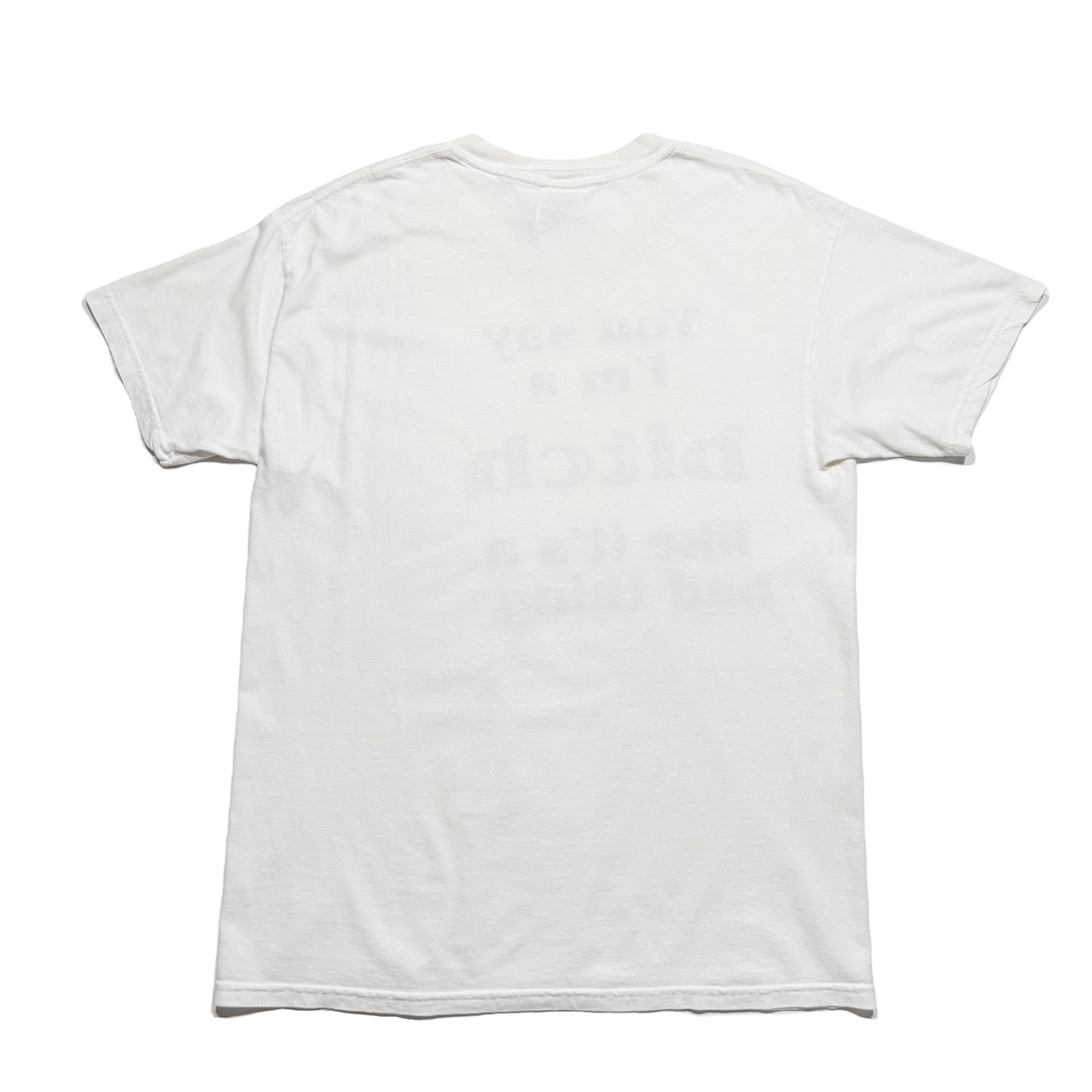 お前はビッチであることがダメかのように俺をビッチだと言う、という最強のメッセージがいい大きさのかついいフォントで描かれたTee。せっかくメッセージTee着るならこのくらい強気なモノを着たいです。ちなみにサイズ感も最高です。