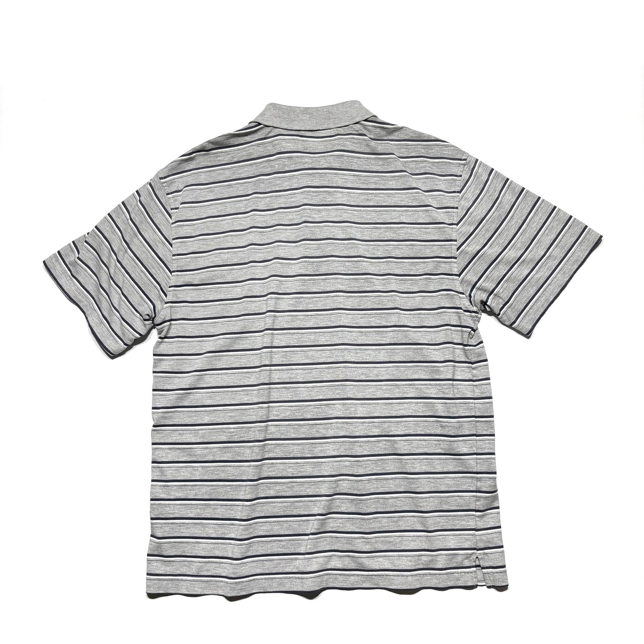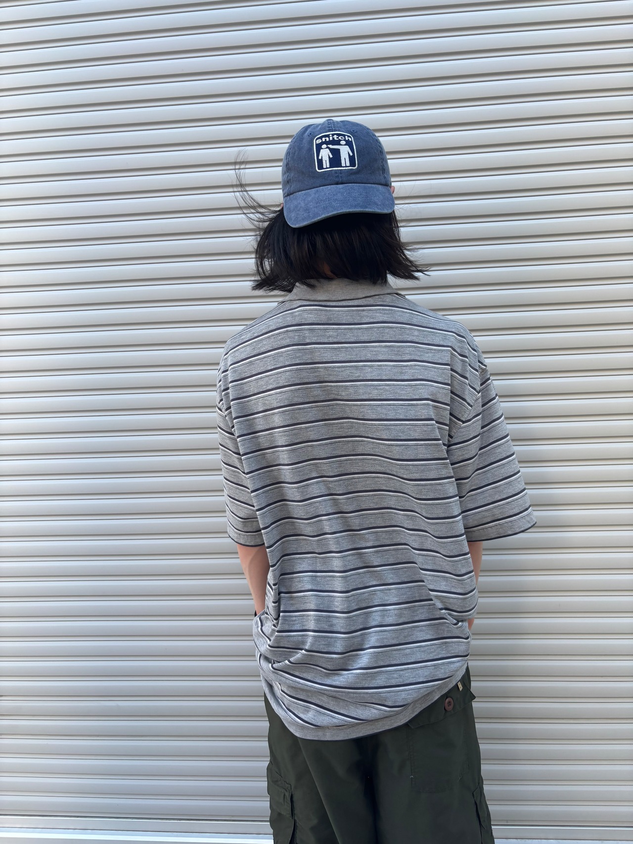 バギーパンツを履くならやっぱりこんな感じのボーダーのゆるっとしたポロシャツを合わせたくなります。グレーベースにネイビーとホワイトのボーダーで合わせやすさ抜群です。ボタン開けてネックレス見せながら着ちゃいましょう。