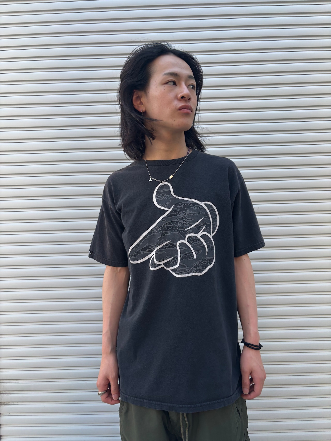 某マウスの手で銃のポーズをしたプリントがどデカくプリントされたグッドグラフィックTee。手の中が地味にタイガーカモなのも渋くてカッコイイです。サイズ感も今っぽいMサイズで1枚でしっかり決まりそうな1枚です。