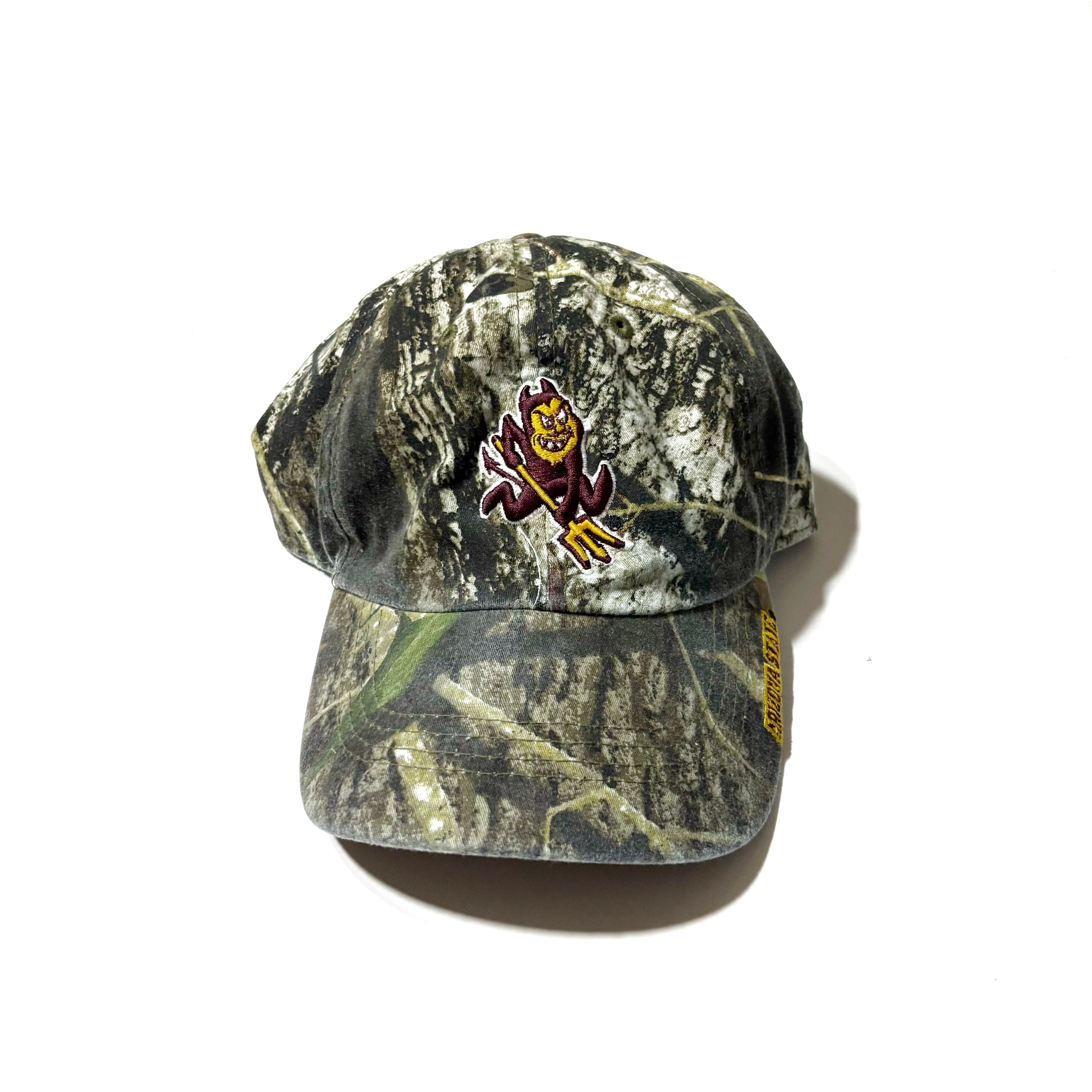 アリゾナ州立大学のアメフト部、サンデビルズのキャラクターであるスキーパーがフロントにドンと刺繍されたカモキャップ。キャラクター可愛らしさとリアルツリーのボディが非常に良いバランスです。