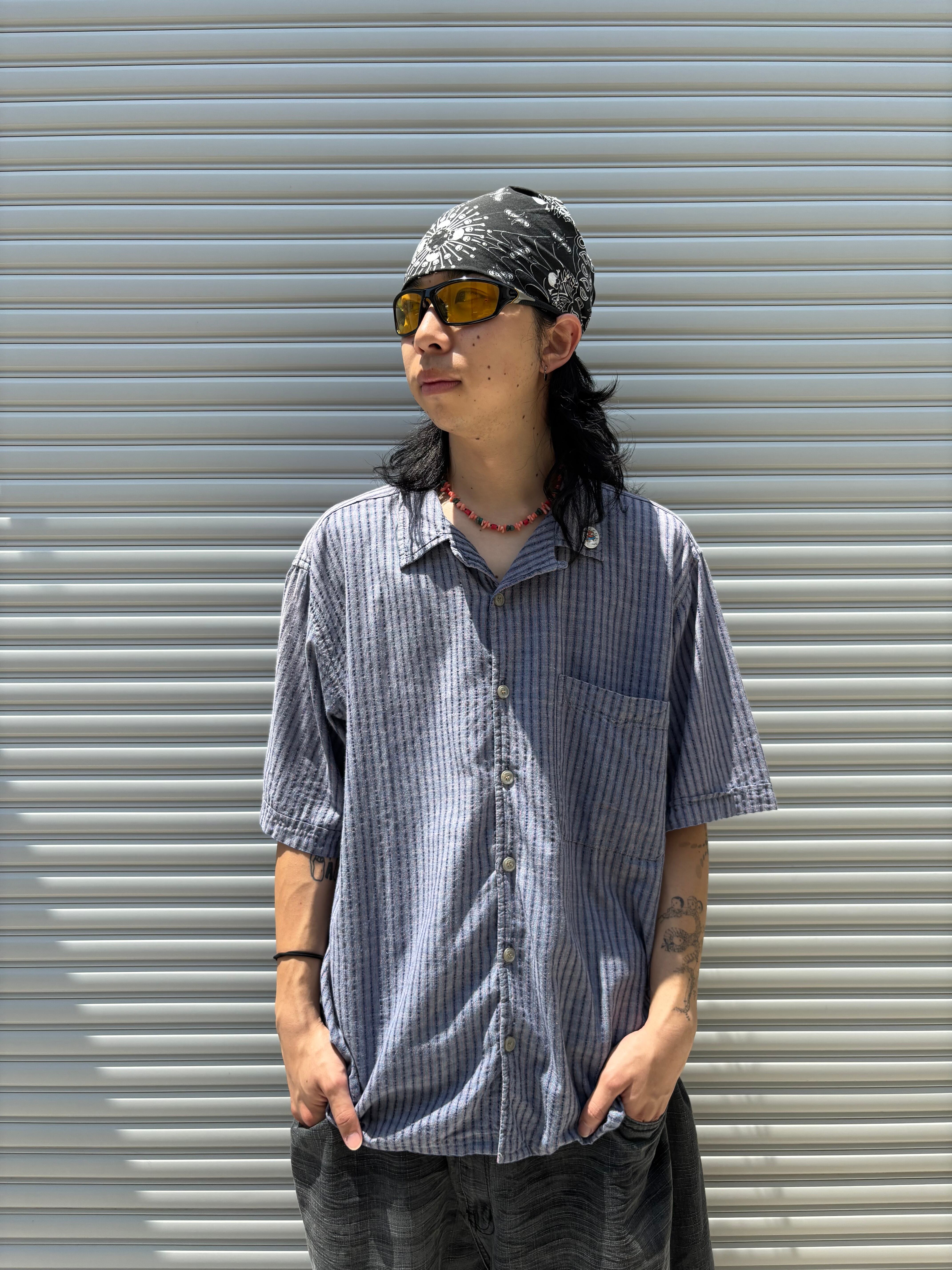 ポコポコ素材のストライプの裏に薄く横線がありパッと見ストライプのようなチェックシャツ。色味自体も夏の夜空のような色味で非常に夏っぽいかっこよさ、サイズ感も良く、夏の即戦力として使えそうです。ちなみにBADGEにちなんでキースヘリングのバッジ付き!