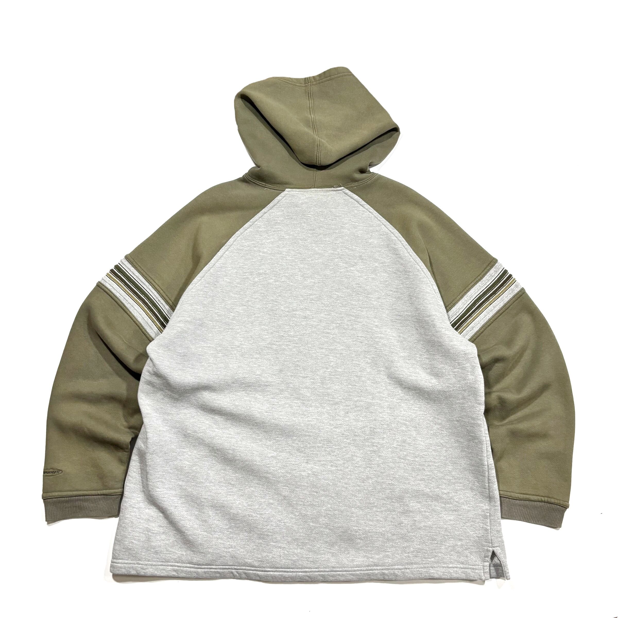 僕らが愛してやまないSIDEOUTのデザイン効きまくりのフーディ。グリーンとグレーのラグラン切り替えに袖のボーダー、短い袖リブと裾のスッキリ感のバランス、そして大きめのボックスシルエットという完璧な作り。でかいデニムとの相性も抜群です。