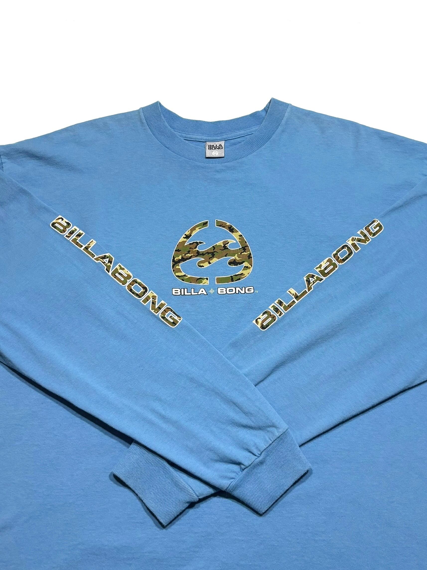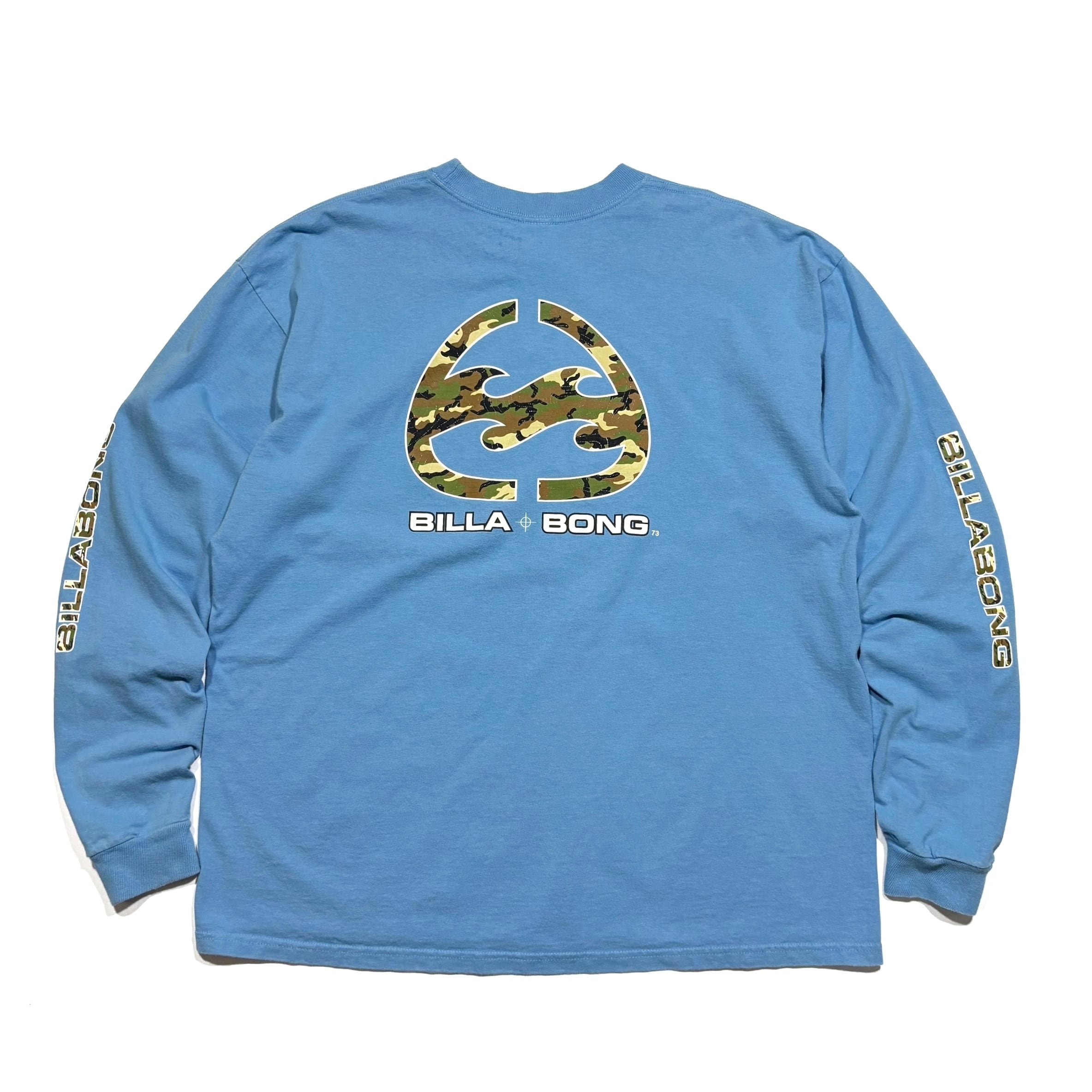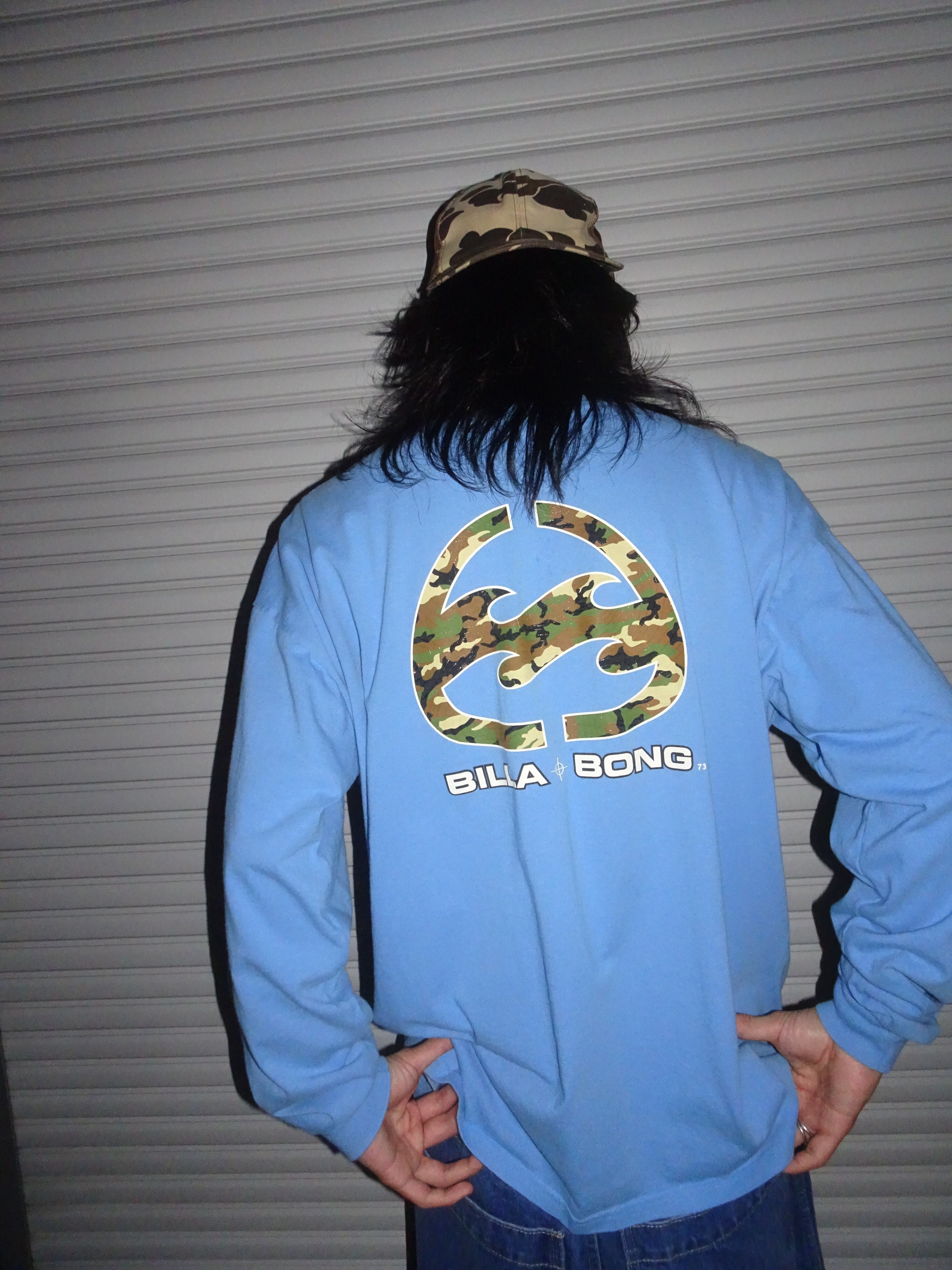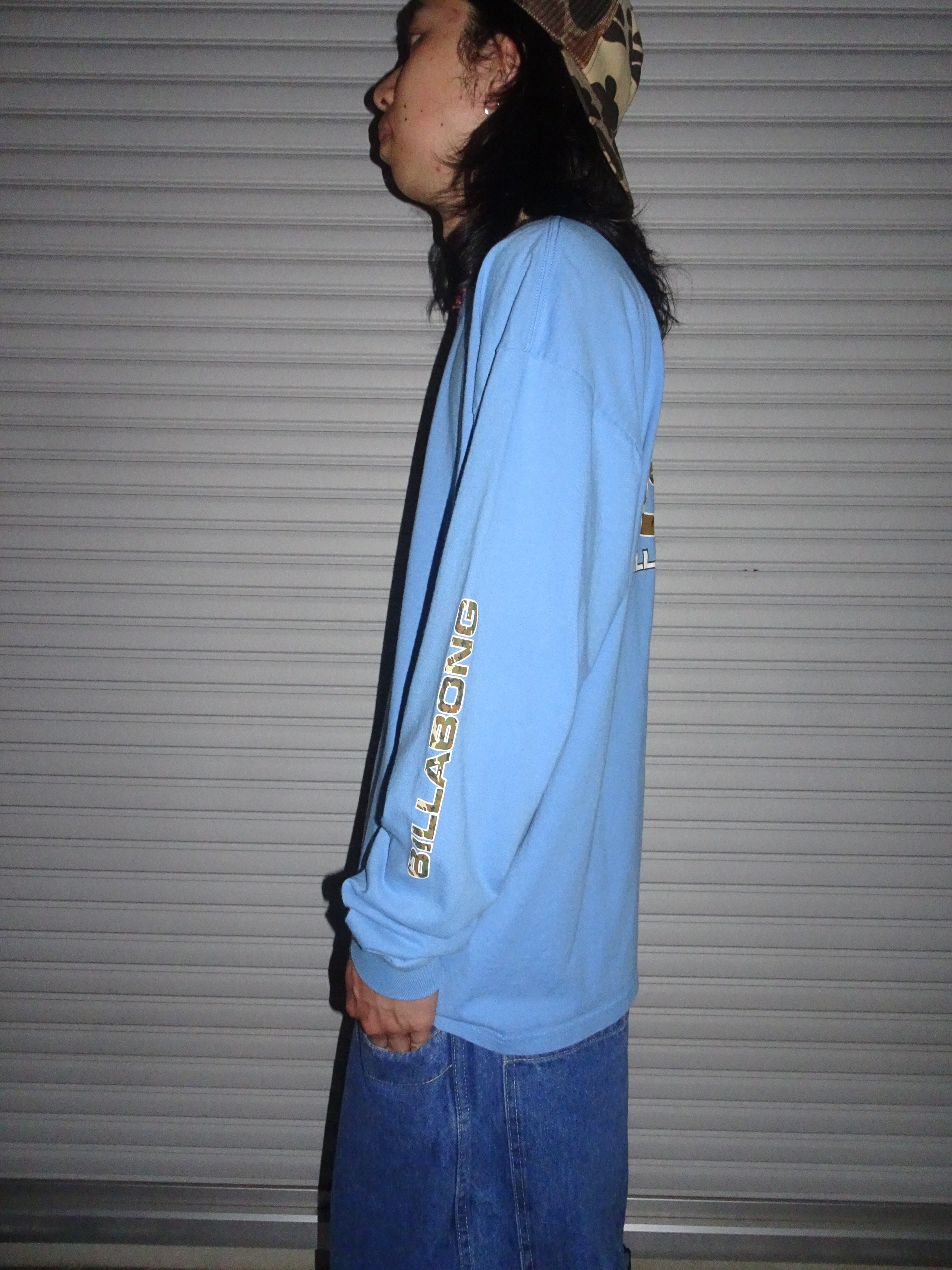 今まで見たサーフ系のロンTの中で1,2を争うカッコ良さと完成度の1枚。BILLABONGらしい、綺麗な海のようなブルーにまさかのカモ柄のロゴ、しかも袖プリもしっかりあってサイズ感も完璧。本当に100点満点のロンTです。迷ったらこれ。欲しい。