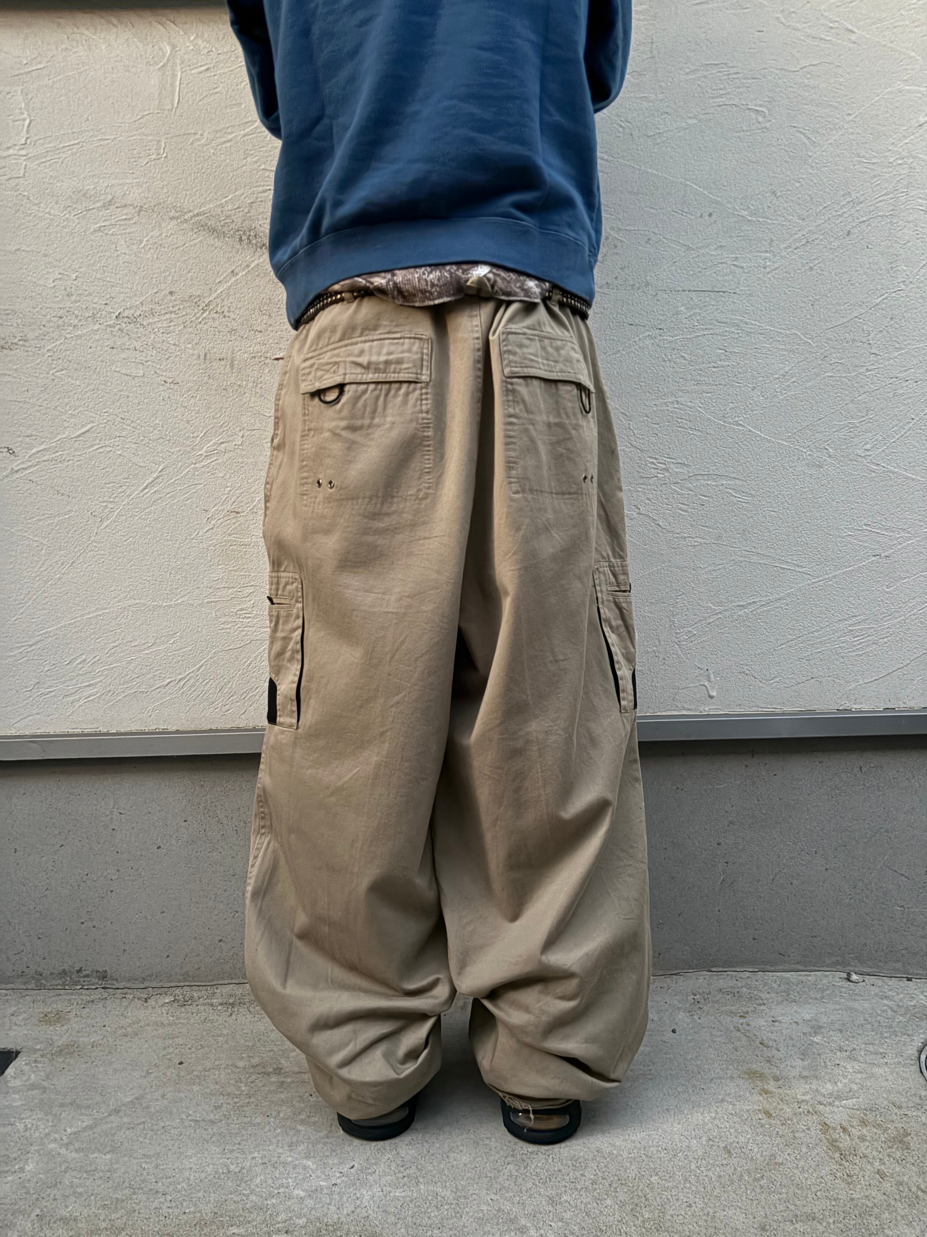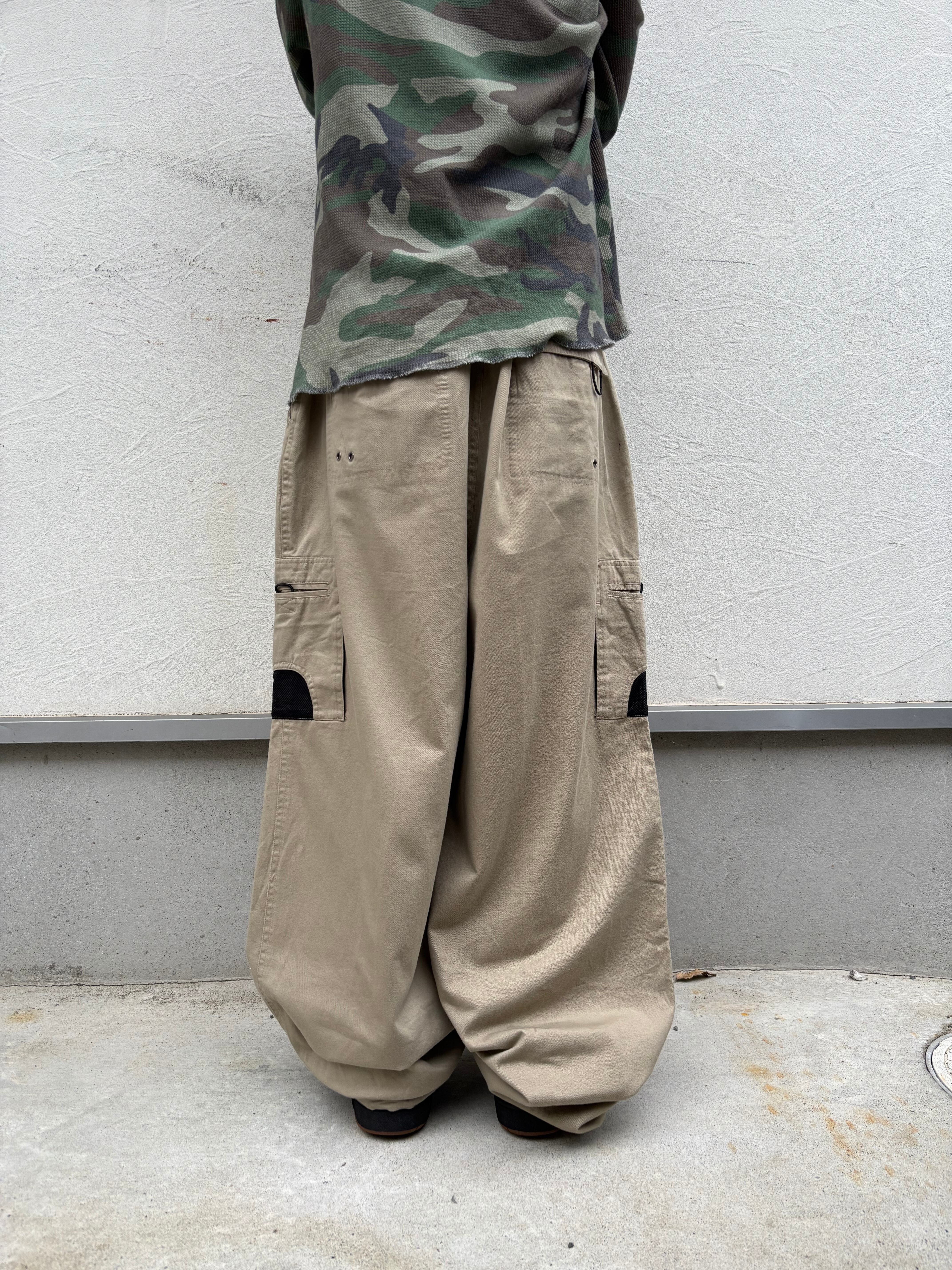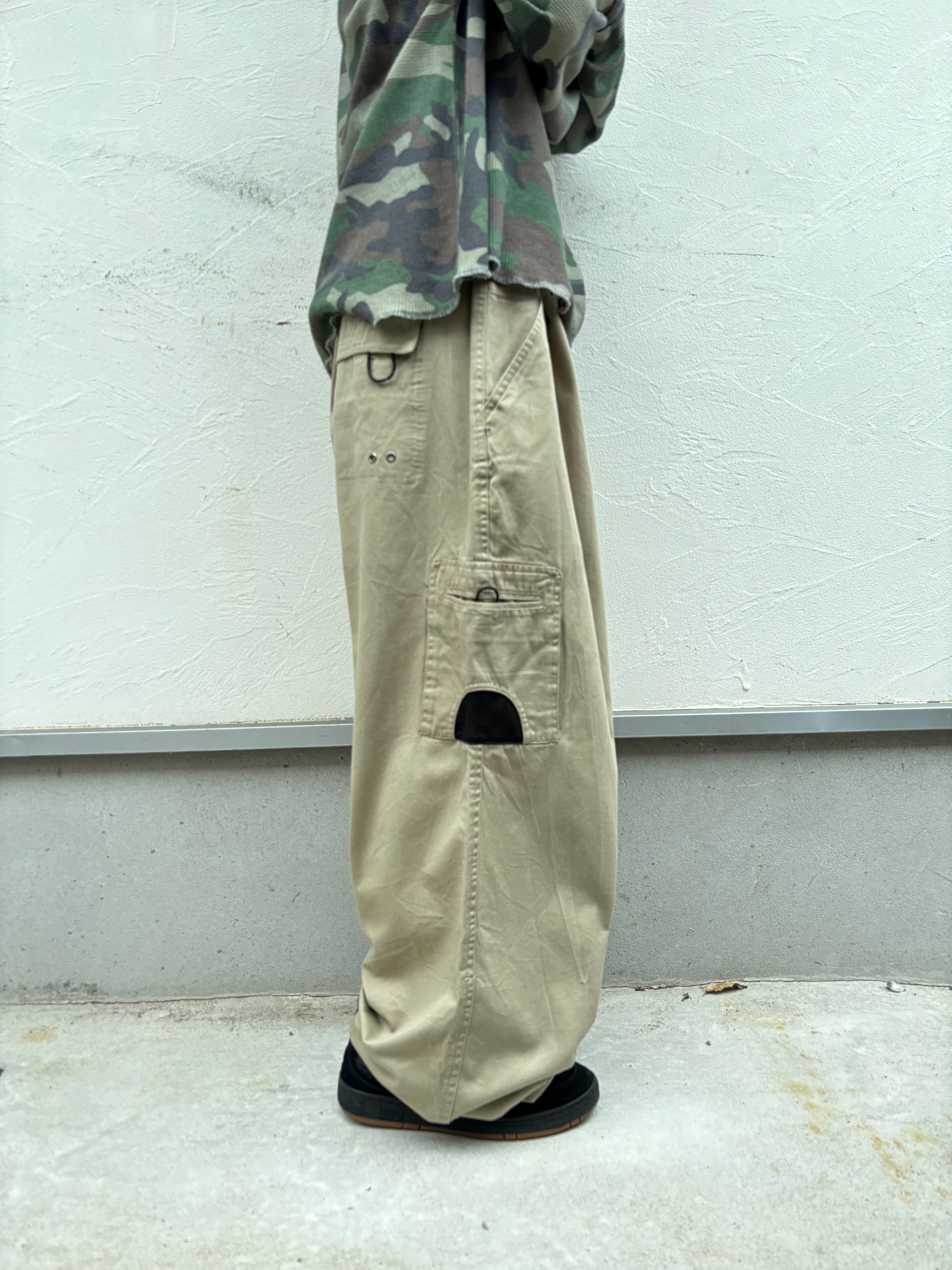 00sの初見ブランドのスーパーバギーシルエットのギミックパンツ。超絶使い易い色味のベージュに、両サイドのメッシュ付きポケット、腿、裾共にしっかり太いサイズ感、使いまくれること間違い無しの1本。