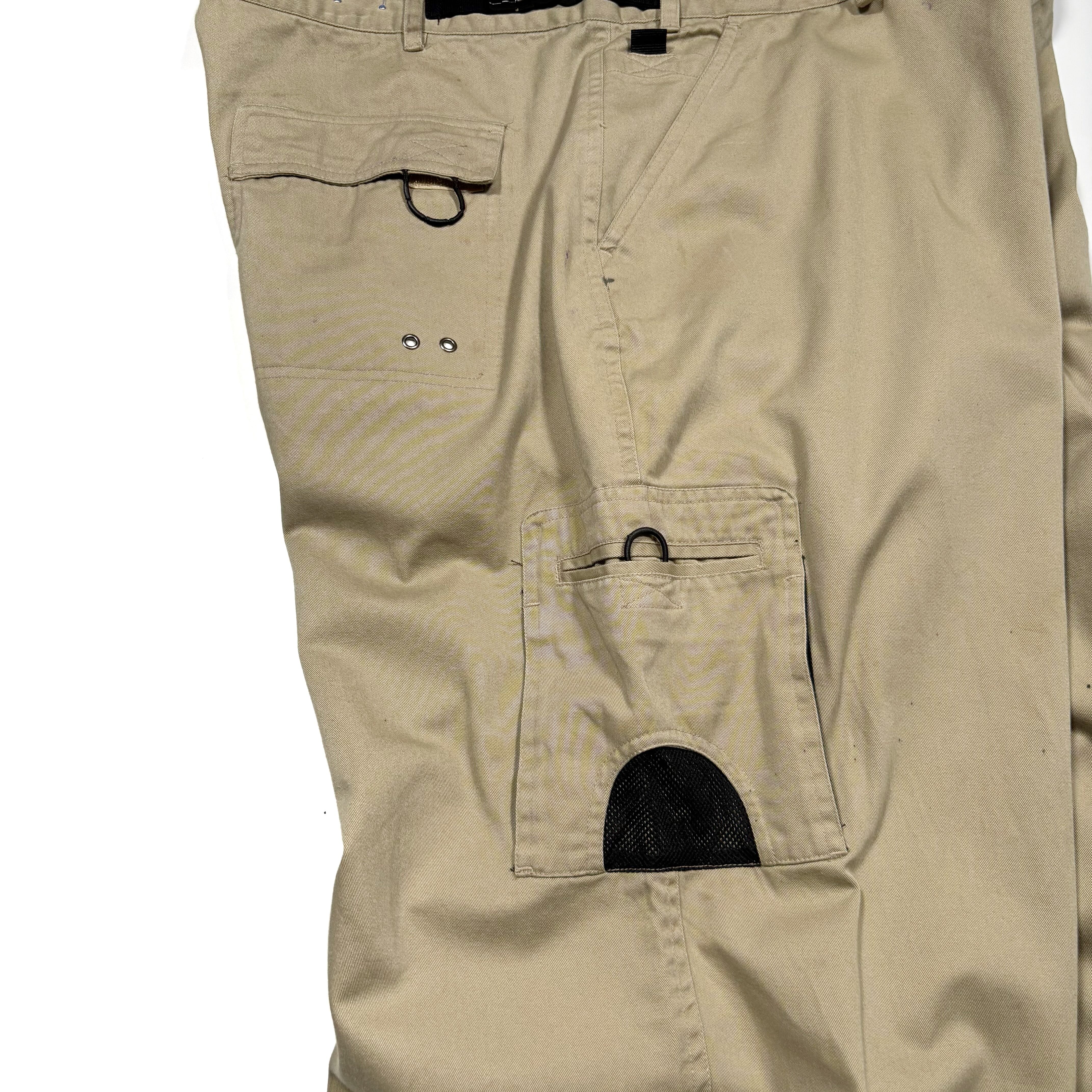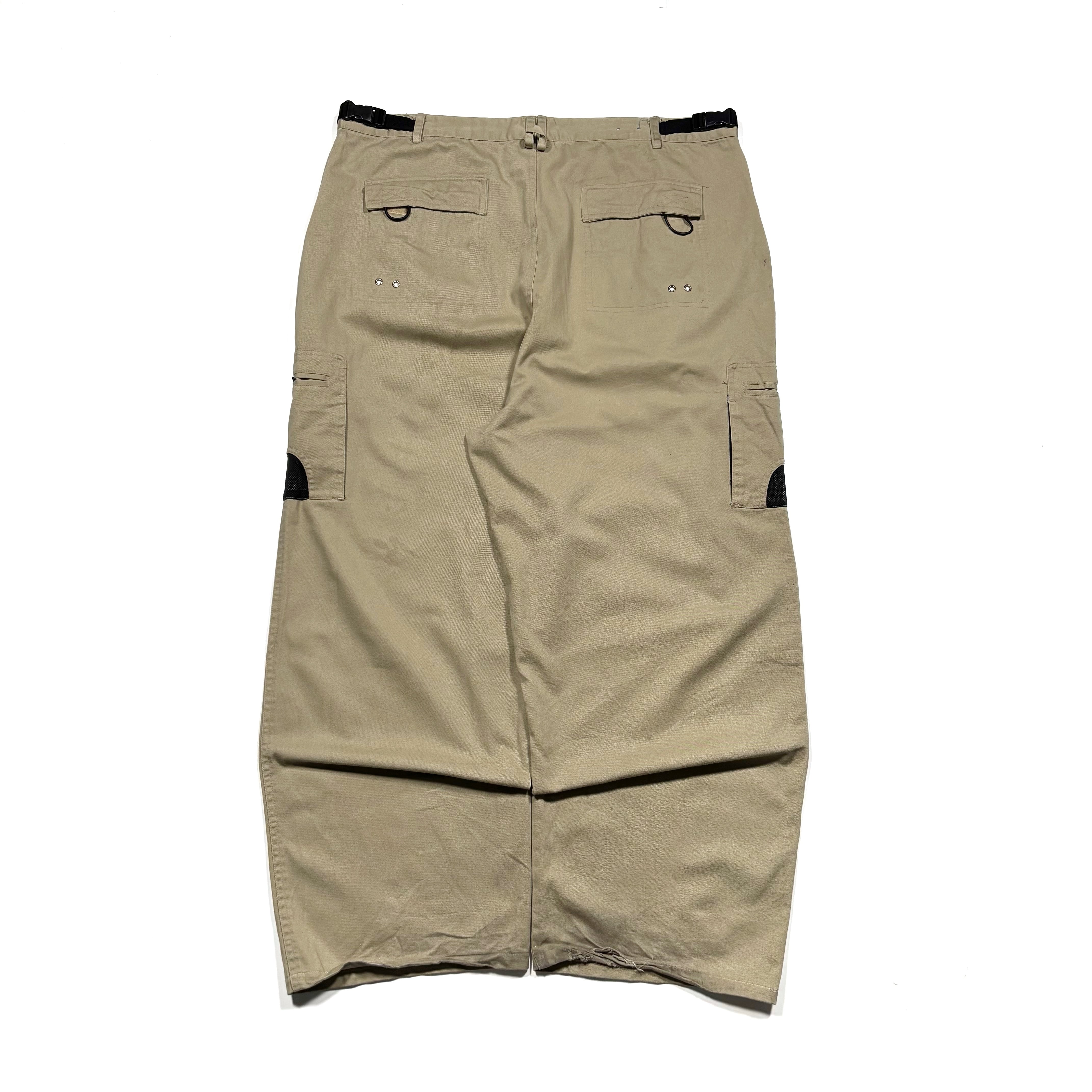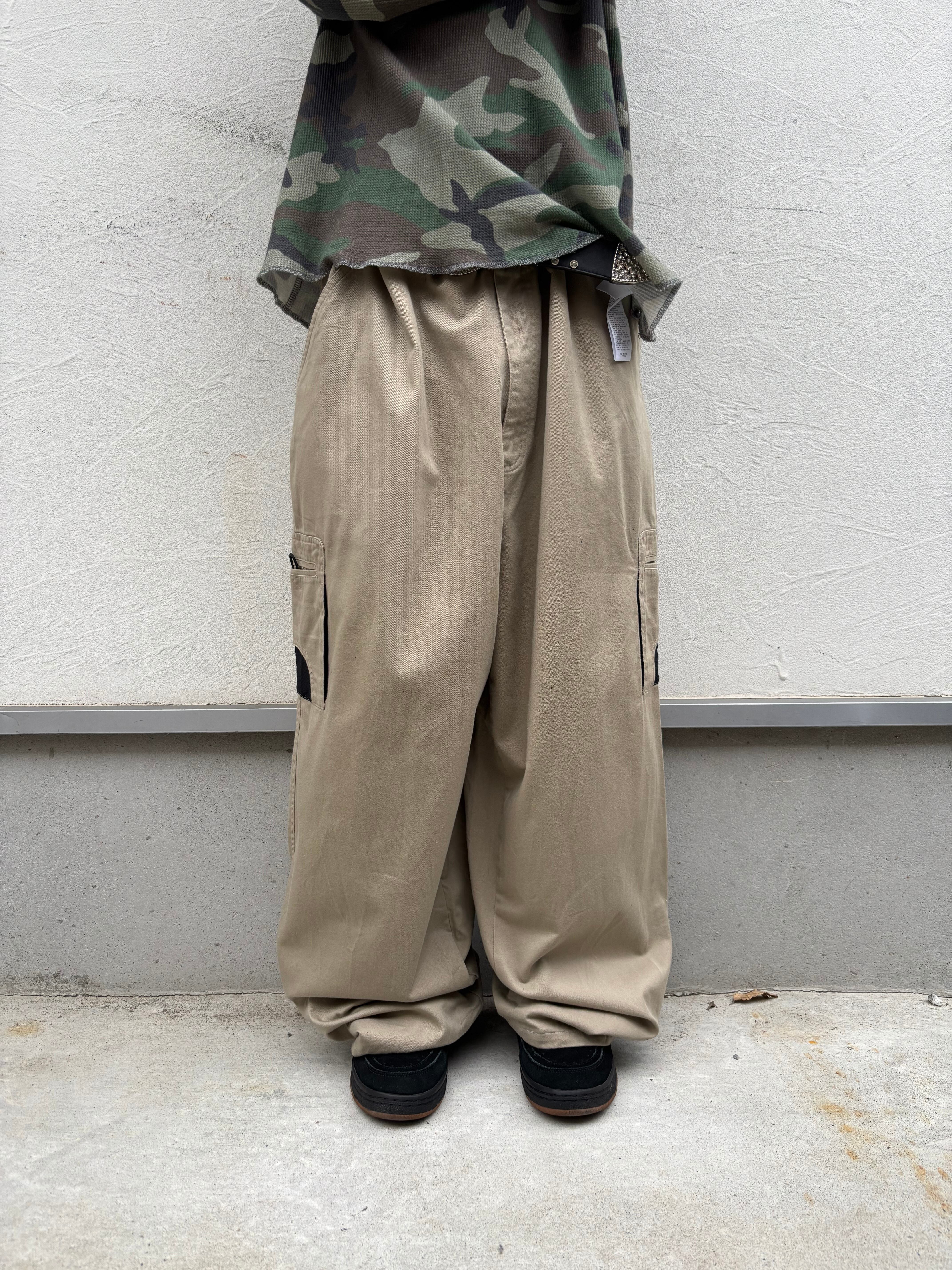 00sの初見ブランドのスーパーバギーシルエットのギミックパンツ。超絶使い易い色味のベージュに、両サイドのメッシュ付きポケット、腿、裾共にしっかり太いサイズ感、使いまくれること間違い無しの1本。
