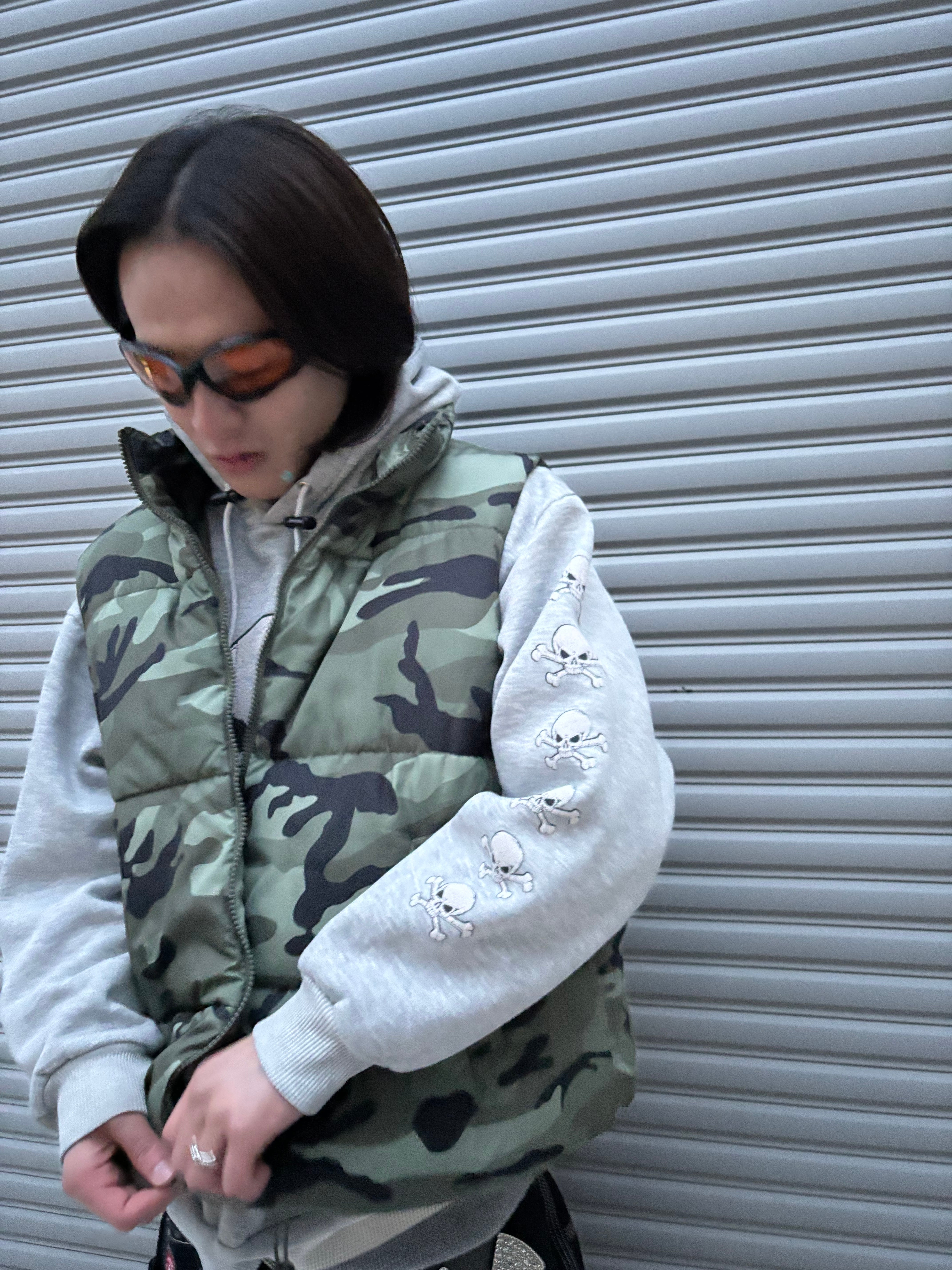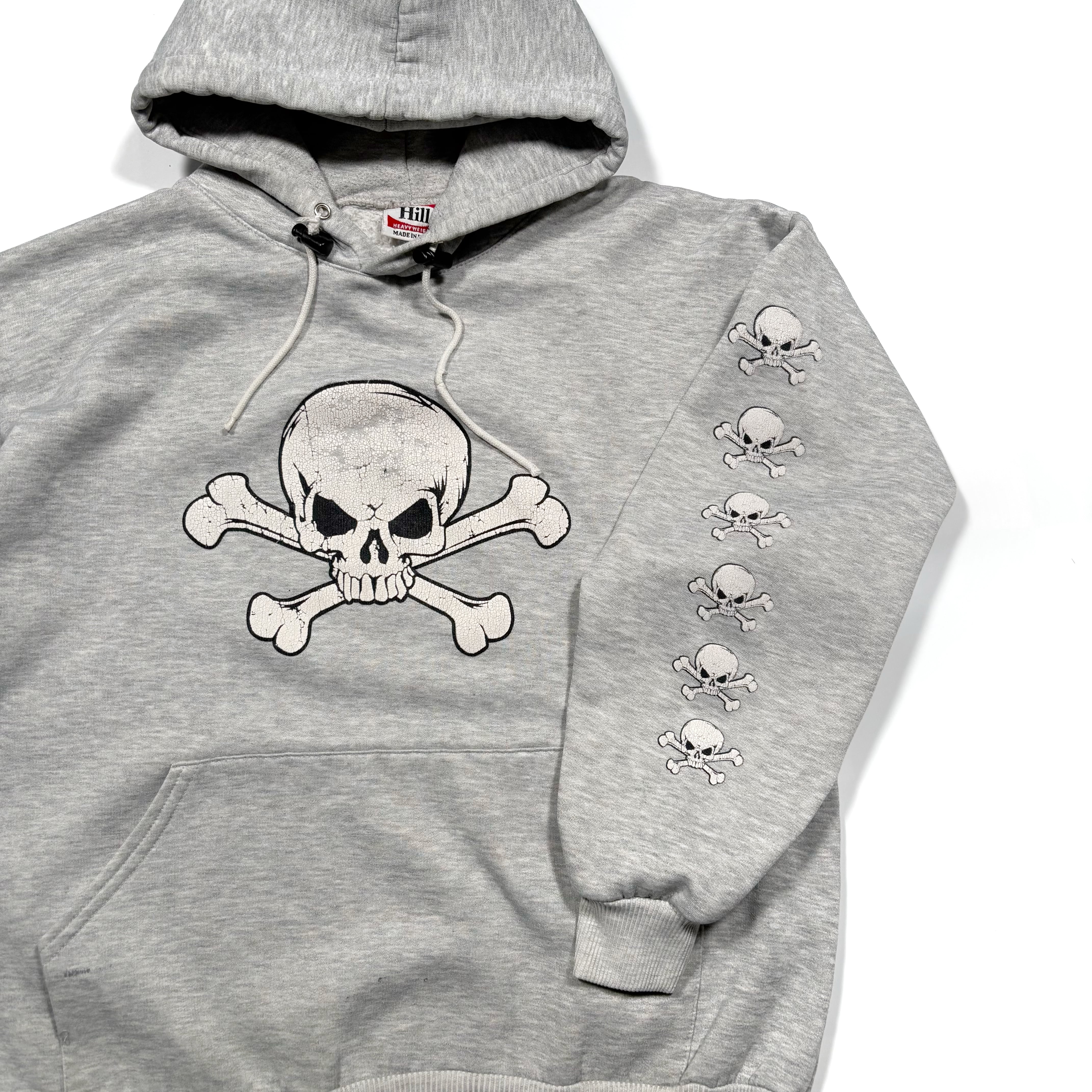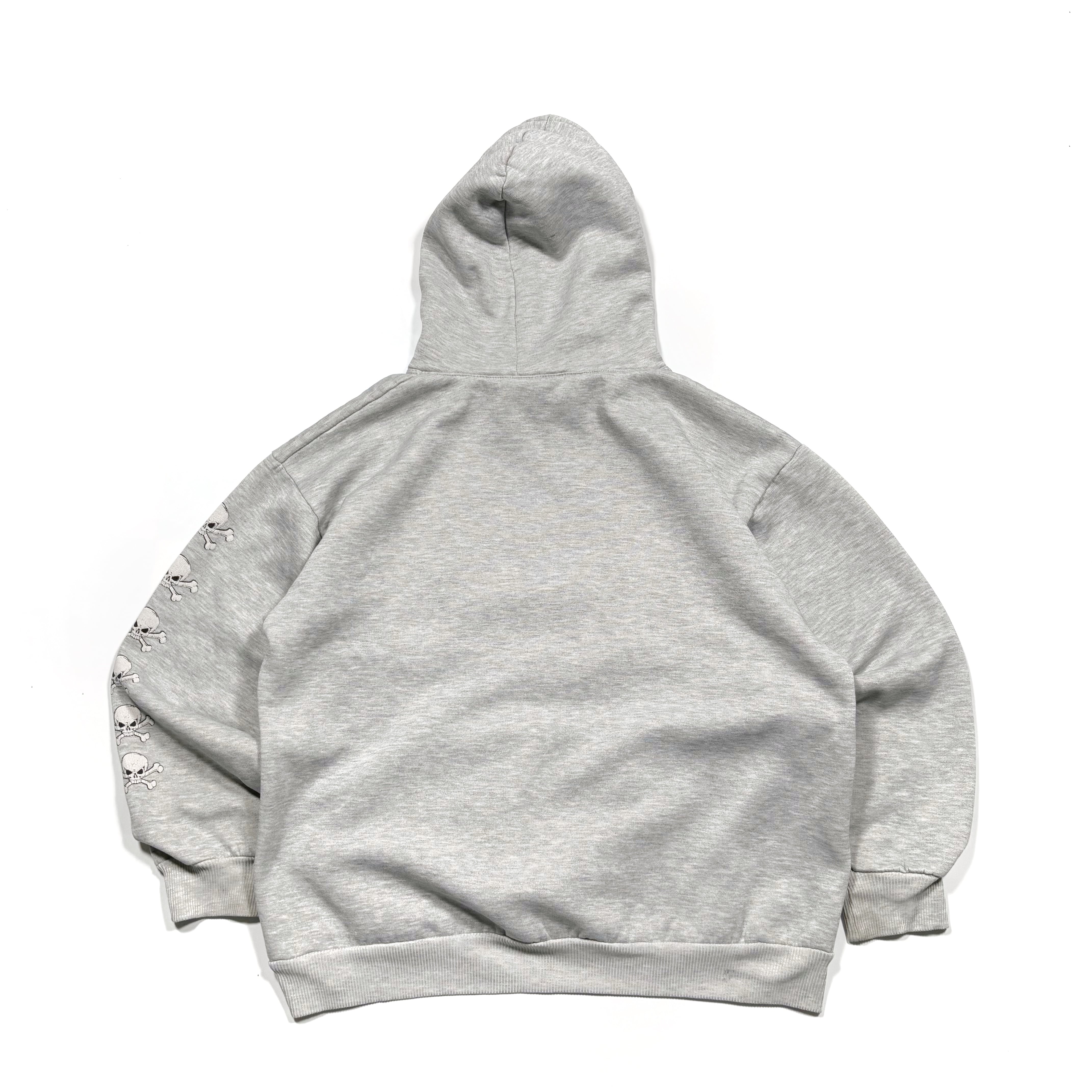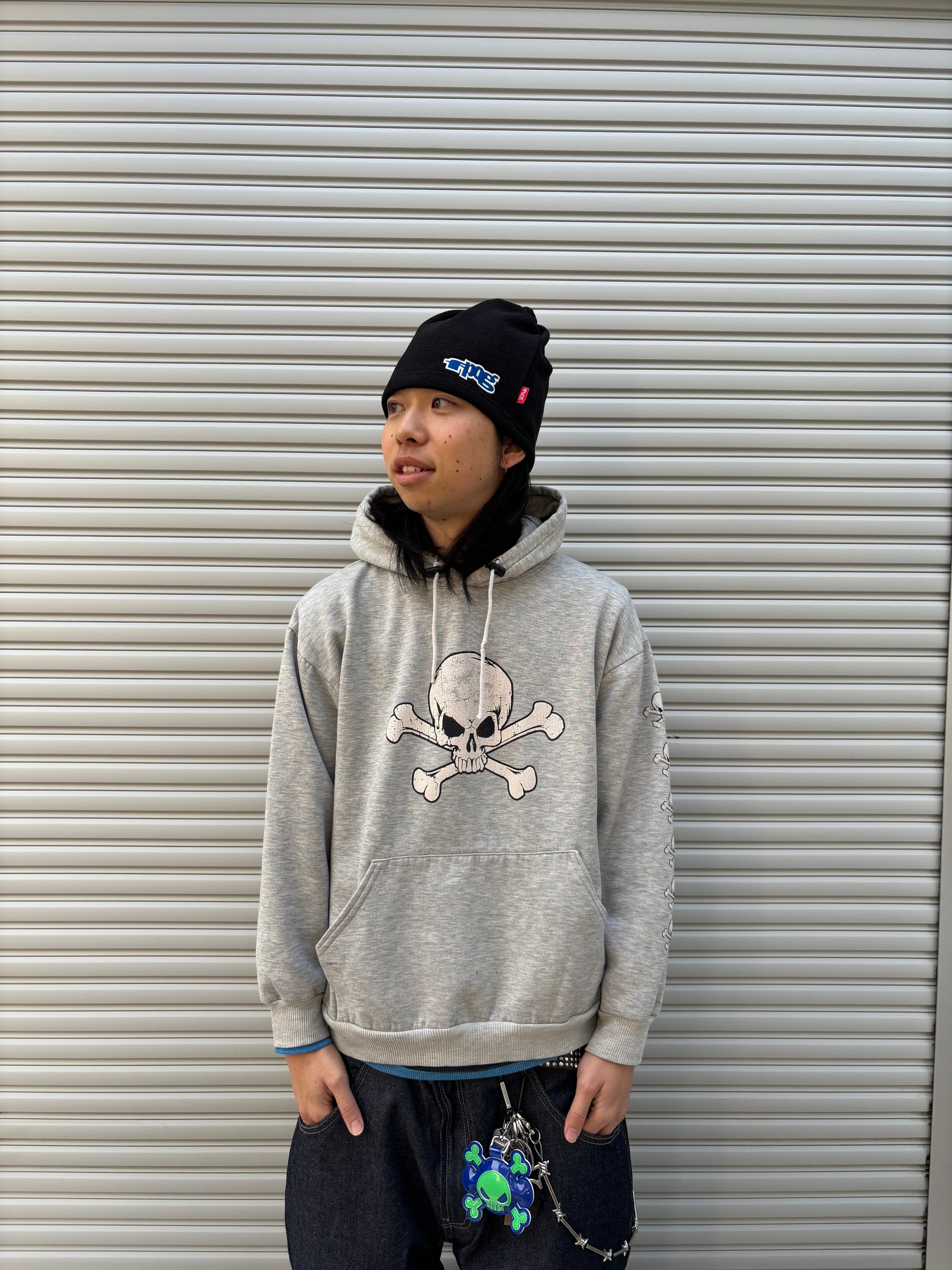 いかにも好き系なスカルプリントが施された超絶Y2Kなフーディ。しかも左袖には6連スカルプリントで更にswagに仕上がってます。グレーのボディとの相性もよく、めちゃくちゃ使えそうな1枚です。