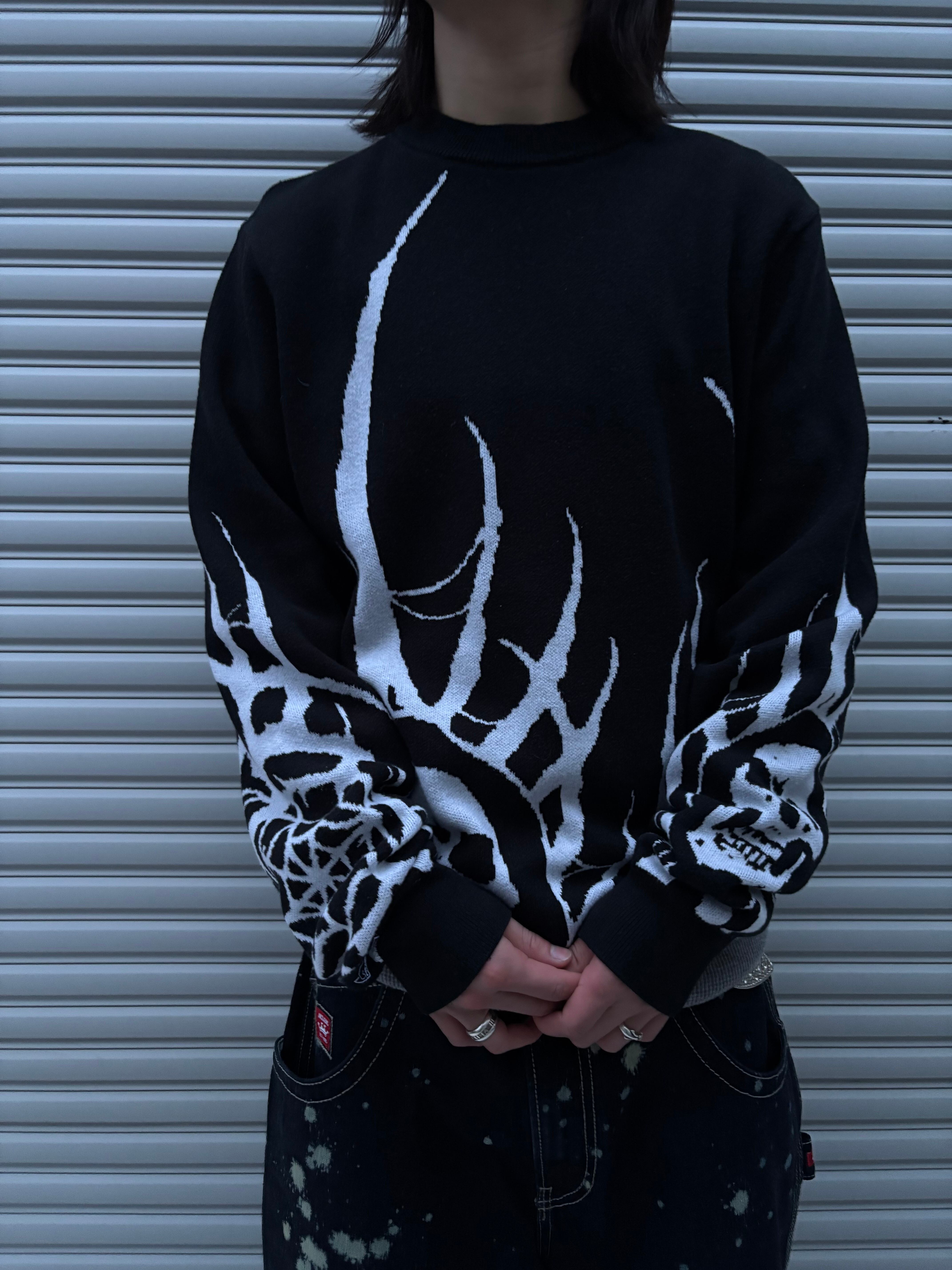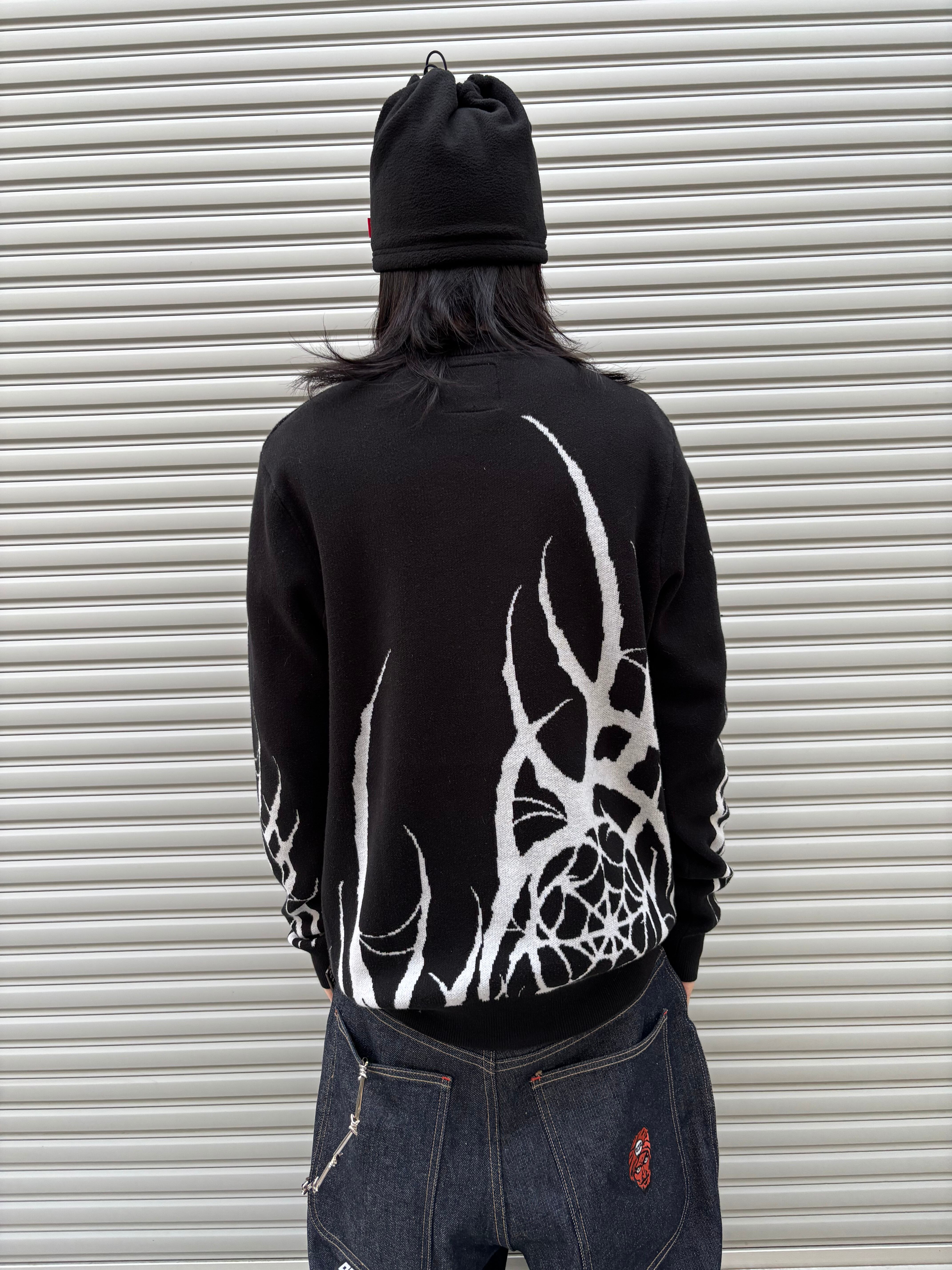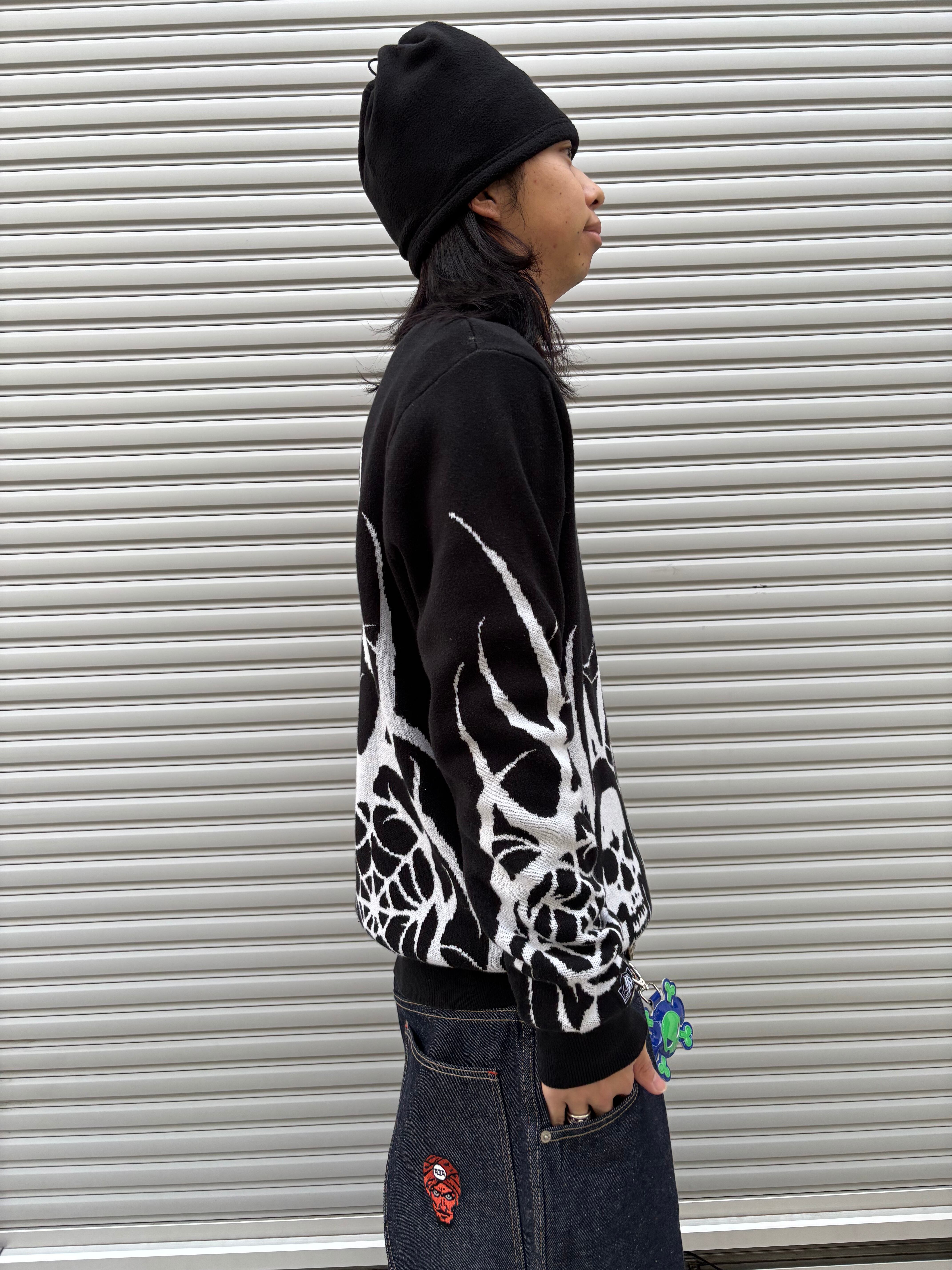 スパイダーウェブのようなトライバル柄にドクロのデザインが超絶Y2Kを感じさせるニット。コットンアクリルのモチモチの素材感とは裏腹に両袖までガッツりプリントされていてめちゃくちゃクールな1枚です。