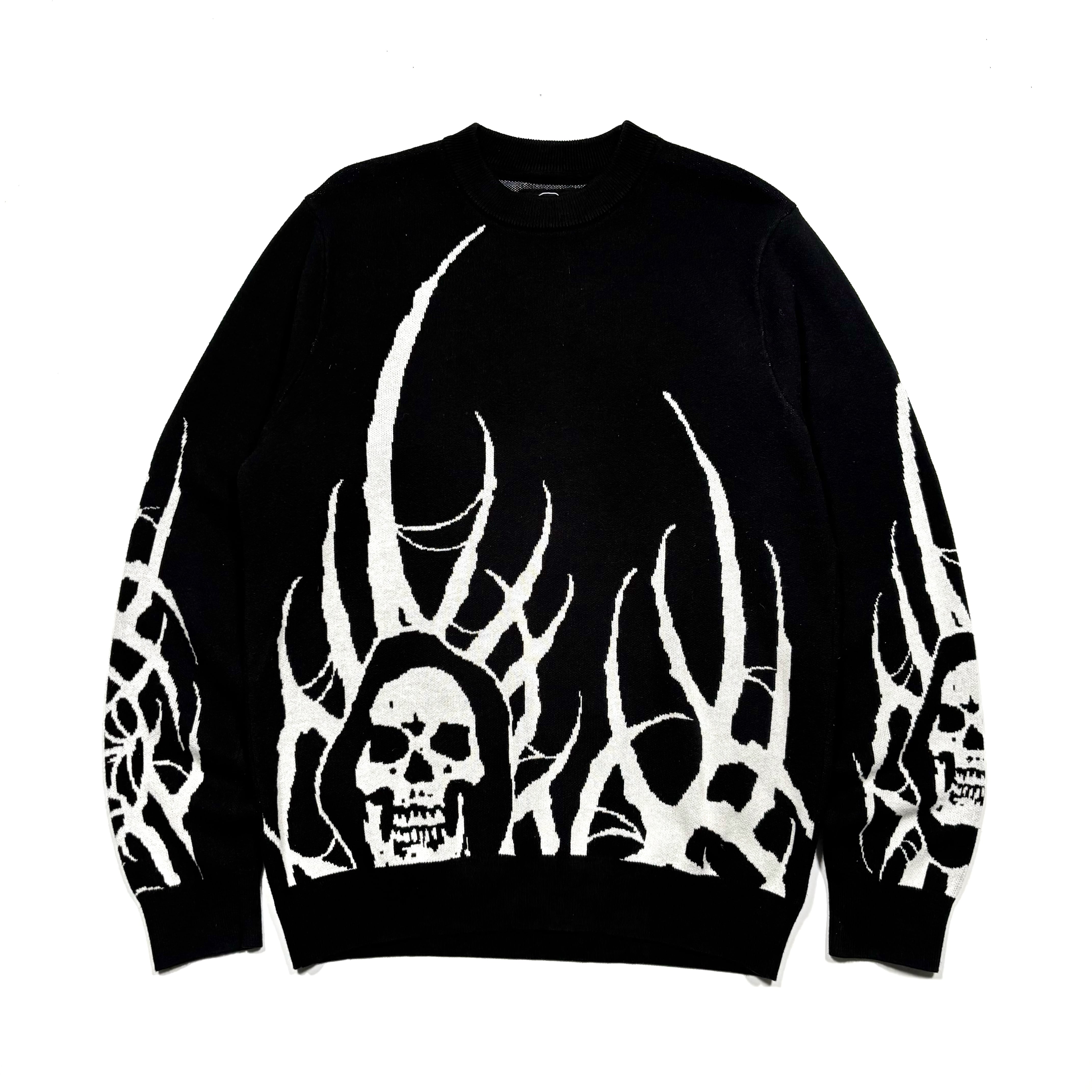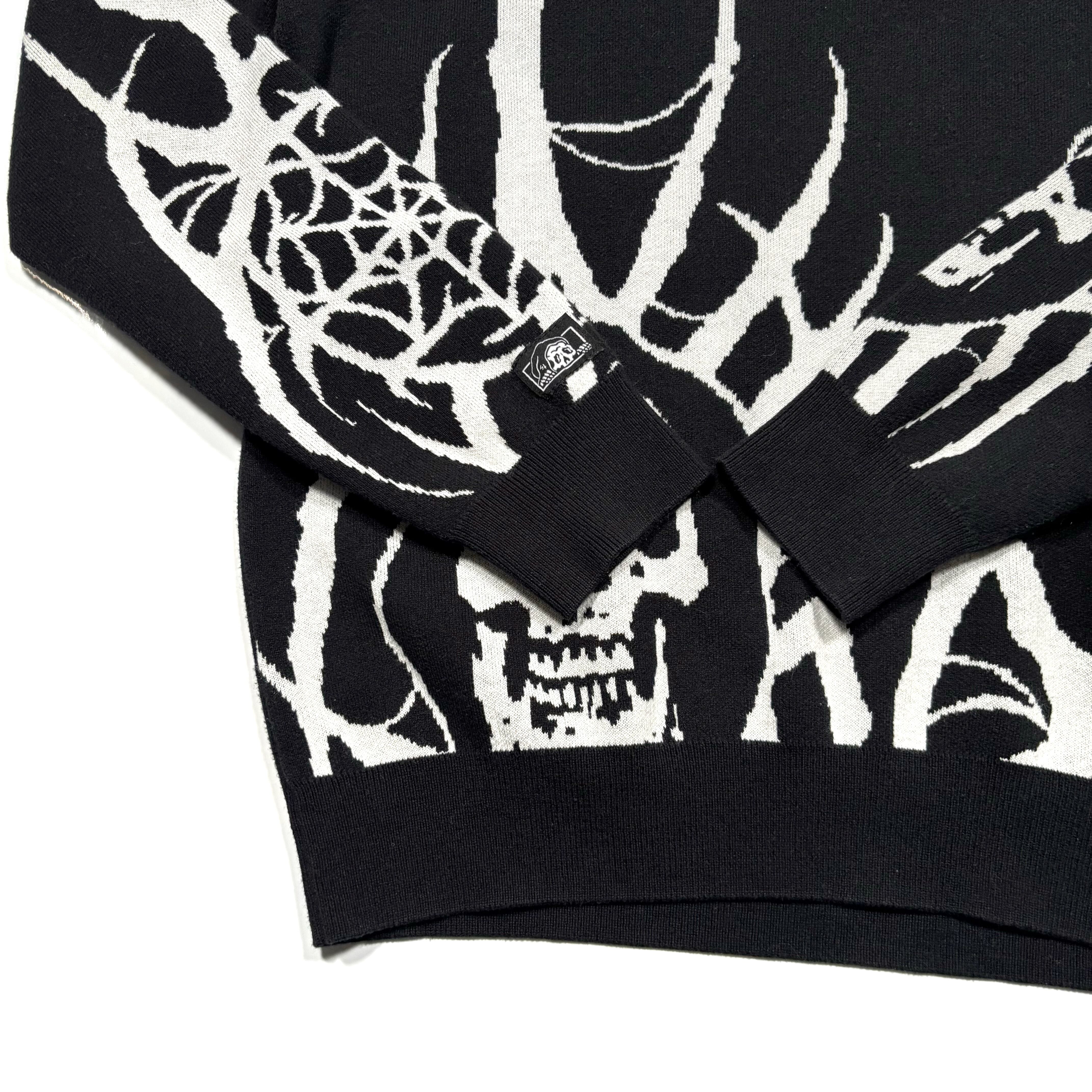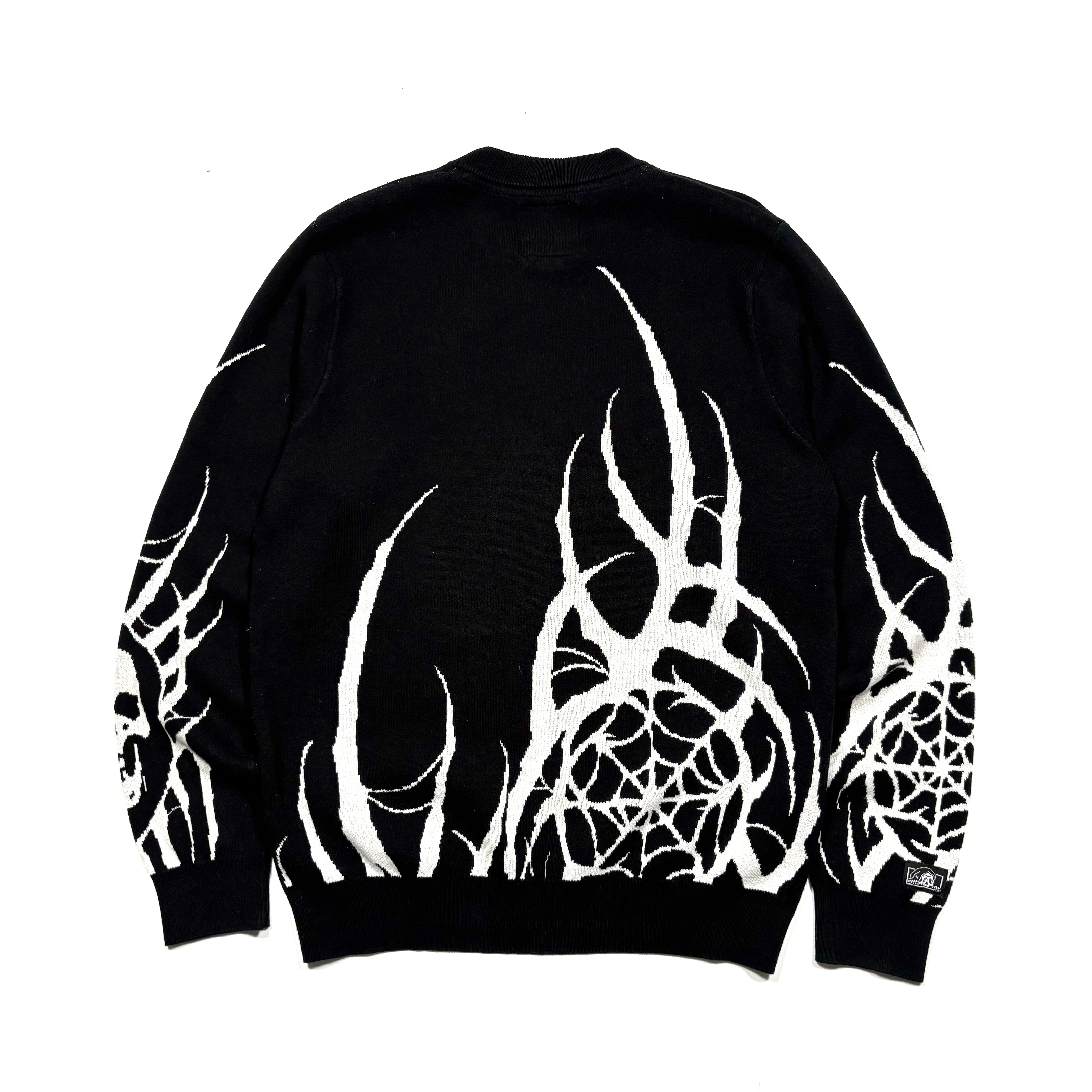 スパイダーウェブのようなトライバル柄にドクロのデザインが超絶Y2Kを感じさせるニット。コットンアクリルのモチモチの素材感とは裏腹に両袖までガッツりプリントされていてめちゃくちゃクールな1枚です。