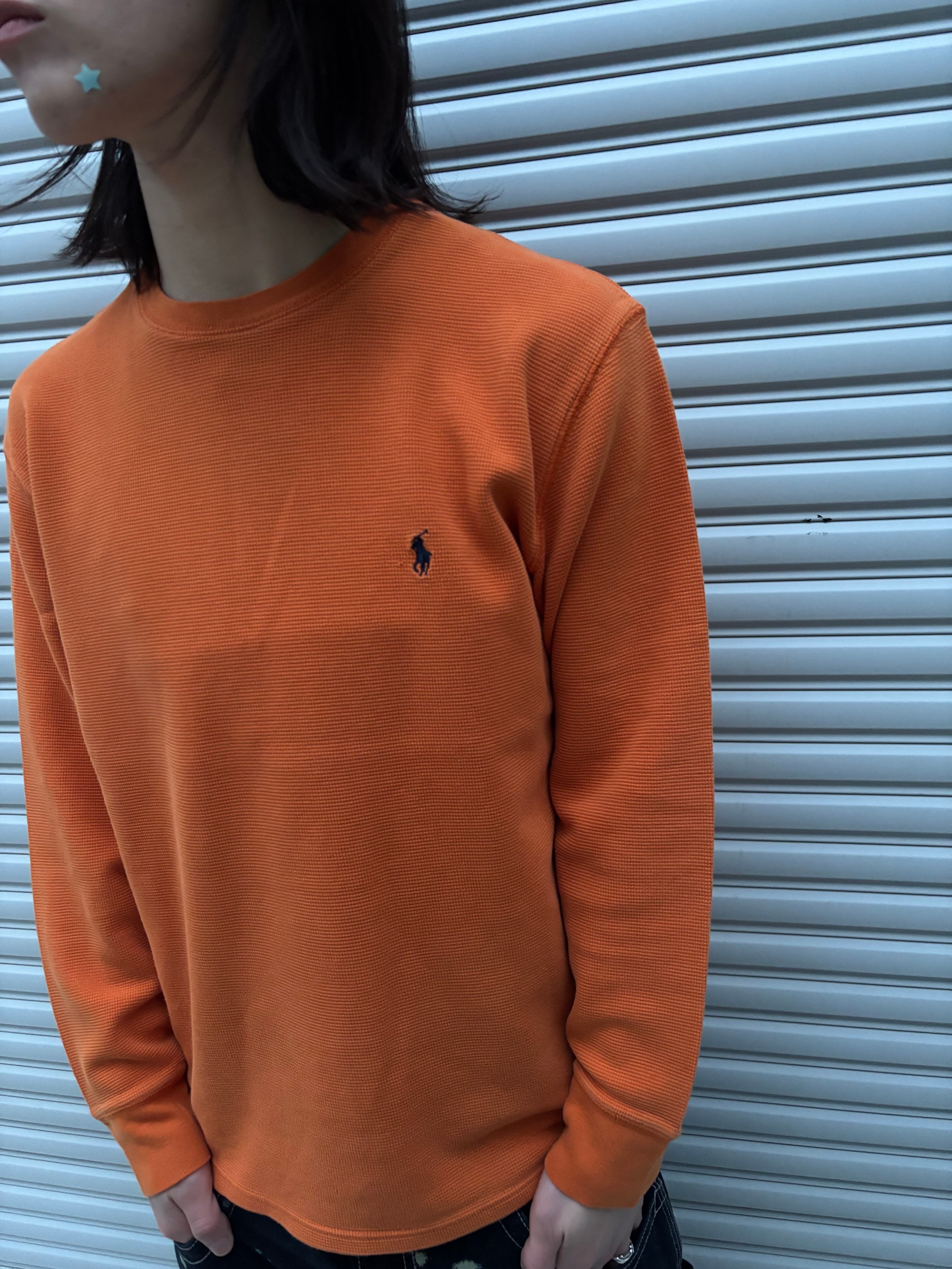暖かなオレンジの単色ボディにネイビーのポニーが良く映える可愛すぎるサーマル。サイズ感も表記通りのMサイズでインナー使いはもちろん、1枚で濃紺デニムと合わせたりしても良さそうです。