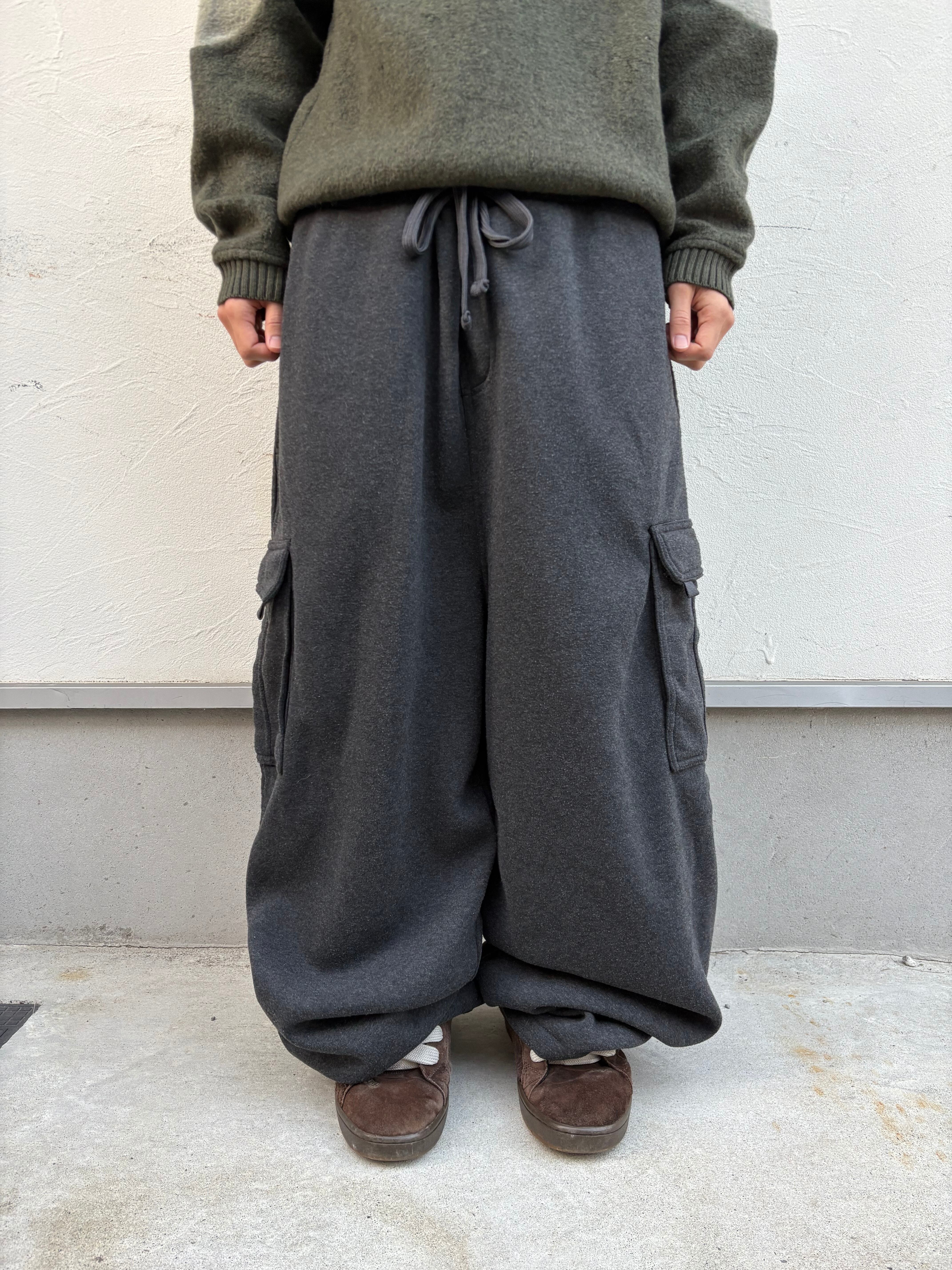 撮影時に履いて大声で叫んでしまったゴン太めちゃデカスウェットカーゴ。色味も深いチャコールで最強の合わせやすさかつ長めのレングスで化け物シルエット、裾幅が控えめなおかげで足元にガッツリ溜まってくれる非の打ち所が無い最高の1本。