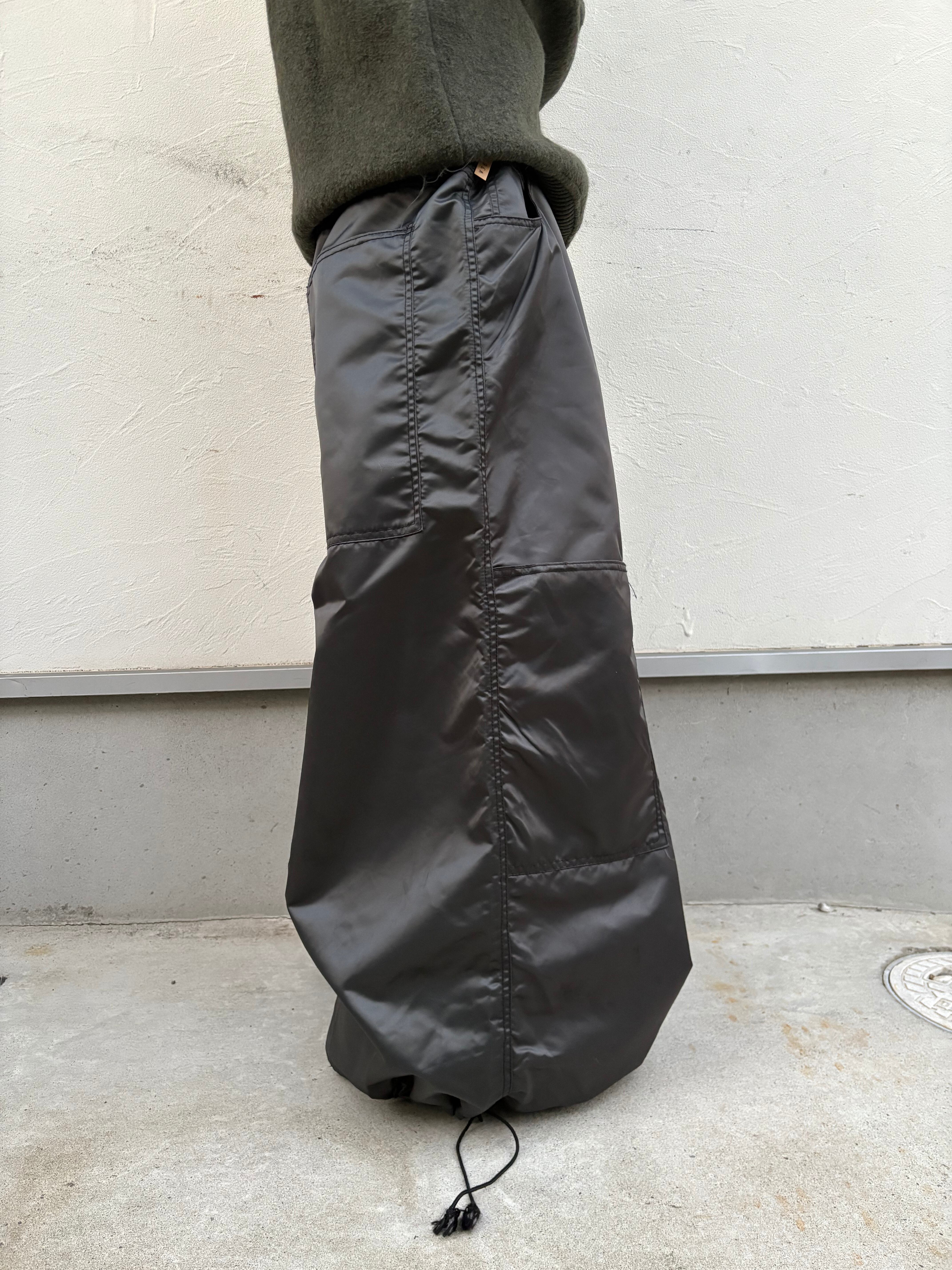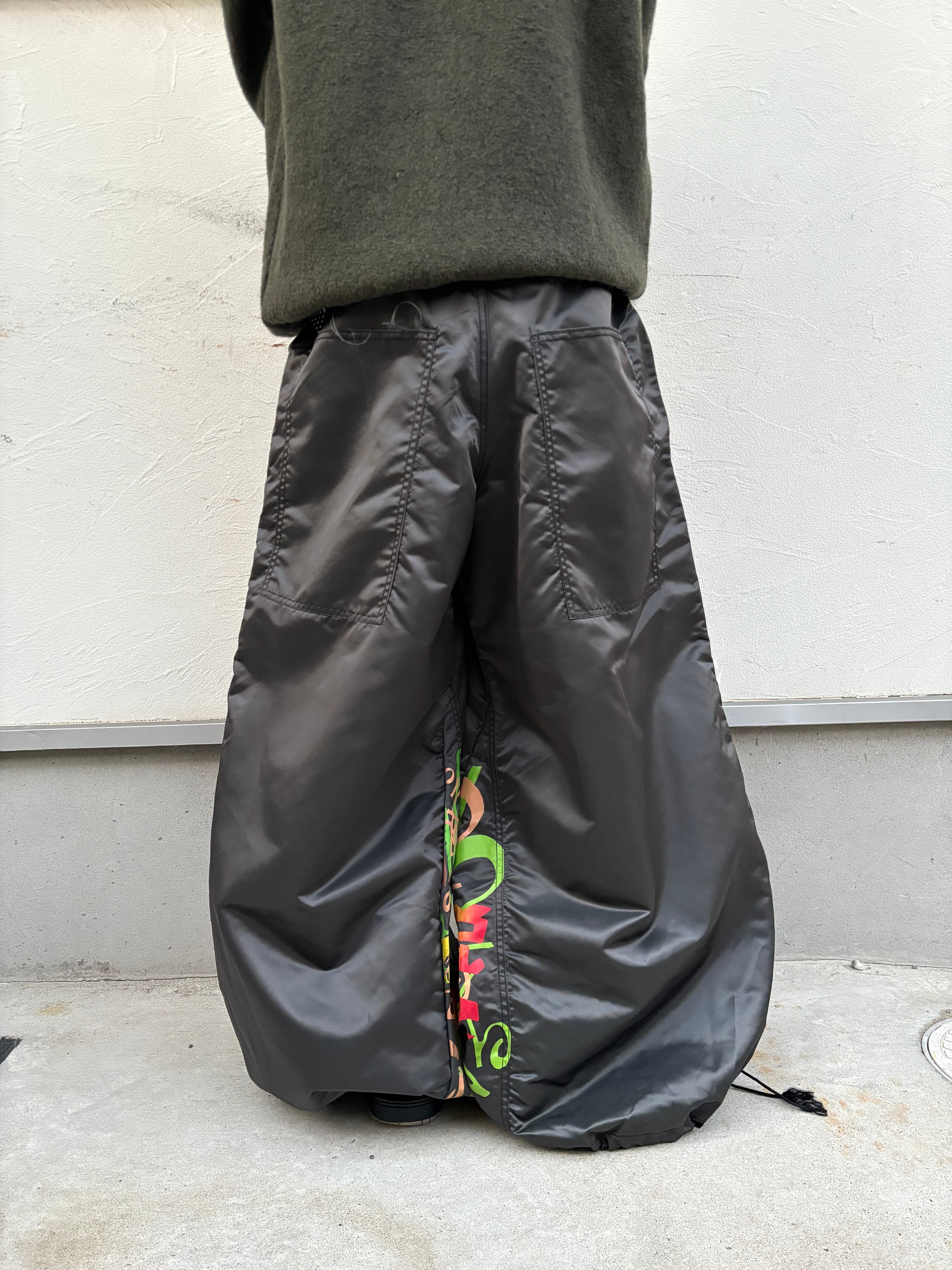 もうこれはもはやパンツというか太い1本、ほぼ球体のヤバすぎるレイヴパンツ。しかも内股部分にどデカいプリント(接客旅とかいう謎ワード)でデザイン性、インパクト共に申し分なし、しっかり絞り付きでちゃんとファッションできる正真正銘化け物レイヴパンツです。