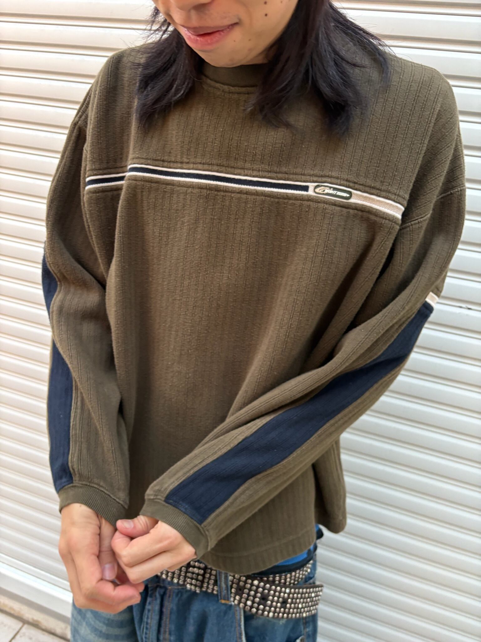 みんな大好きポイントゼロのラインニット。グリーンとネイビーというまさにY2Kな色使いと、ゆったりとしたボックスシルエット、雑に着てもしっかり決まる超絶使えるコットンニットです。