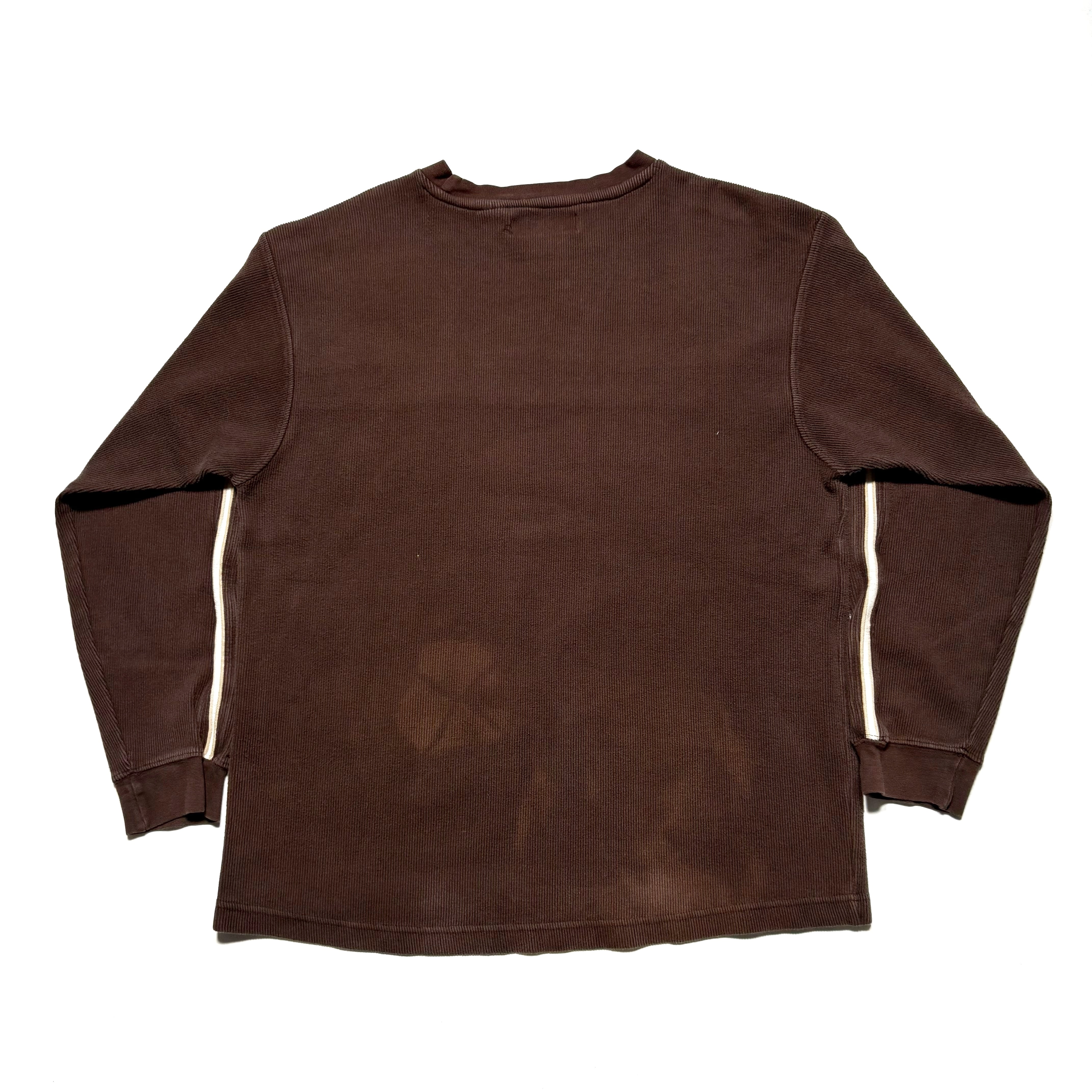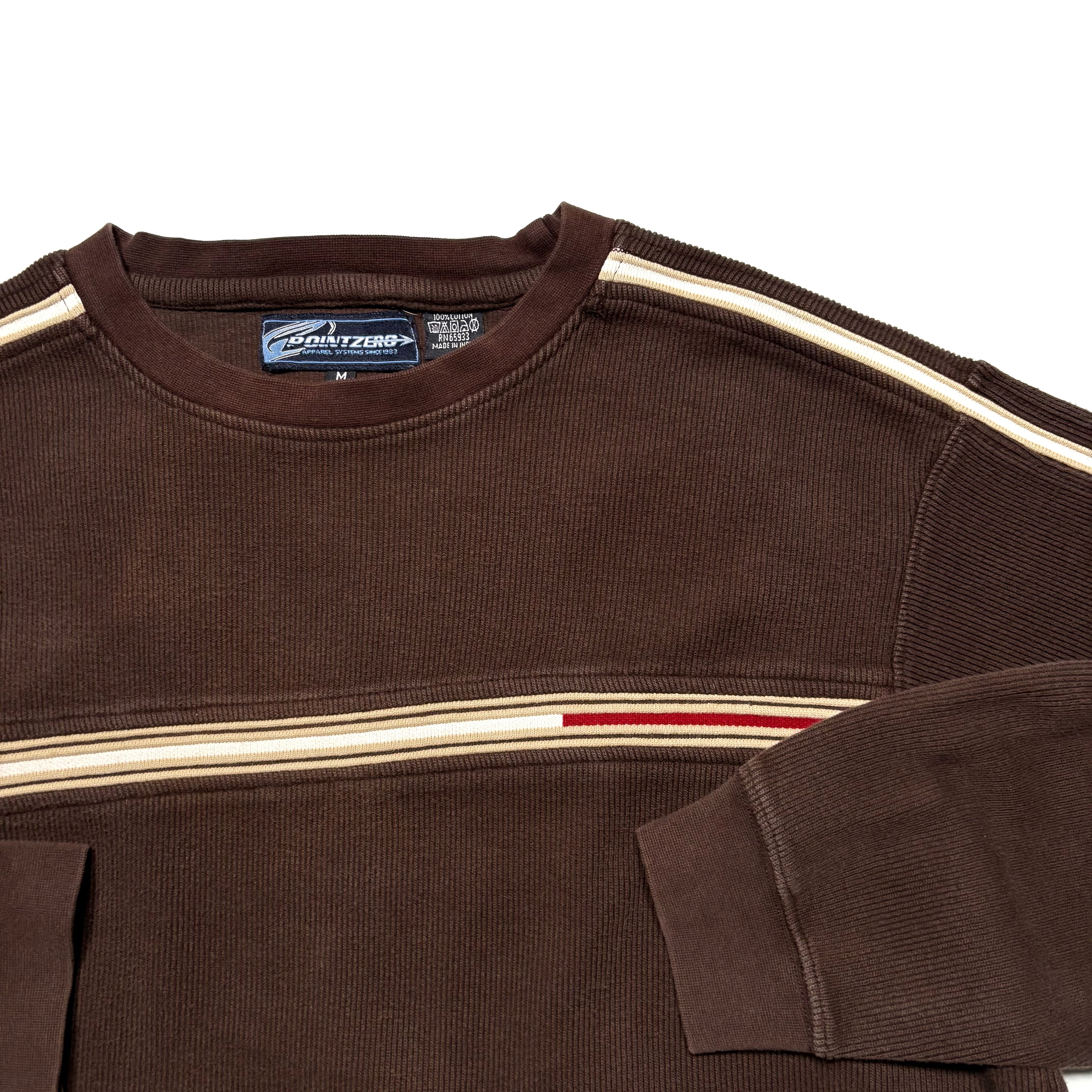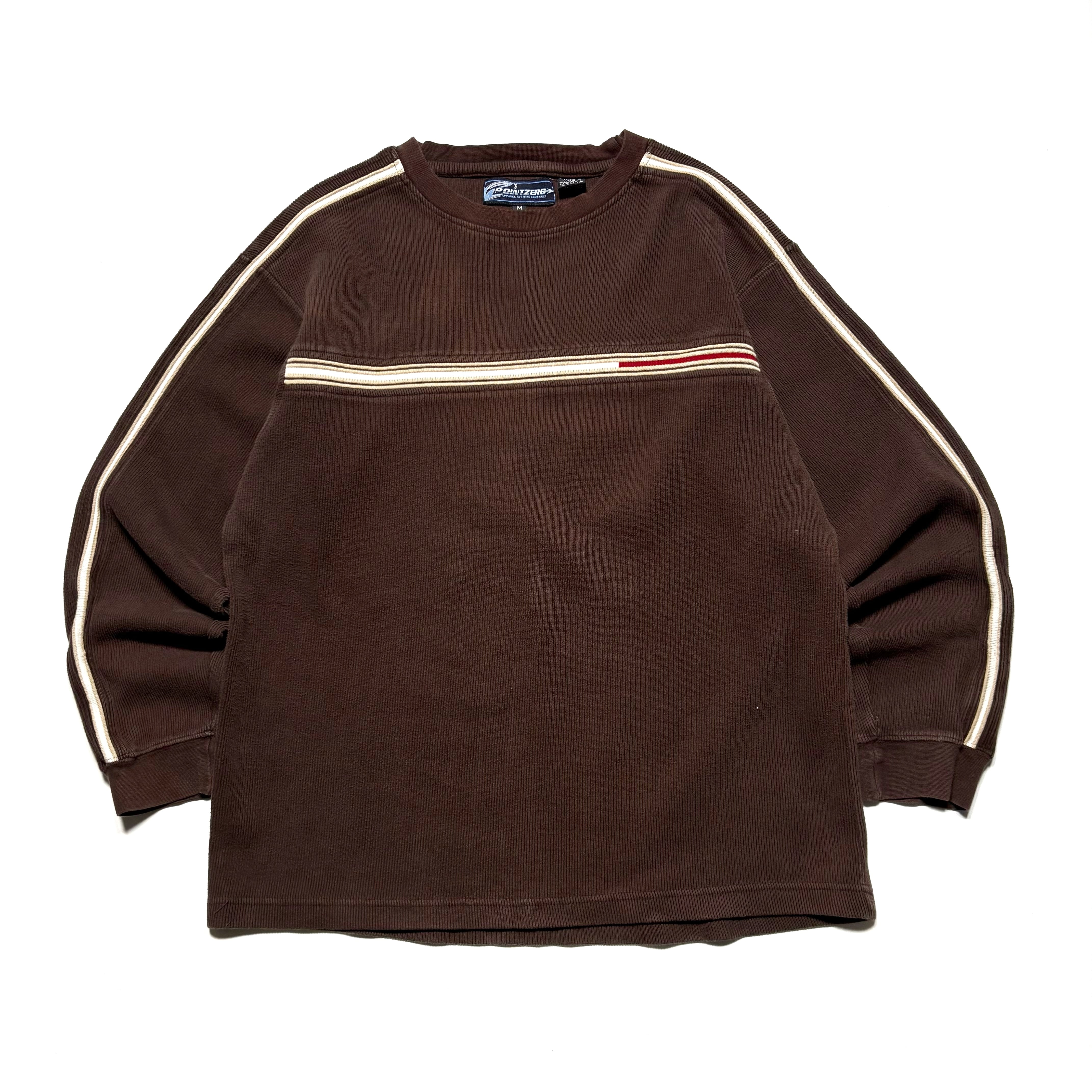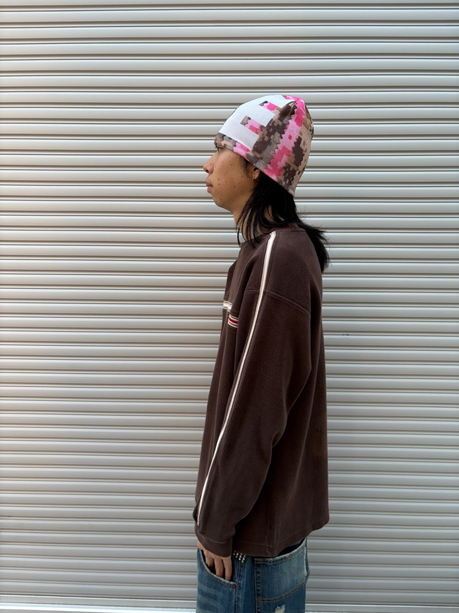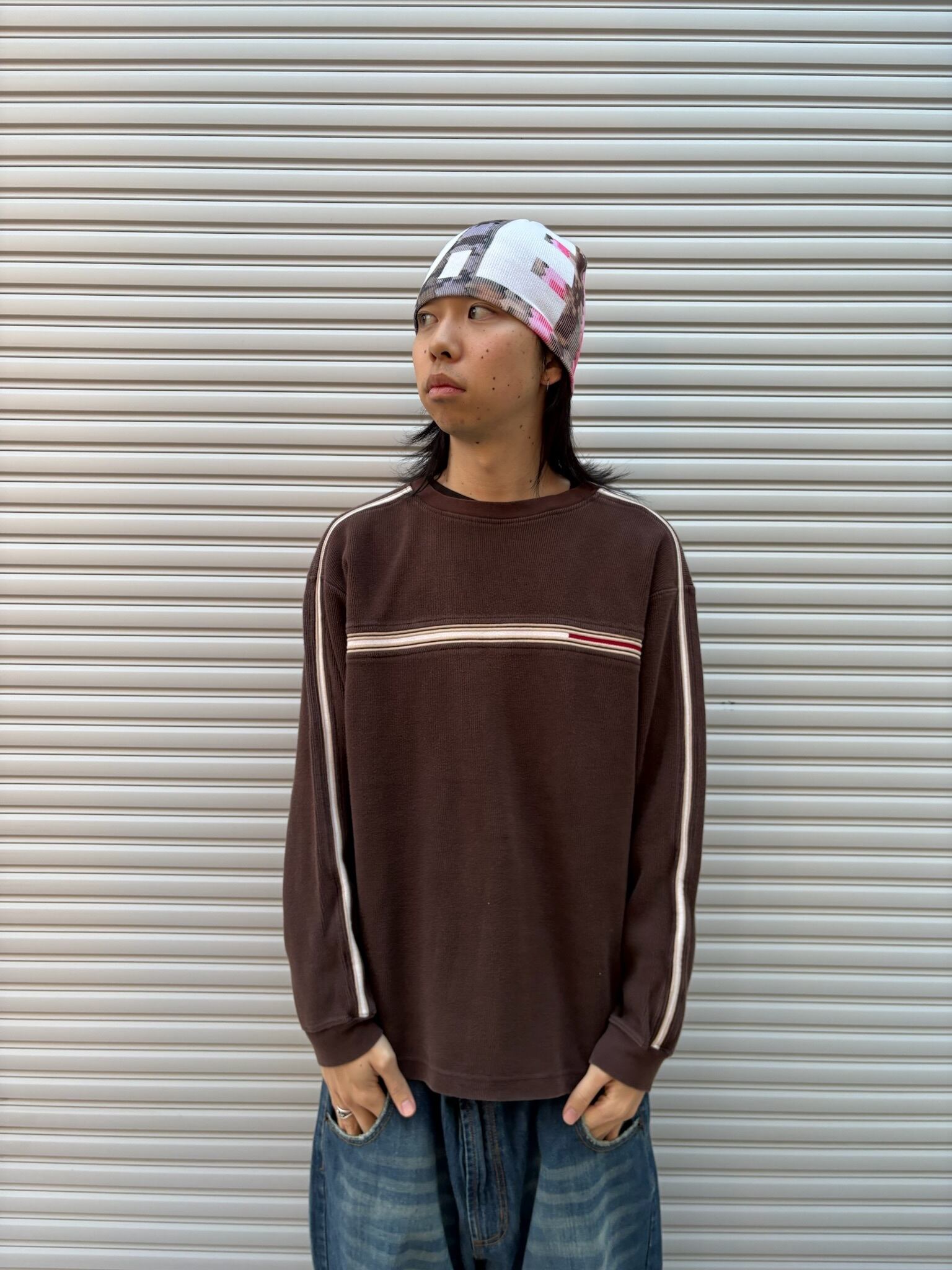 みんな大好きポイントゼロのラインニット。ブラウンとホワイトというまさにY2Kな色使いと、ゆったりとしたボックスシルエット、雑に着てもしっかり決まる超絶使えるコットンニットです。