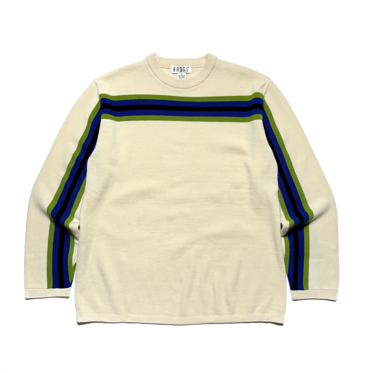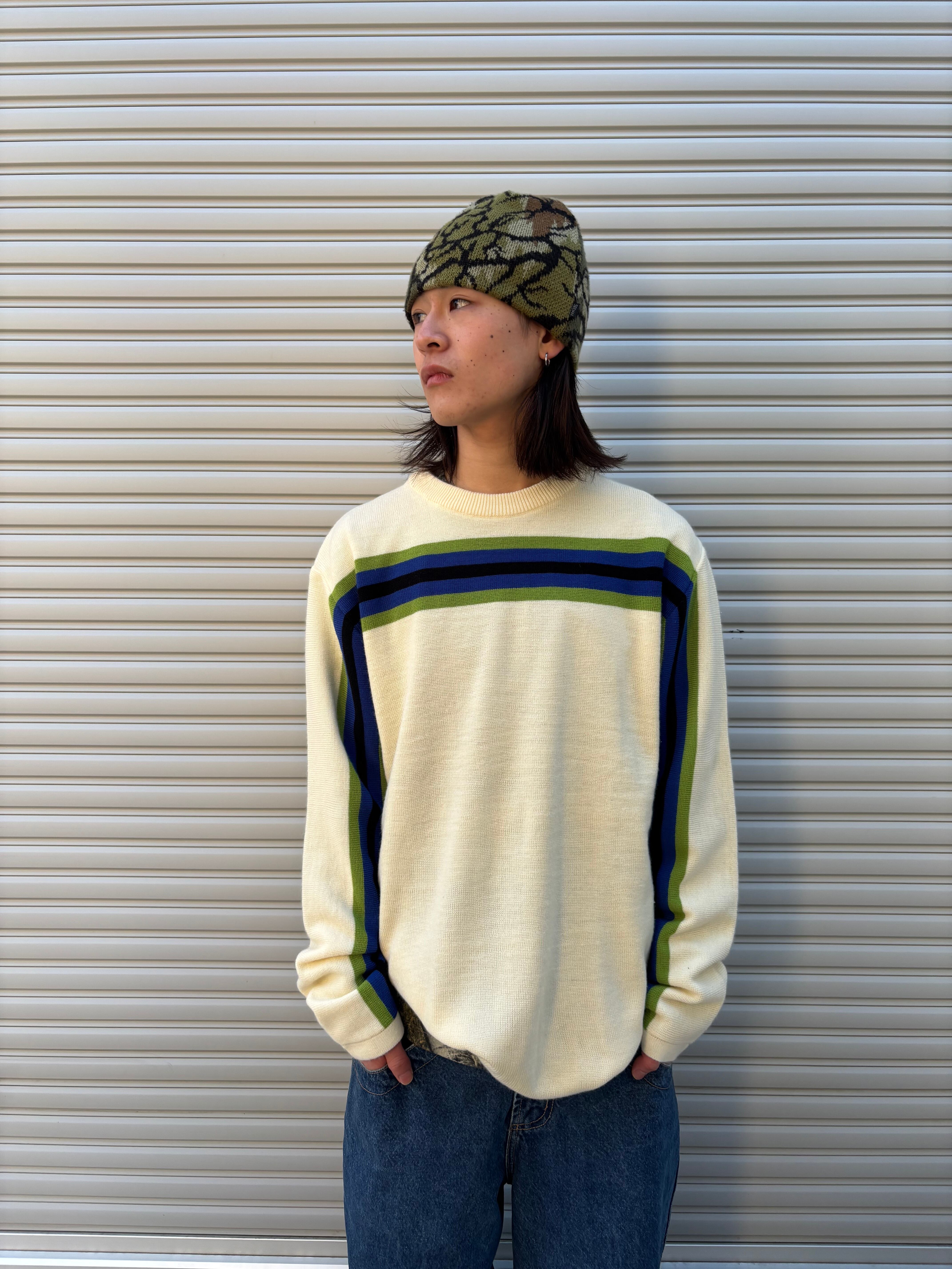 オシャレすぎるライニングのニット。柔らかなアクリルの素材感も良く、色使いも天才的。バックにもしっかりラインがあり、袖で合流してるのも個人的にアツイです。