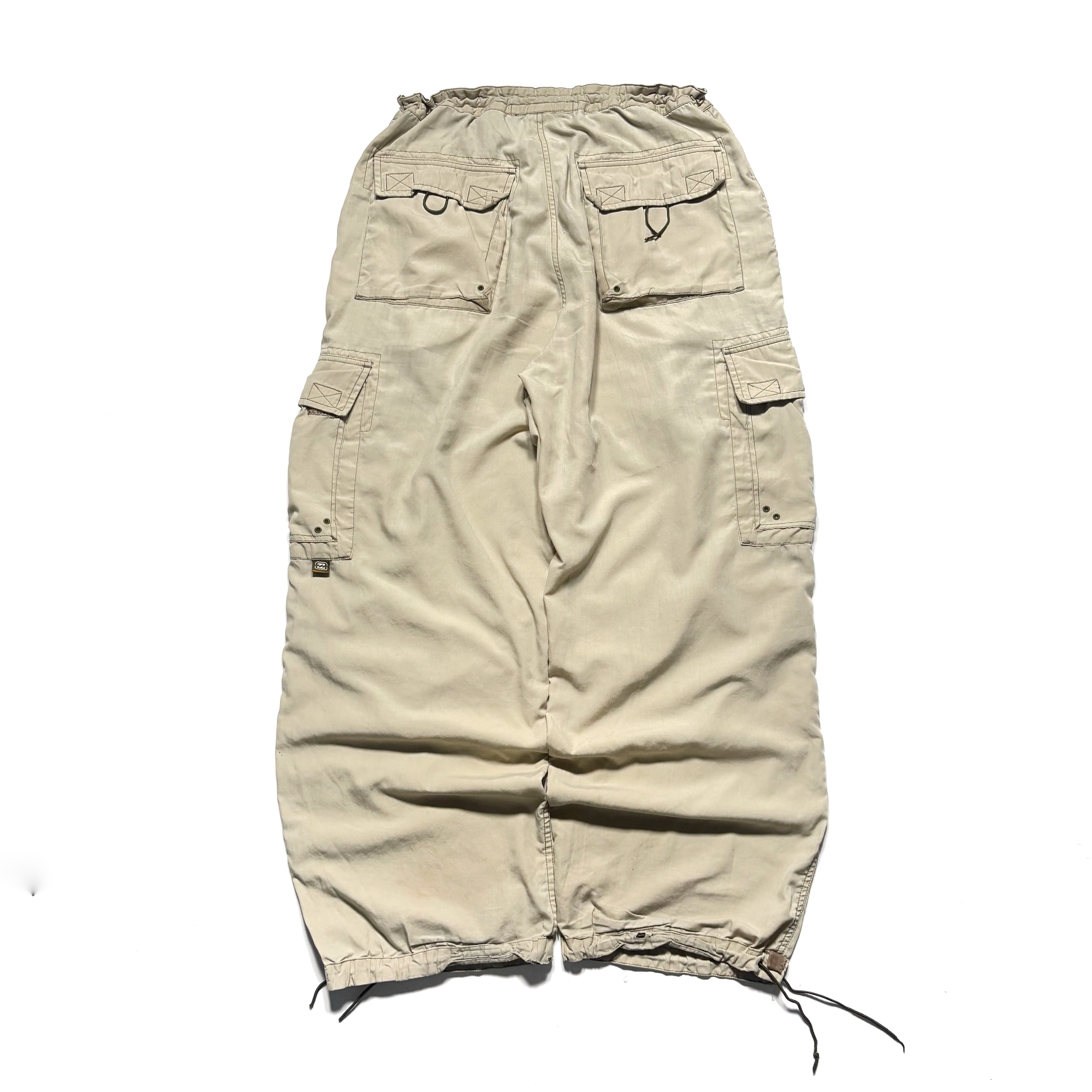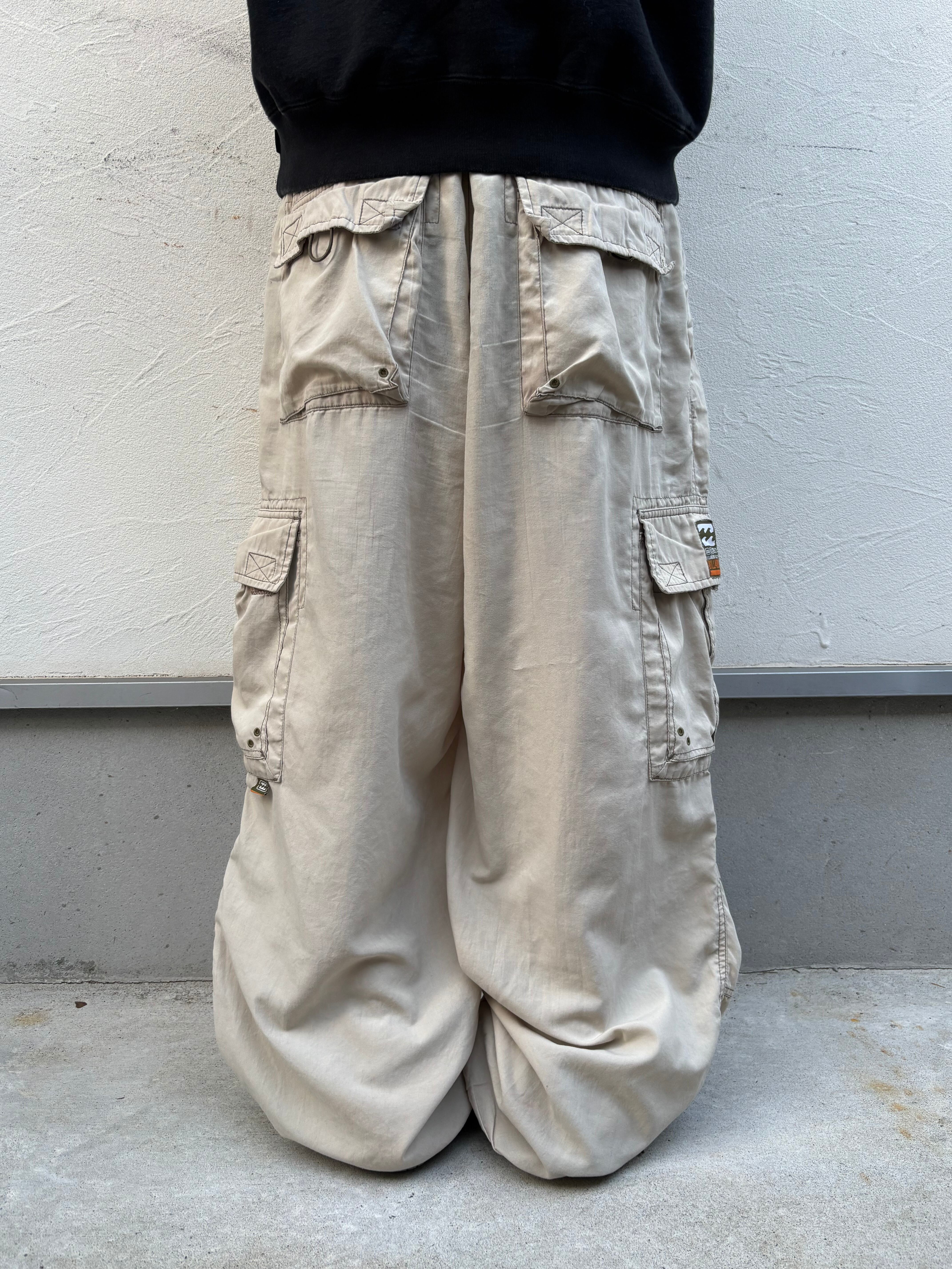 まさにあの頃のサーフブランドのカーゴという感じの作りで、サラサラの生地感にイケすぎているロゴ、らしさしかない砂浜のような色味のボディにしっかりバギーなシルエット。サラッとかっこいい1本です。