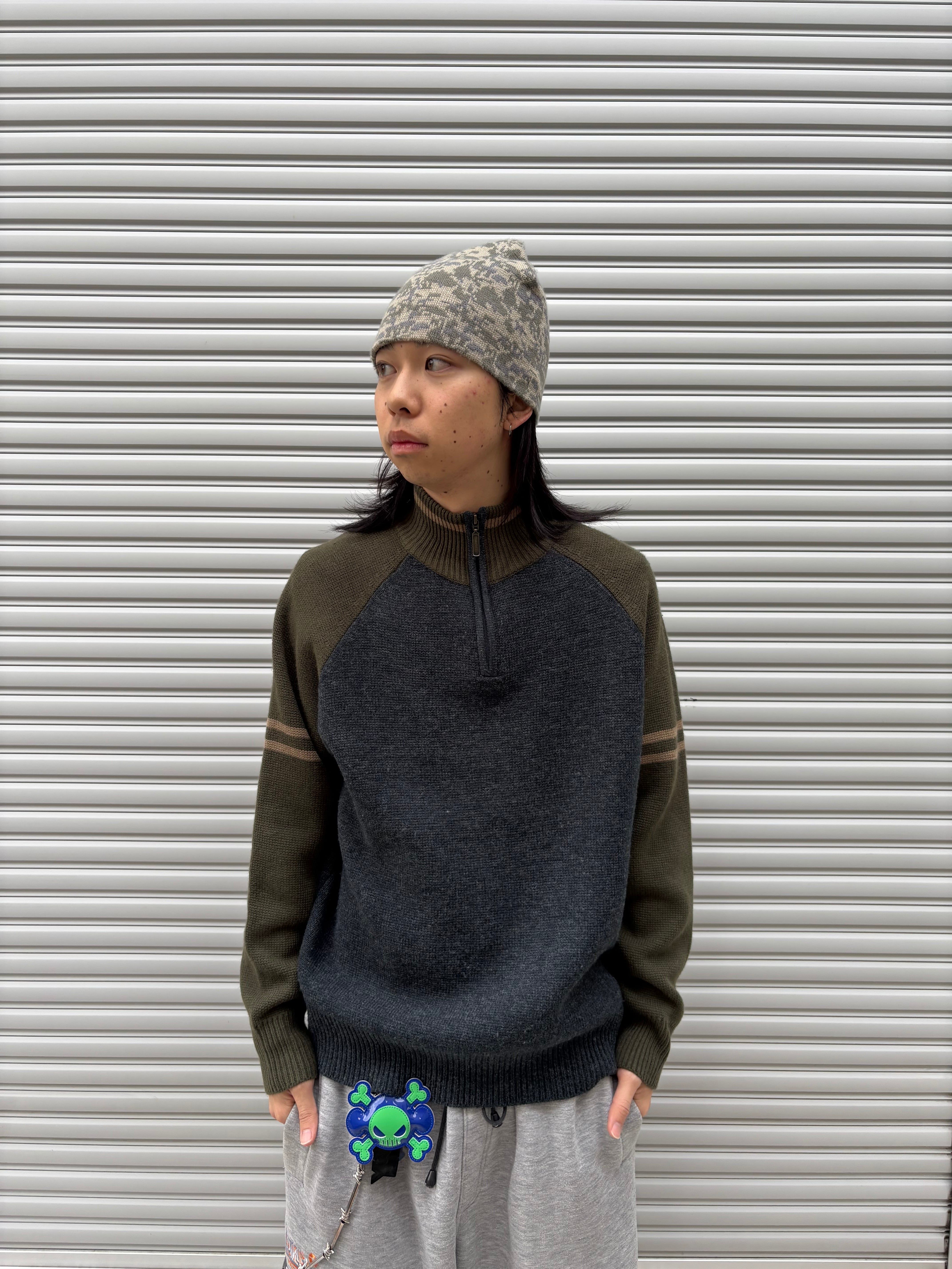可愛すぎるグリーン×ネイビーのツートンにハーフジップという更なる可愛さの上乗せで限界突破しそうなニット。サイズ感もM-Lくらいで誰でもゆるっと着られるありがたいサイジング。ジップ開けても閉めても楽しめる最高の1枚。