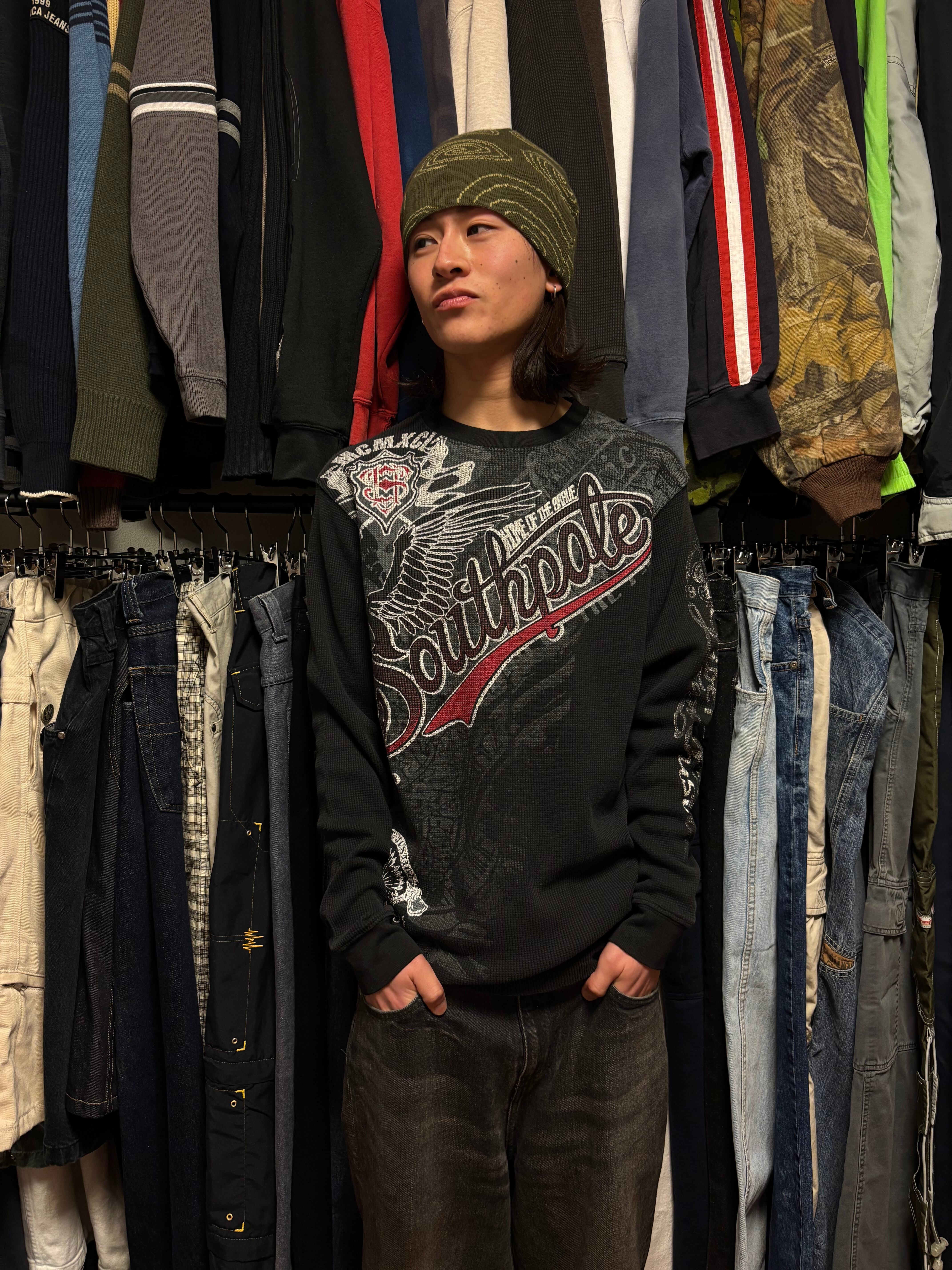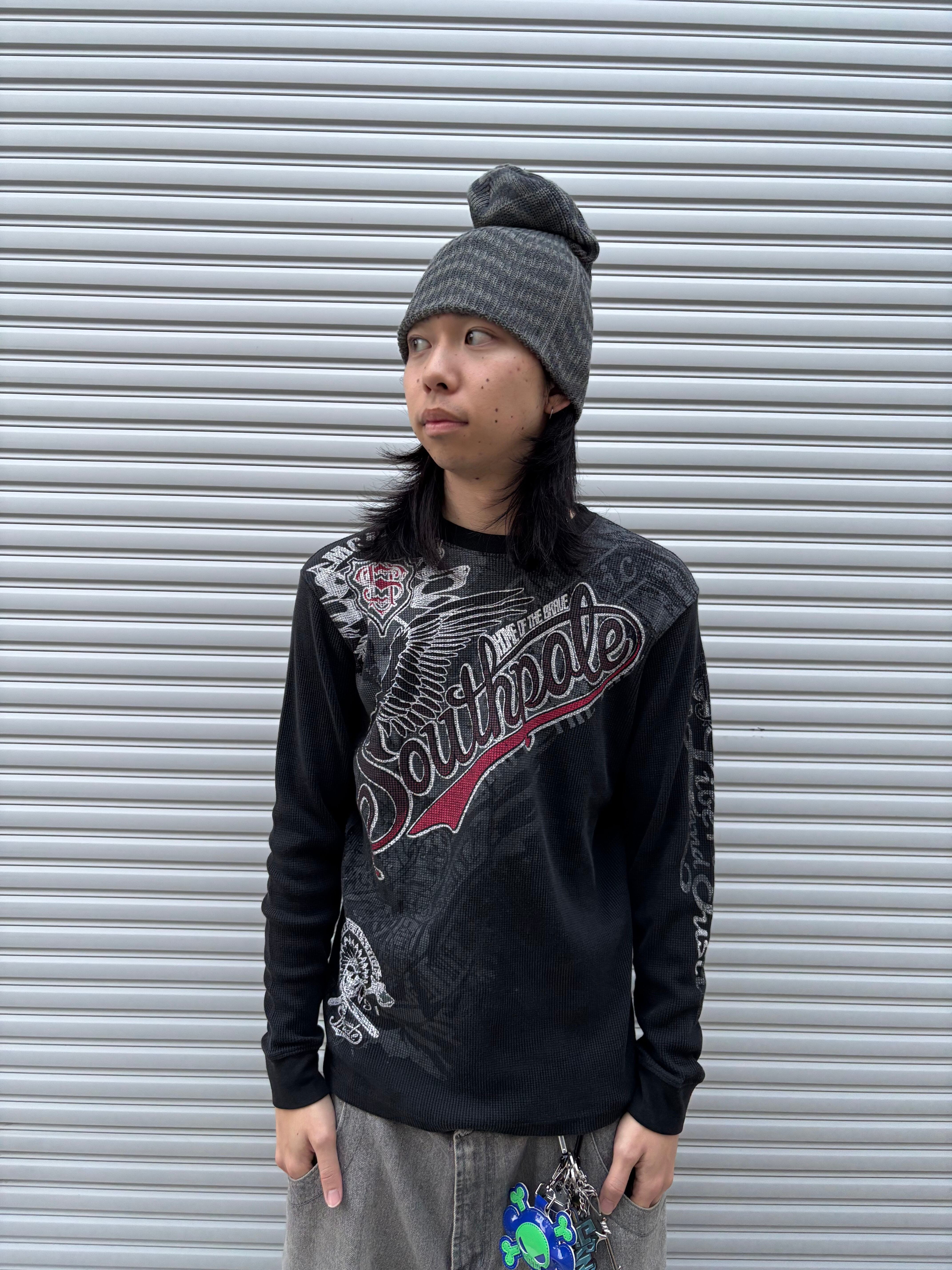 スワッグプリントかつブラックベースのボディで超Y2Kなサウスポールのサーマル。腕周りがピタッとしてて来た時にさらにかっこよくなる1枚。インナーしては勿体ないくらいのデザインですがどこでも輝いてくれる最高の1枚です。