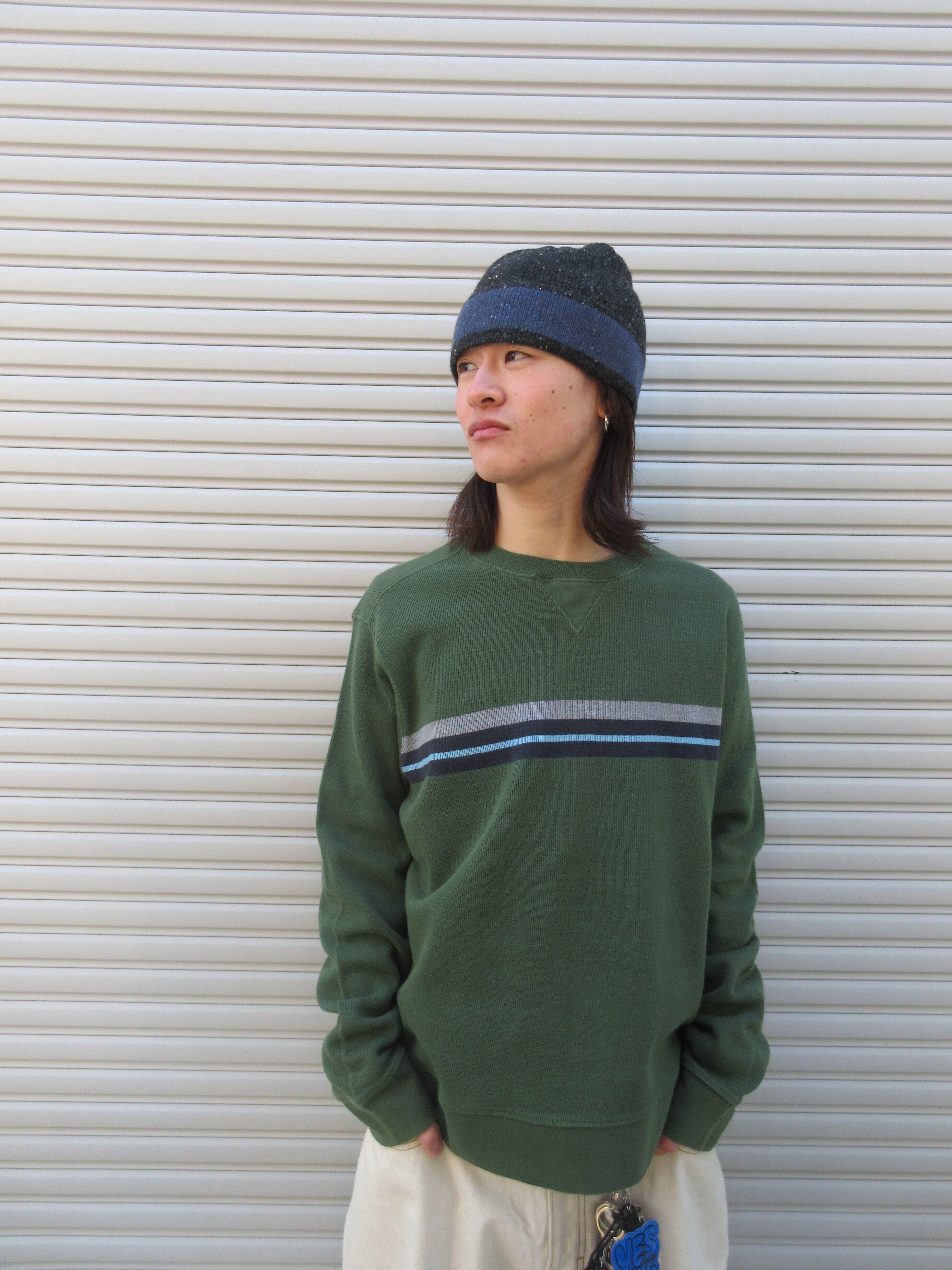 表記XLとは思えない超絶短丈のシルエットに鬼の身幅、そして落ち着いたグリーンの色味とそれに添えられたラインが可愛すぎる1枚。濃いめのデニムと合わせて着たらもうオシャレです。