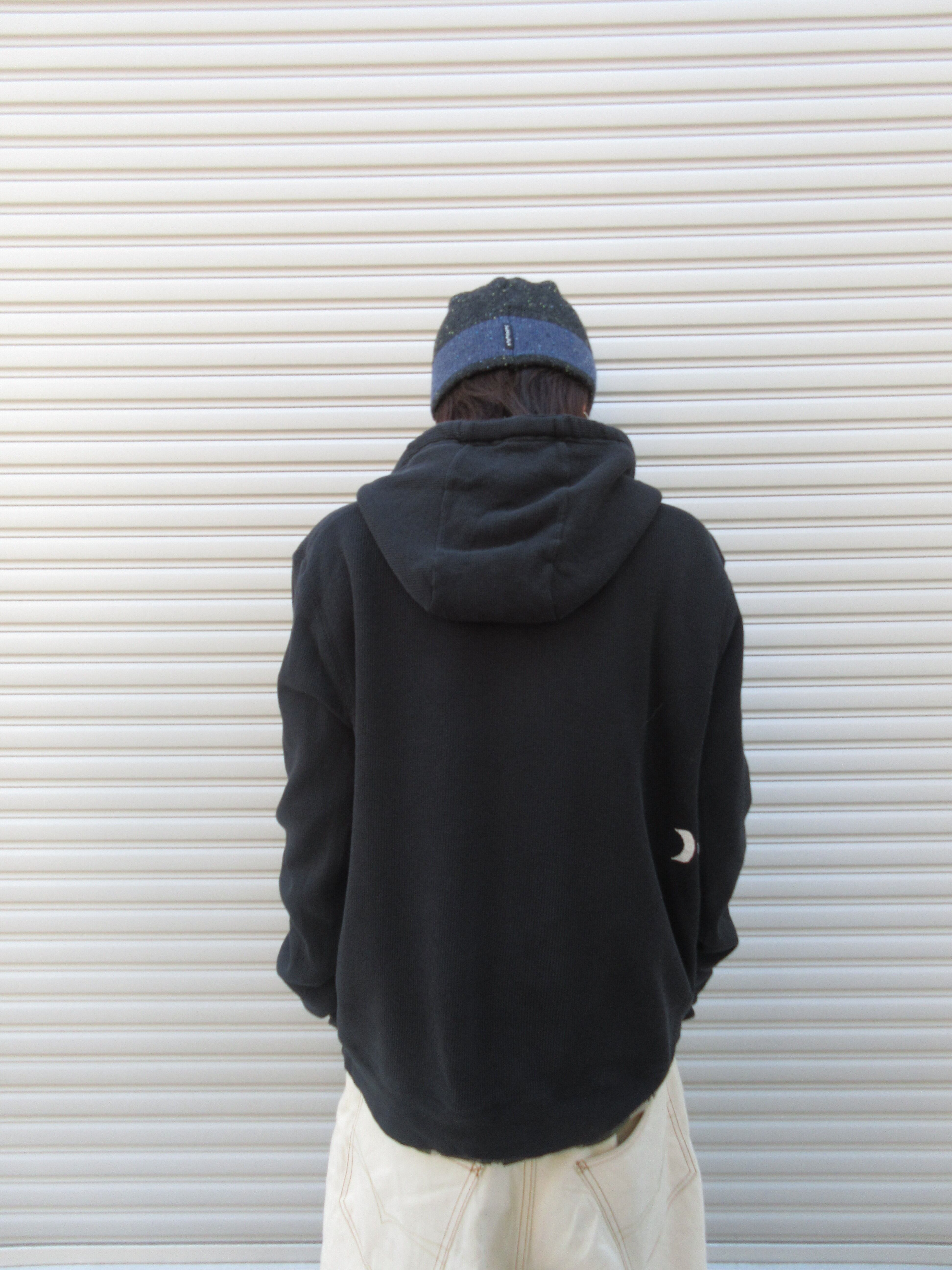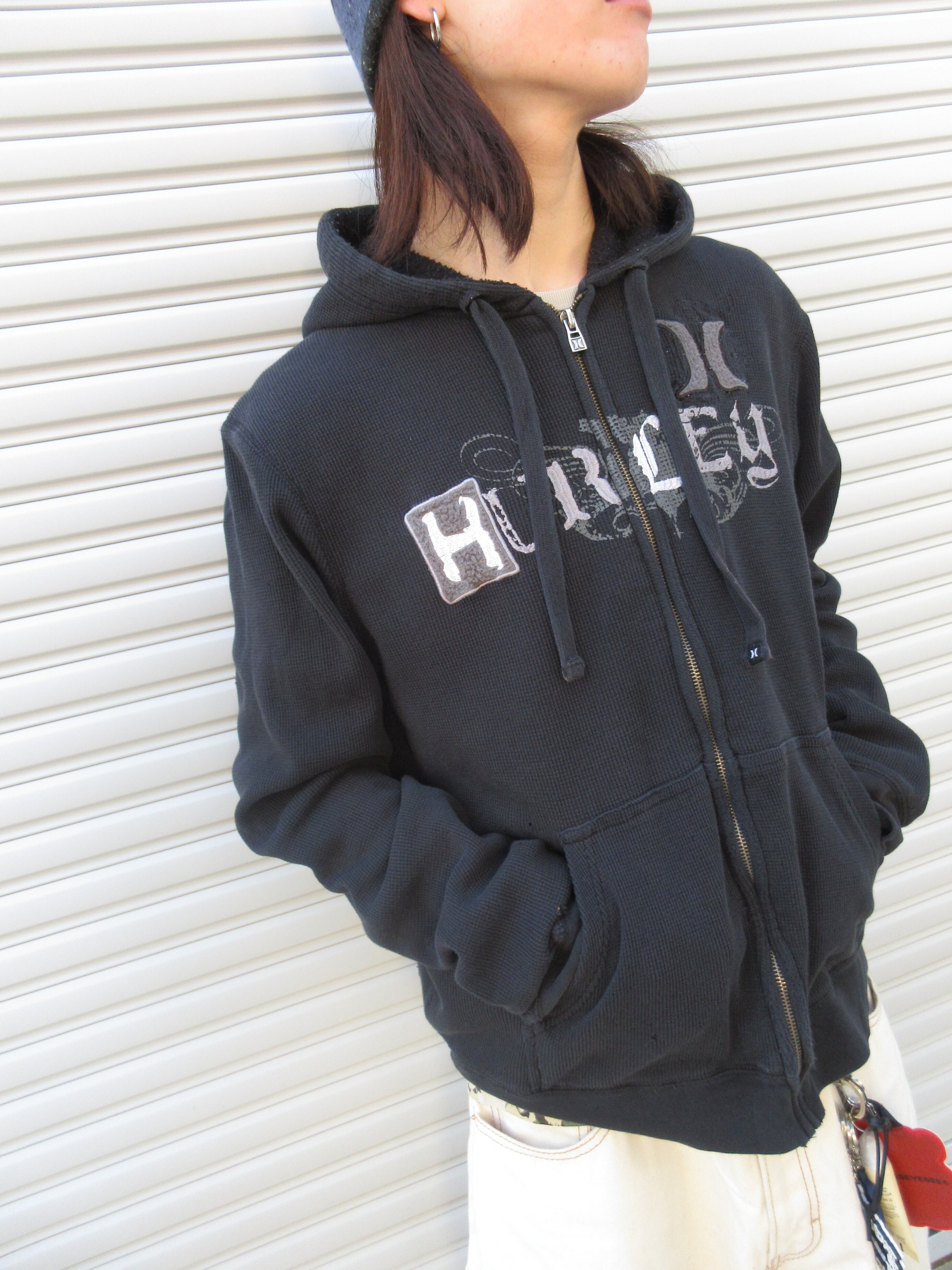 胴部分は裏ボア、袖はサーマル一枚仕立ての変わった作りのHURLEYのジップフーディ。ブラックベースに映えるY2K感満載のロゴ、サイズ感も超絶ボックスで使いやすさ満載。さすがのクオリティの1枚です。