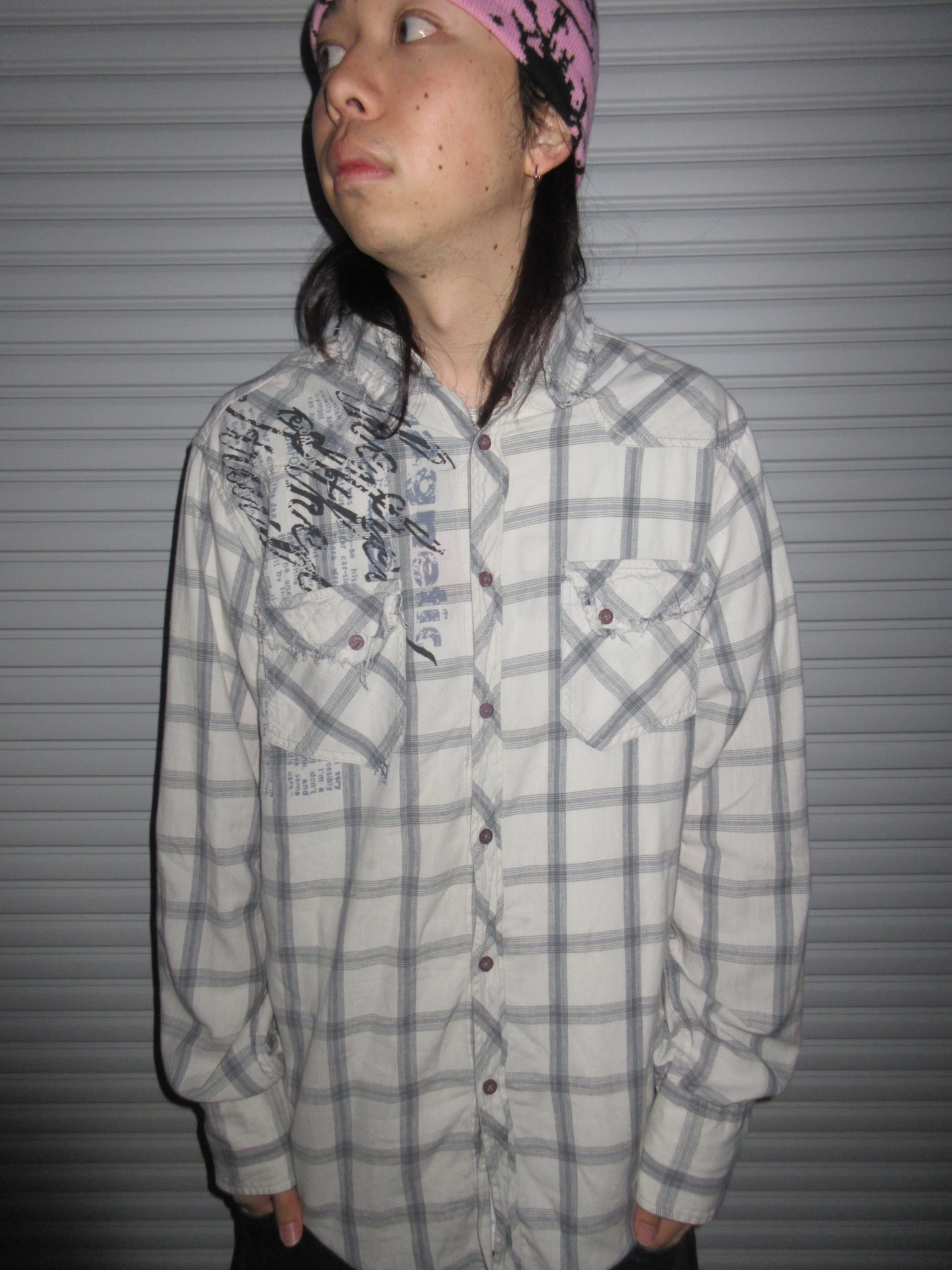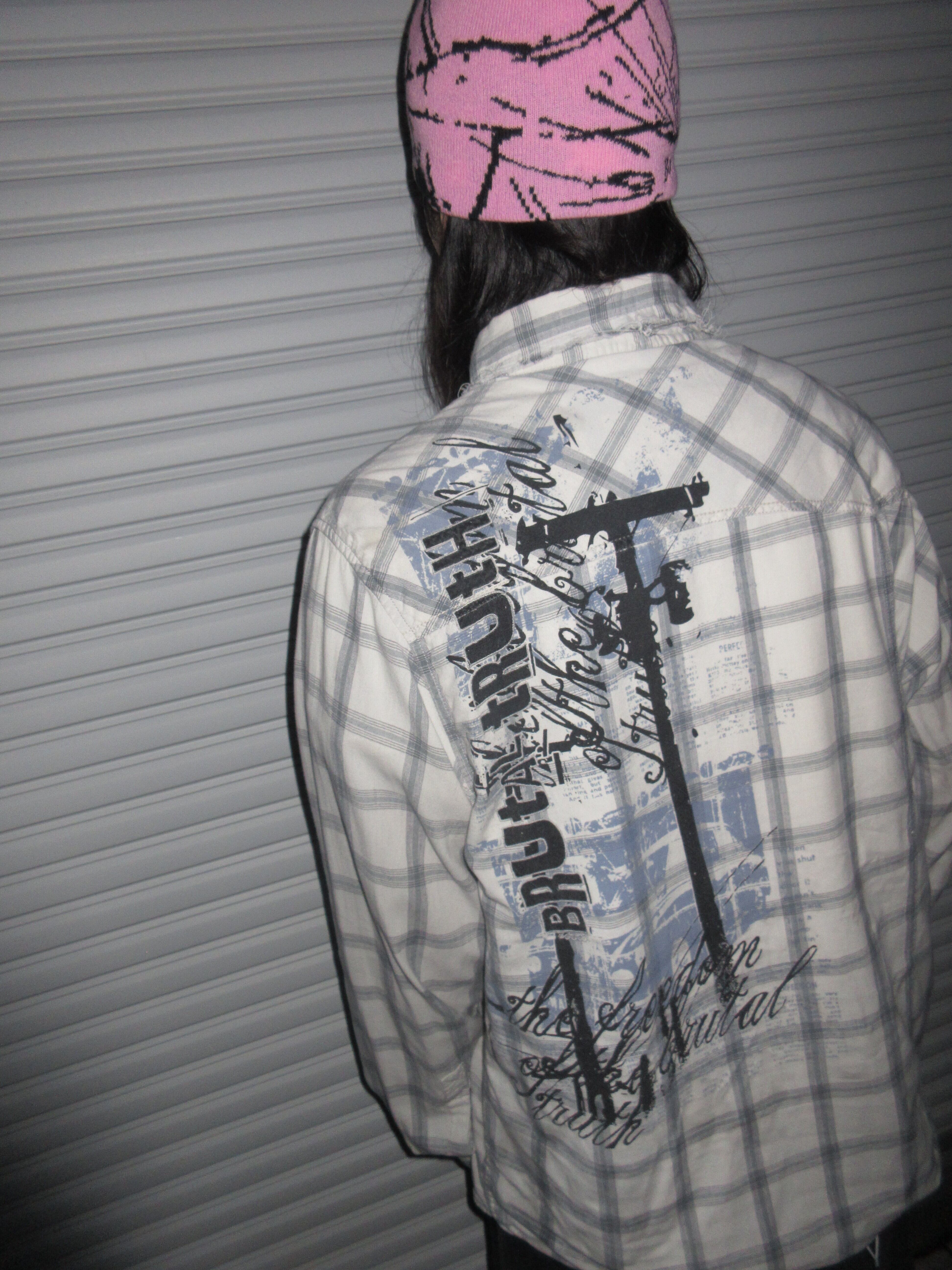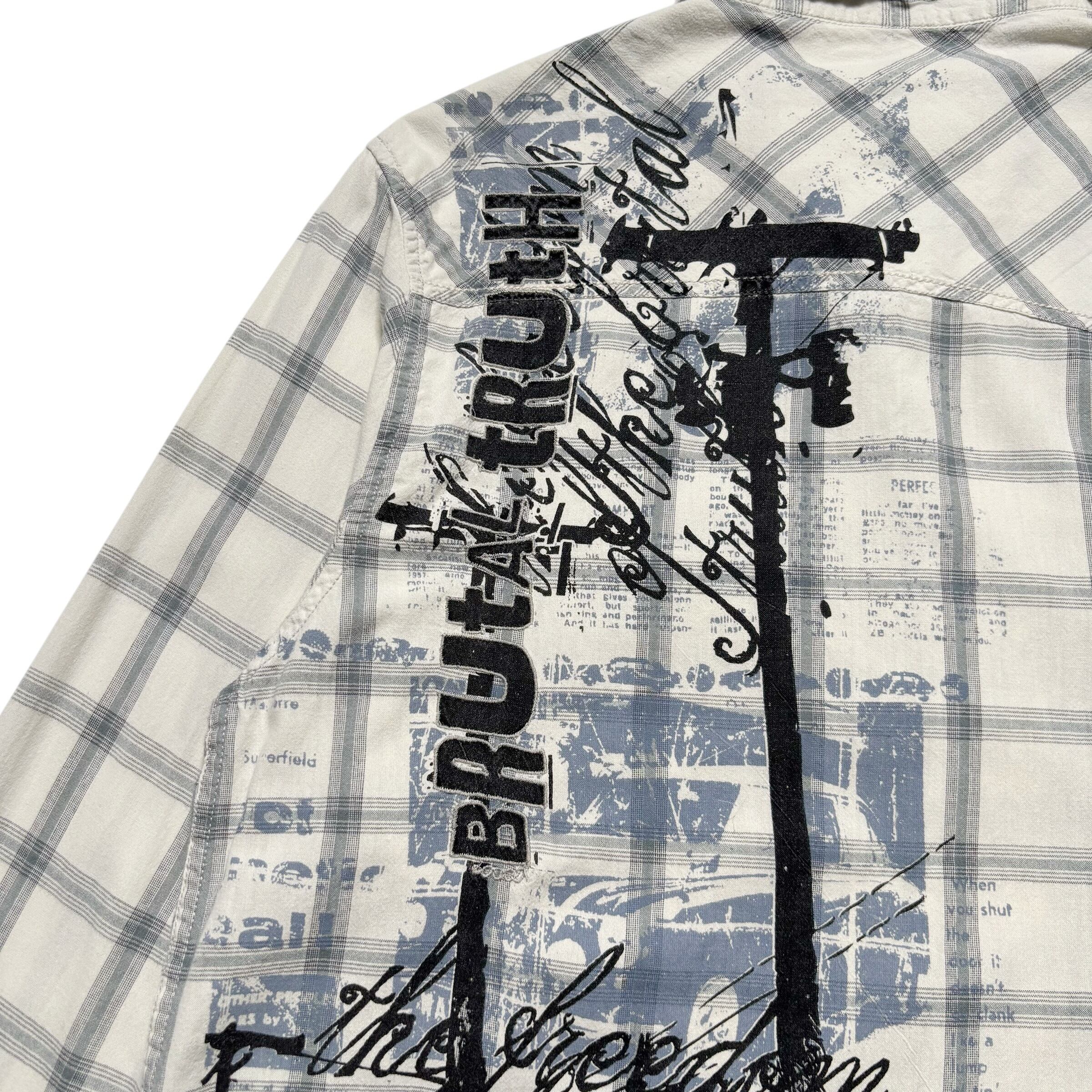 Y2K全開のプリントとボディのチェックの相性が抜群なシャツ。サイズ感もよく、白ベースなので合わせやすさもバツグン、濃紺デニムと合わせて着たいです。