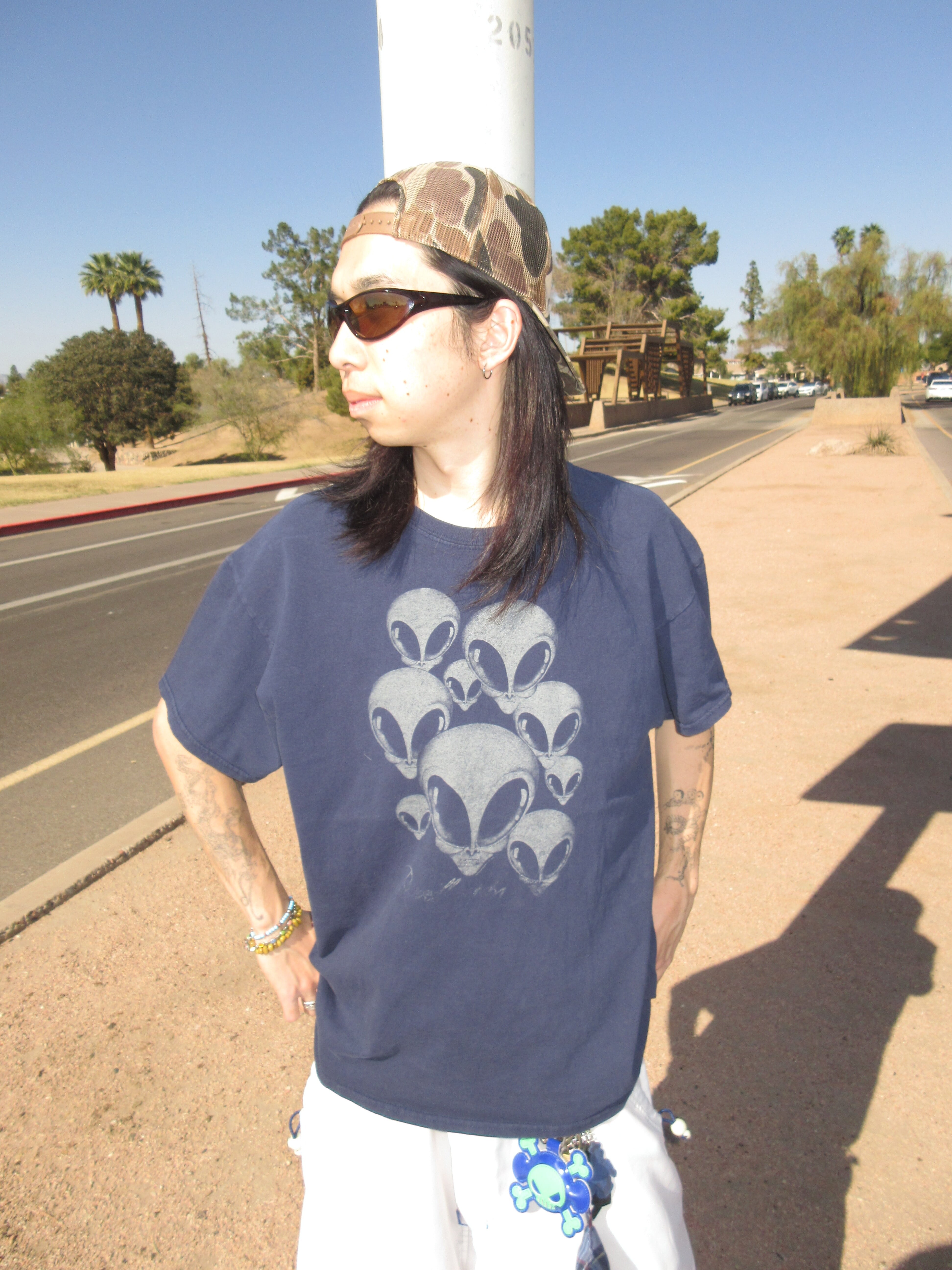 気球のようにわらわらと浮かんだエイリアン達が可愛くもあり奇妙でもあるグッドグラフィックなTee。軽くフェードしたネイビーボディも雰囲気に合っていて最高。サイズ感も文句なしです。